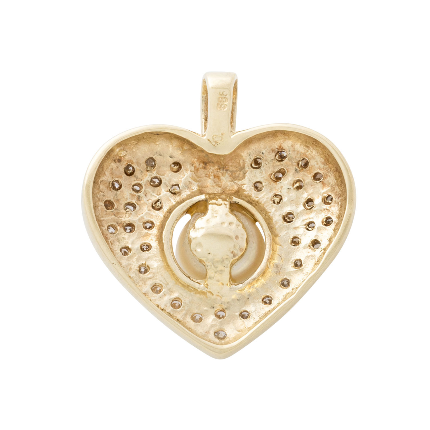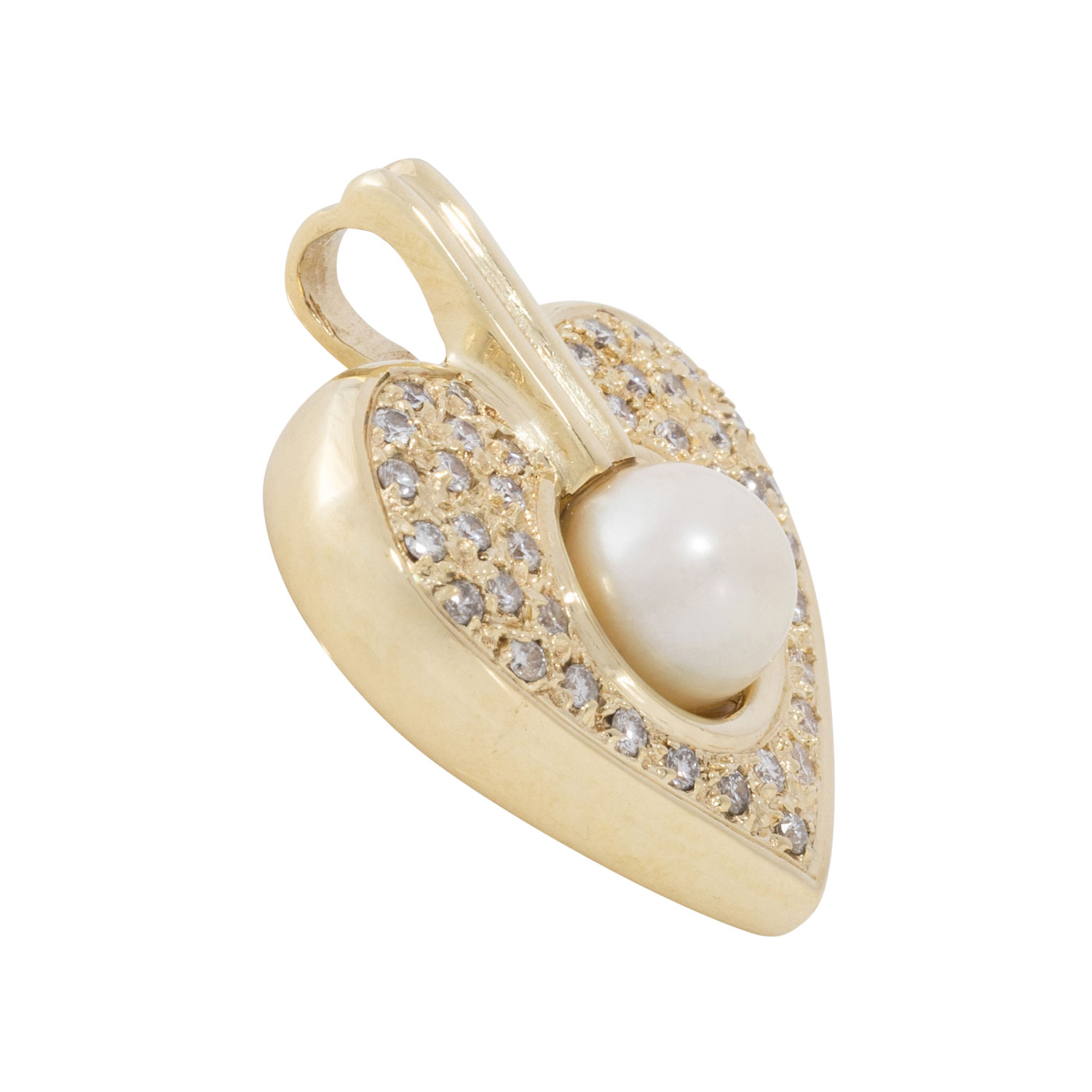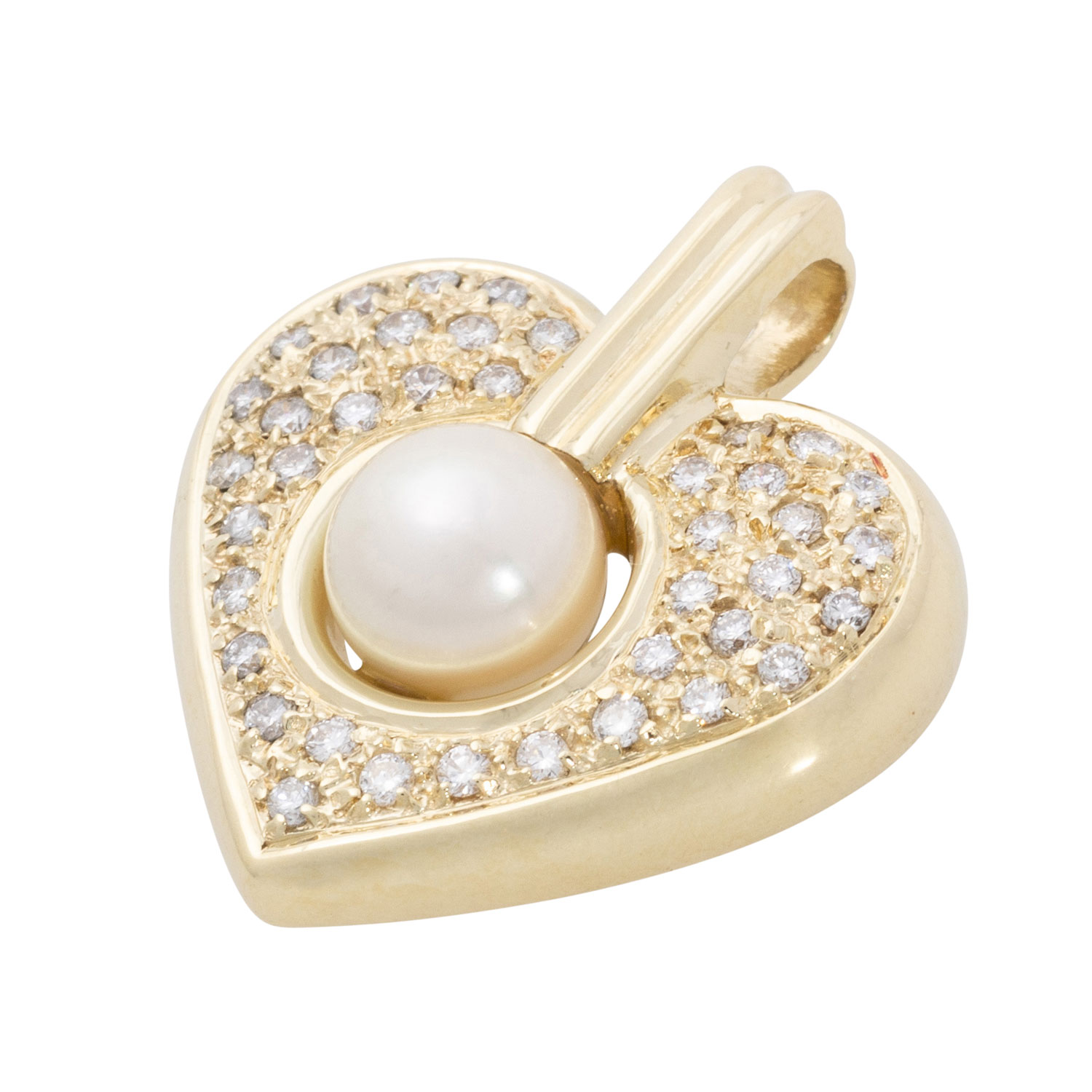 Heart pendant with brilliant-cut diamonds, totall. ca. 0.40 ct, good colour and clarity, cultured akoya pearl ca. 7 mm, L: ca. 2.5 cm, 18K yellow gold, 7 g, late 20th century, minimal signs of wear.