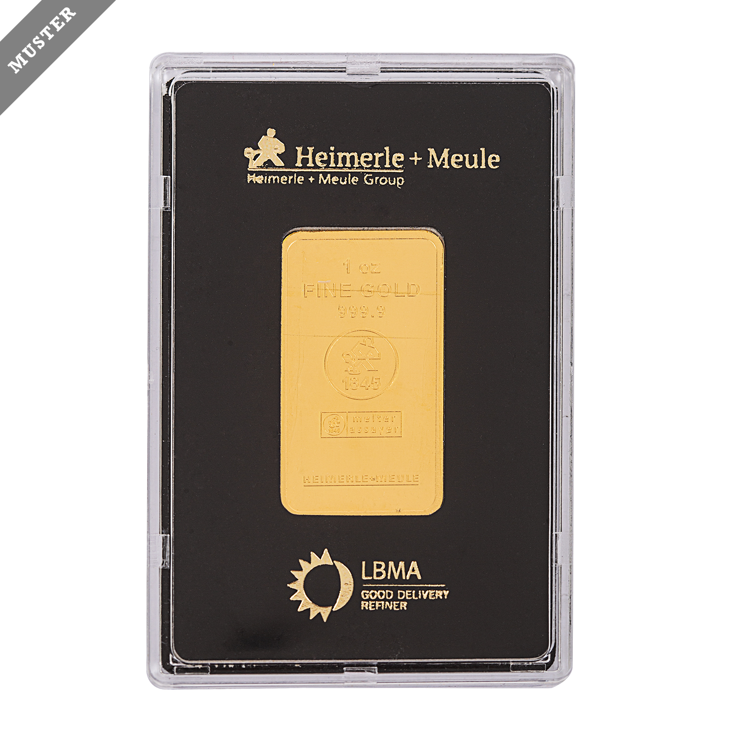 Gold bar – 1oz Gold fine gold, embossed gold bar, manufactured by Heimerle+Meule,