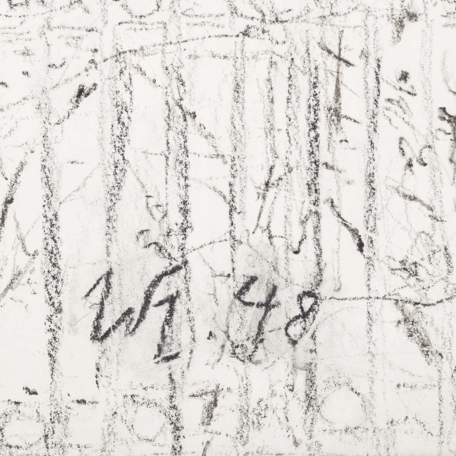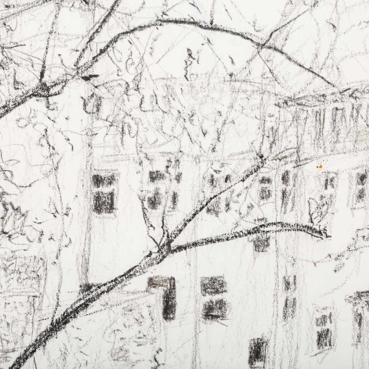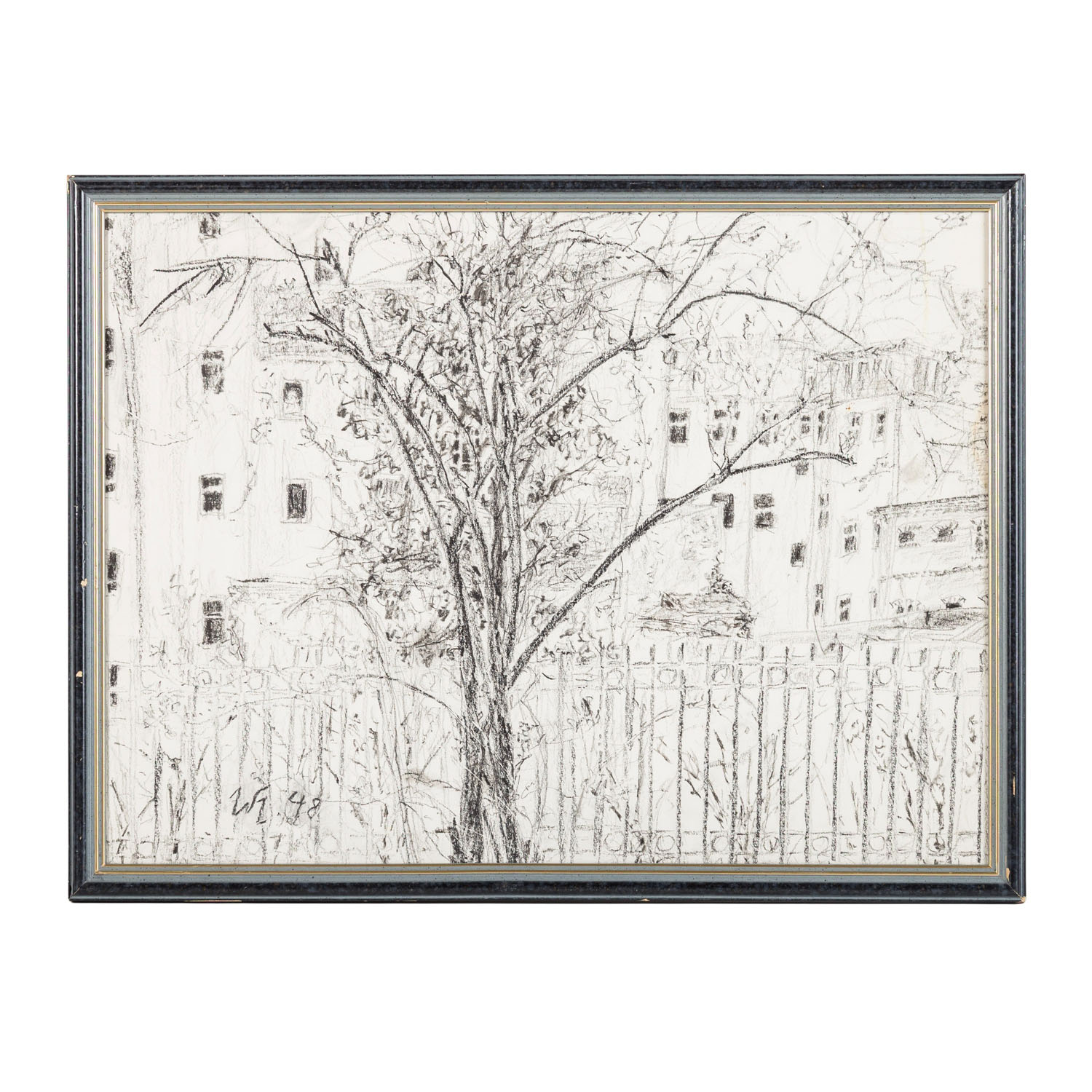 HELDT, Werner, ATTRIBUTED (W. H.: 1904-1954), ‘View of a metropolitan street’, 1948. in the foreground bushes at a fence, monogrammed and dated lower left, charcoal drawing/paper, HxW: approx. 38x51 cm (42x55 cm with frame). Signs of age, slightly browned and stains on the right edge. With glazed frame.