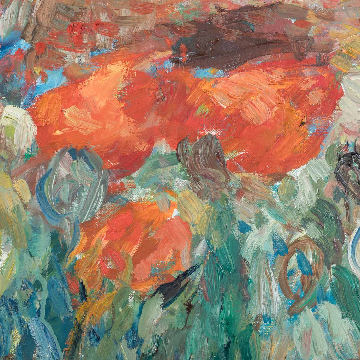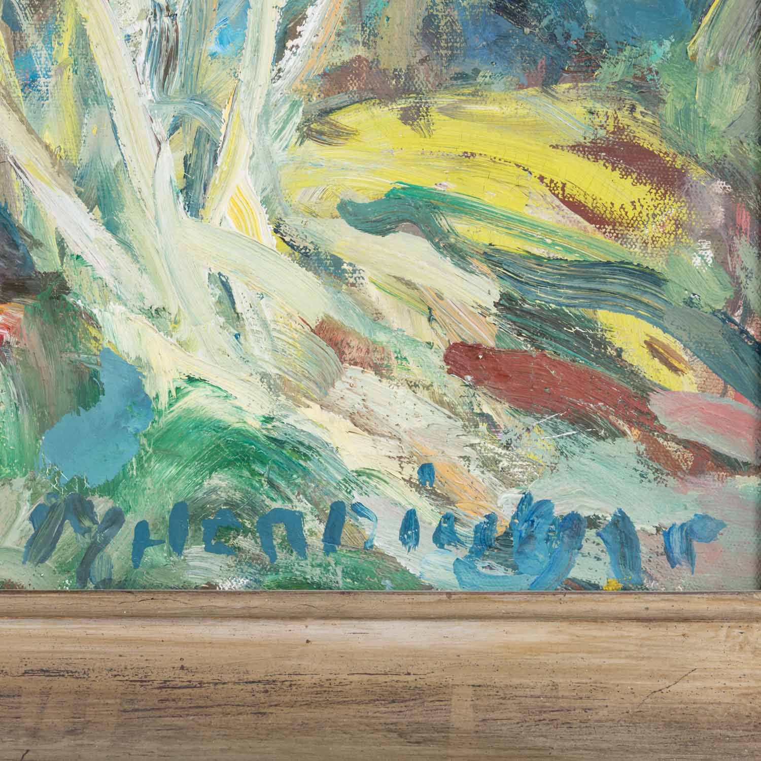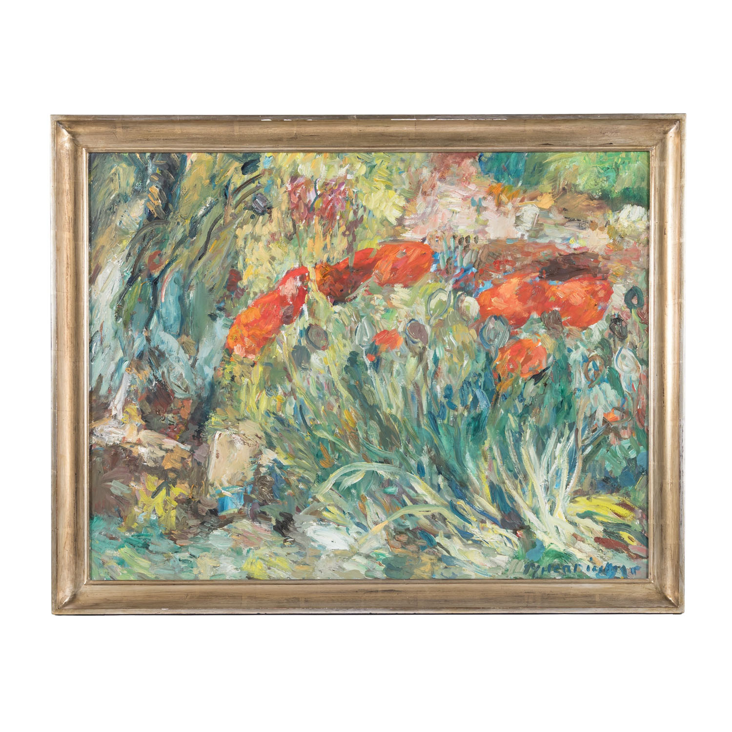 HENNINGER, MANFRED (1894-1986, Prof.), 'Red flowers in a garden landscape', signed lower right, oil/canvas, HxW: approx. 65x85 cm (74x94 cm with frame). Slight signs of age and wear. With handmade gallery frame (frame partially damaged at the edges). VERSO no. 7817.