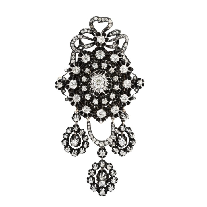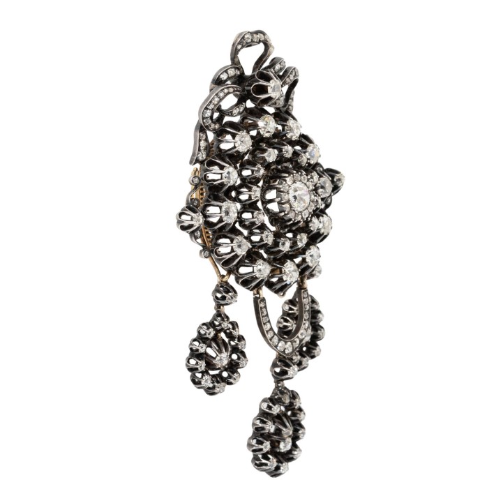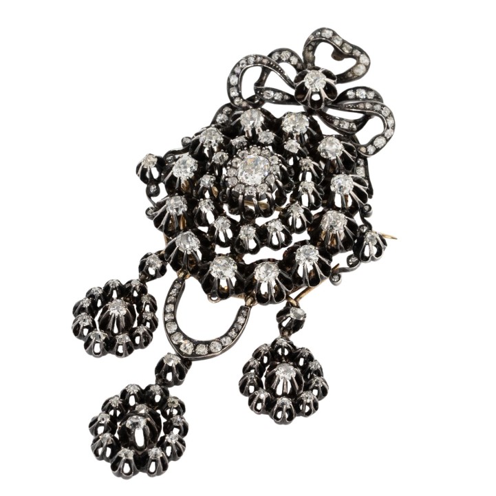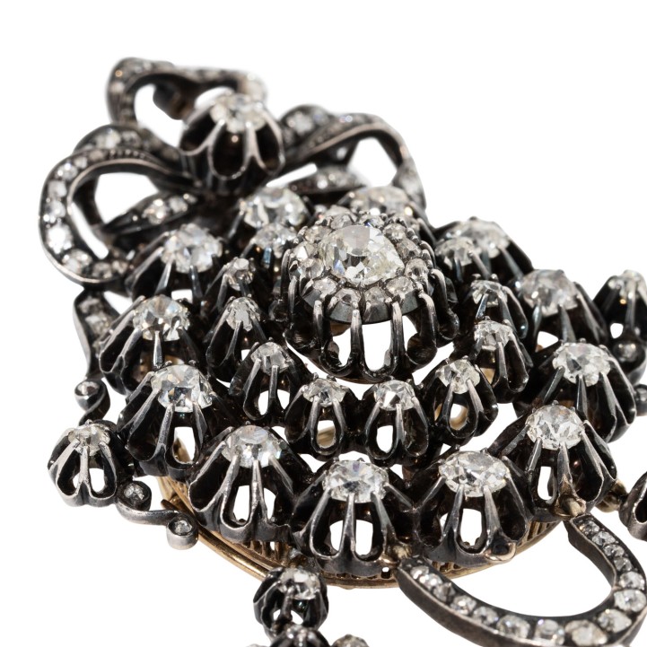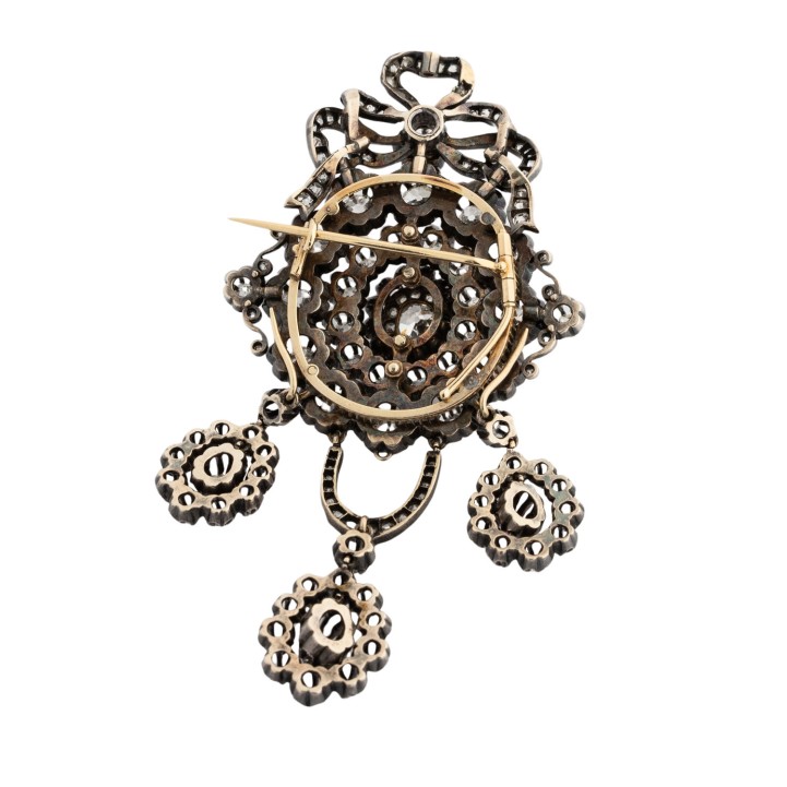 Outstanding brooch with 148 diamonds totalling approx. 7 ct, in old-european- and rose-cut, central diamond approx. 0.70 ct, WHITE-TIW (H-K)/SI-P, silver/yellow gold 14K, L: approx. 38.7 g, L: approx. 93 mm, W: approx. 16.2 - 45.5 mm, last third of the 18th century, very good condition considering its age. Outstanding handcraft work, brooch can be removed, as well as 2 pendants (presumably originally wearable as earrings), pendants are movable, which is very typical for the time, unfortunately one pendant is missing in the middle, backside made of 14K yellow gold - protection against discoloration on skin and clothing, bow with a break in the setting, 1 stone is chipped. On the top of the backside there is another sleeve for a screw connection, probably the piece could also be worn as a pendant and was part of a parure.
