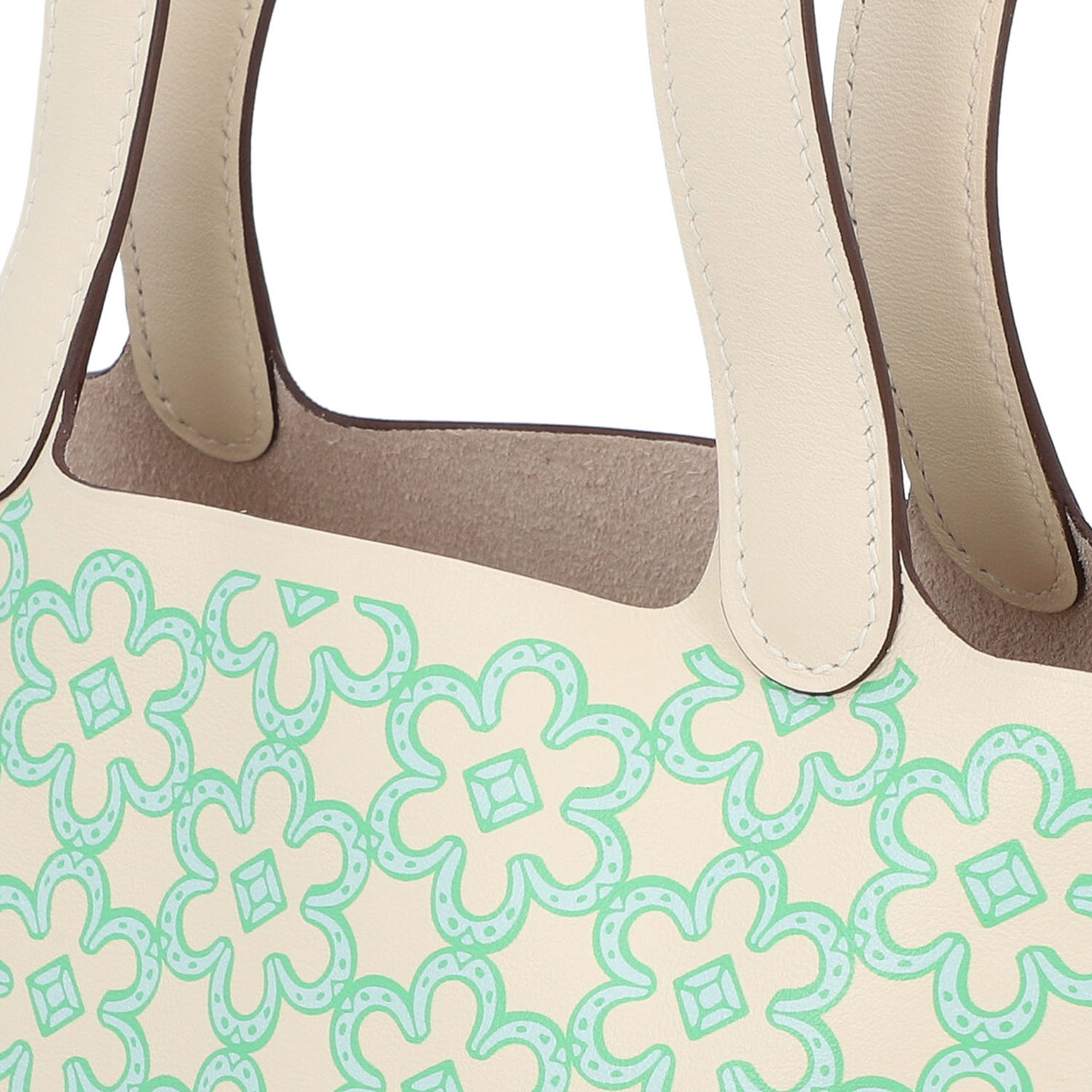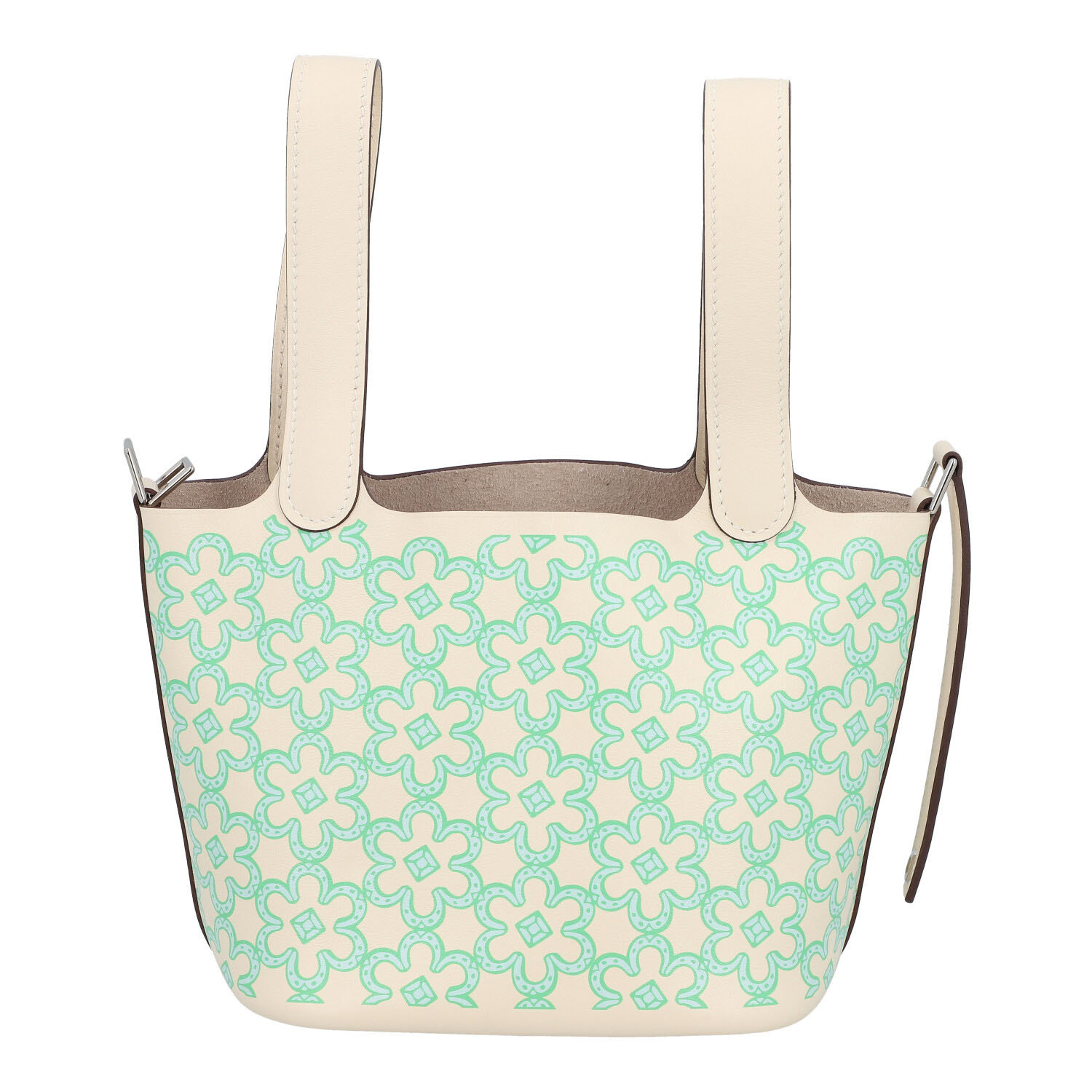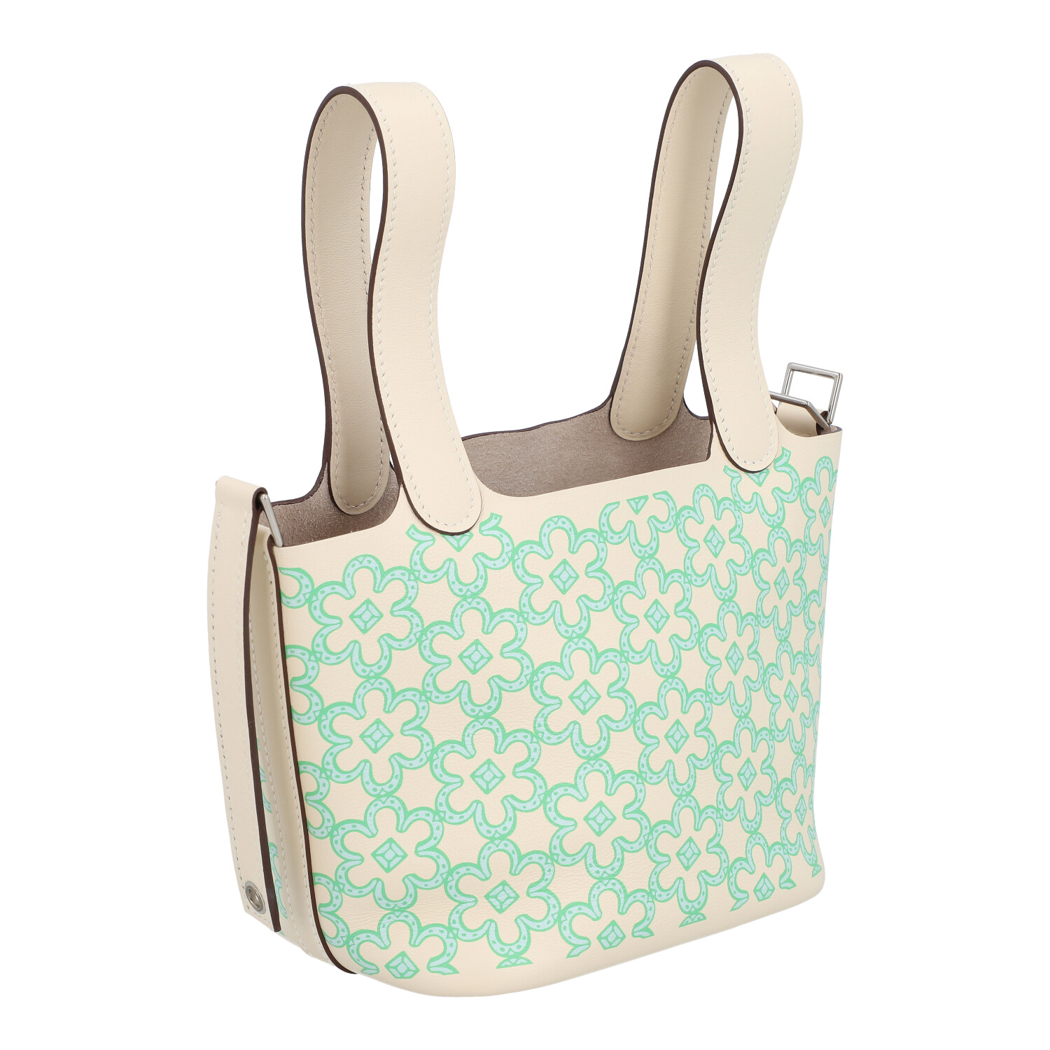 HERMÈS pouch bag ‘PICOTIN MICRO’, coll.: 2022. Happy Daisy on Swift leather in Nata, hardware with palladium plating, double handle and strap fastening. Box and dust bag enclosed. Very good condition.12 x 9 x 13 cm.