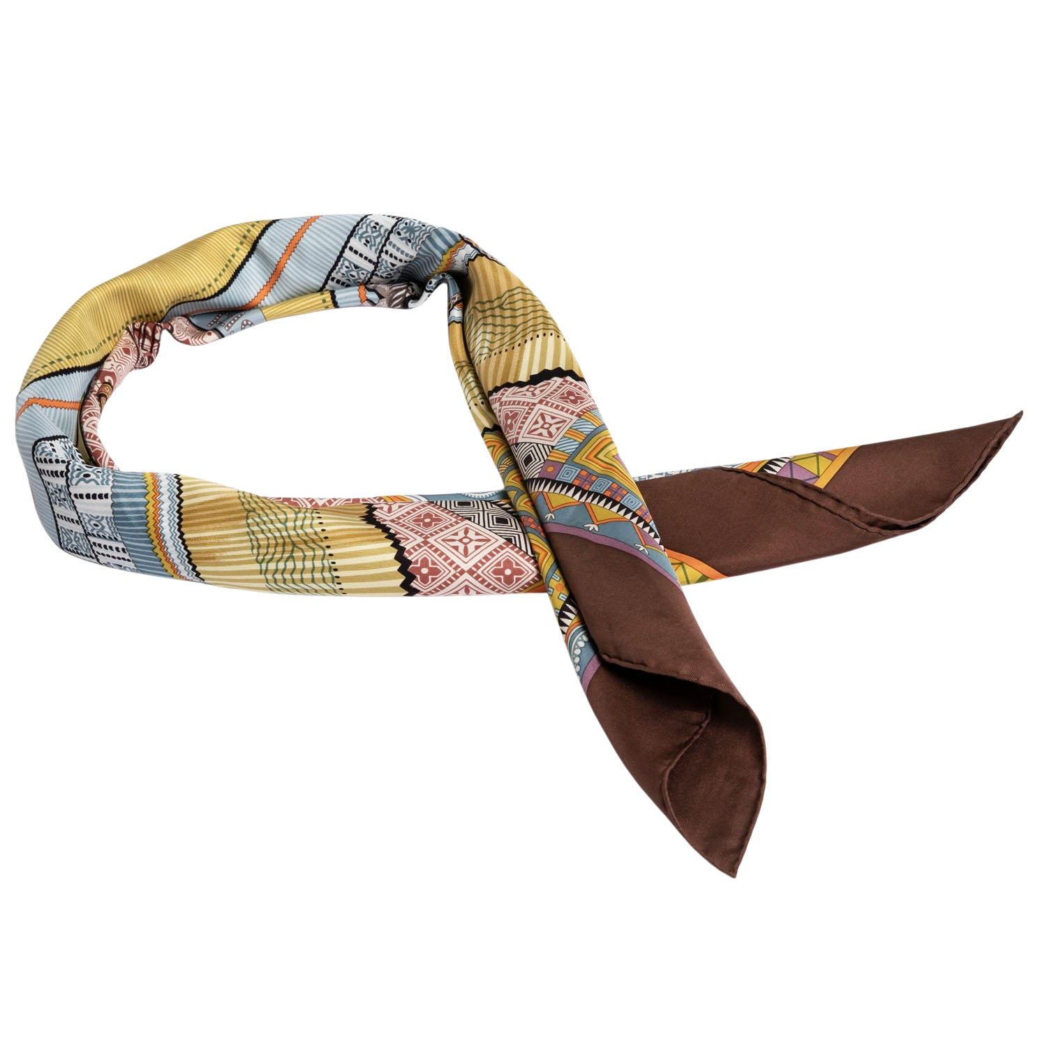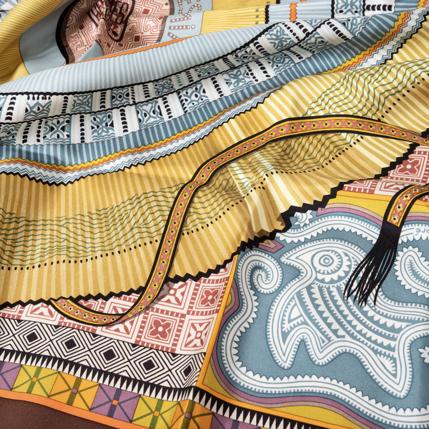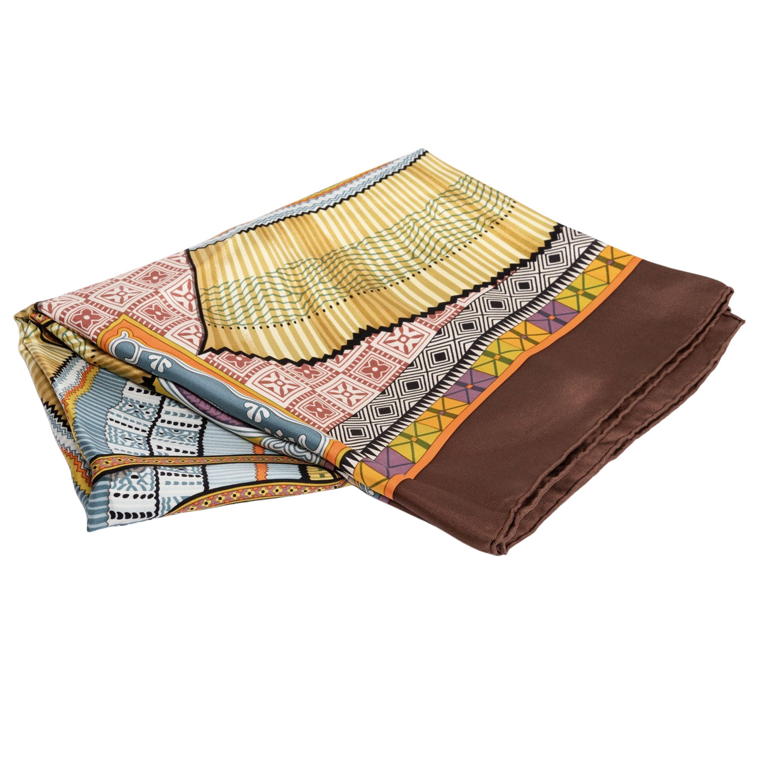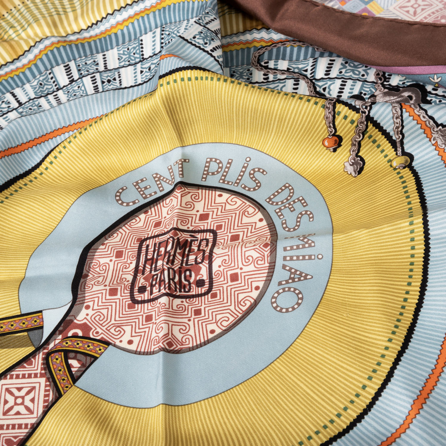 HERMÈS silk scarf 'CENT PLIS DES MIAO', by Aline Honoré, design first published in 2010. Retail price: €530. 100% silk. A skirt with a hundred pleats, a symbol of Miao culture in south-west China, features delicate patterns and silver jewellery. This piece was donated by Hermès and is now part of the collection at the Musée du Quai Branly in Paris. 90 x 90 cm. Hand-rolled hems. Stains present.