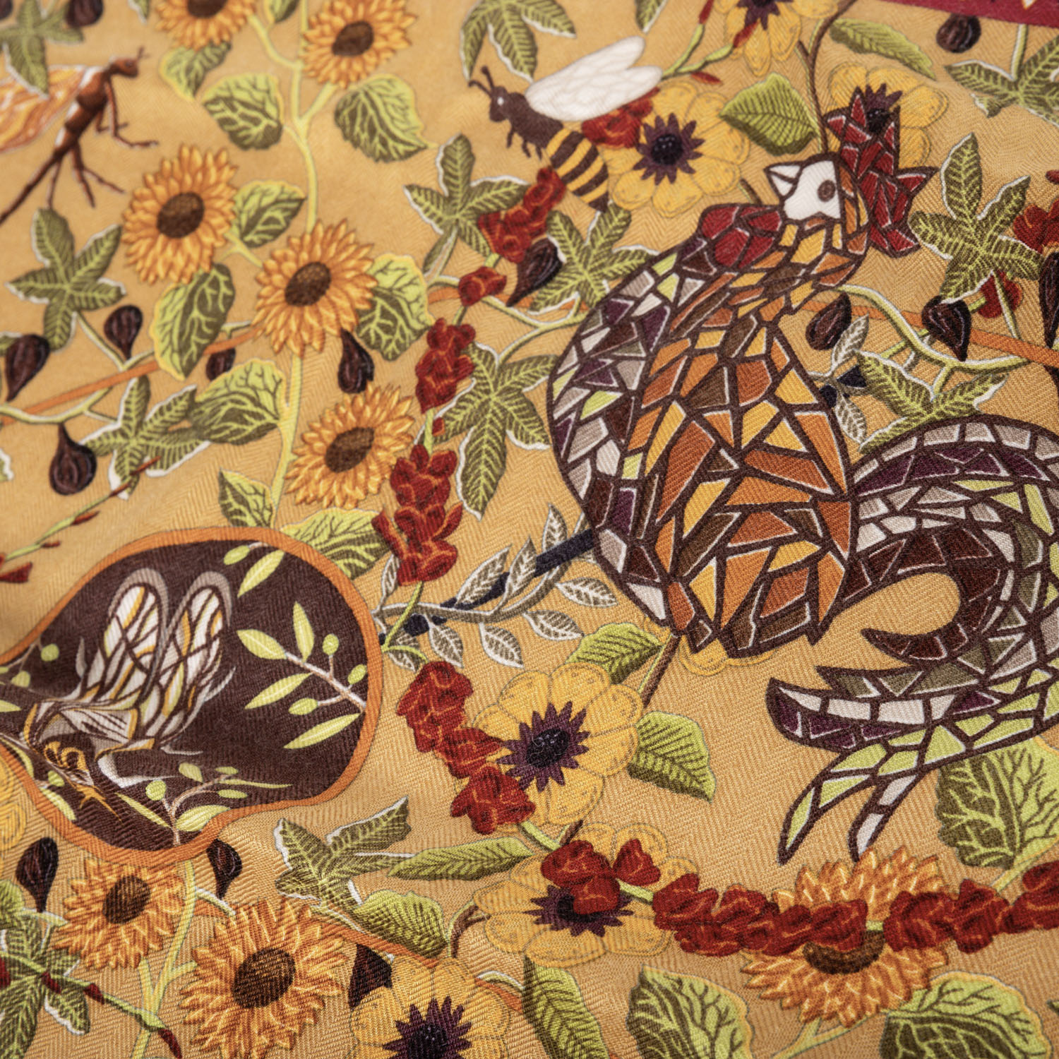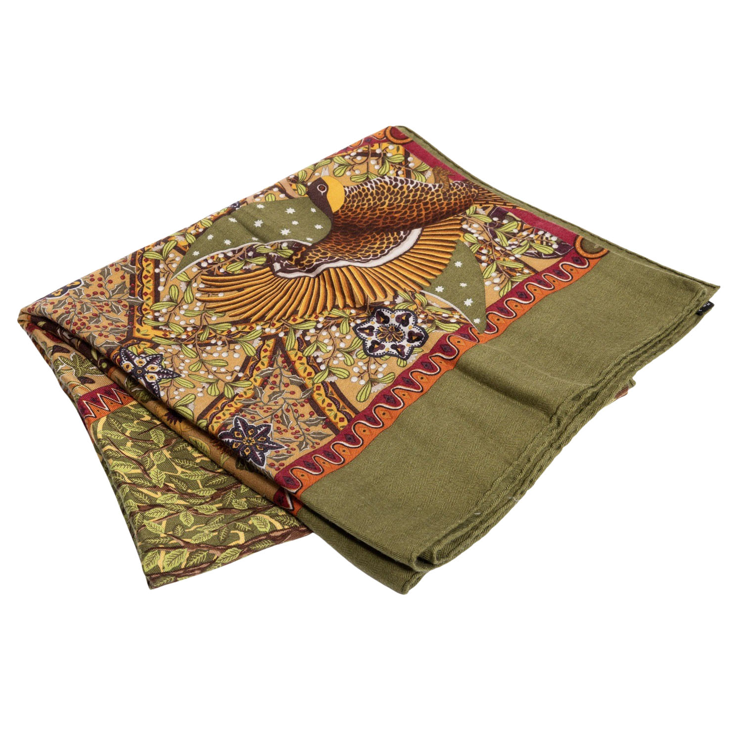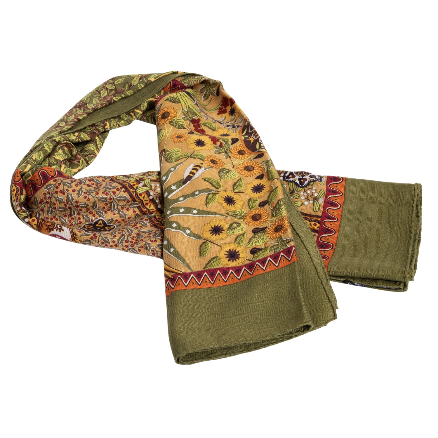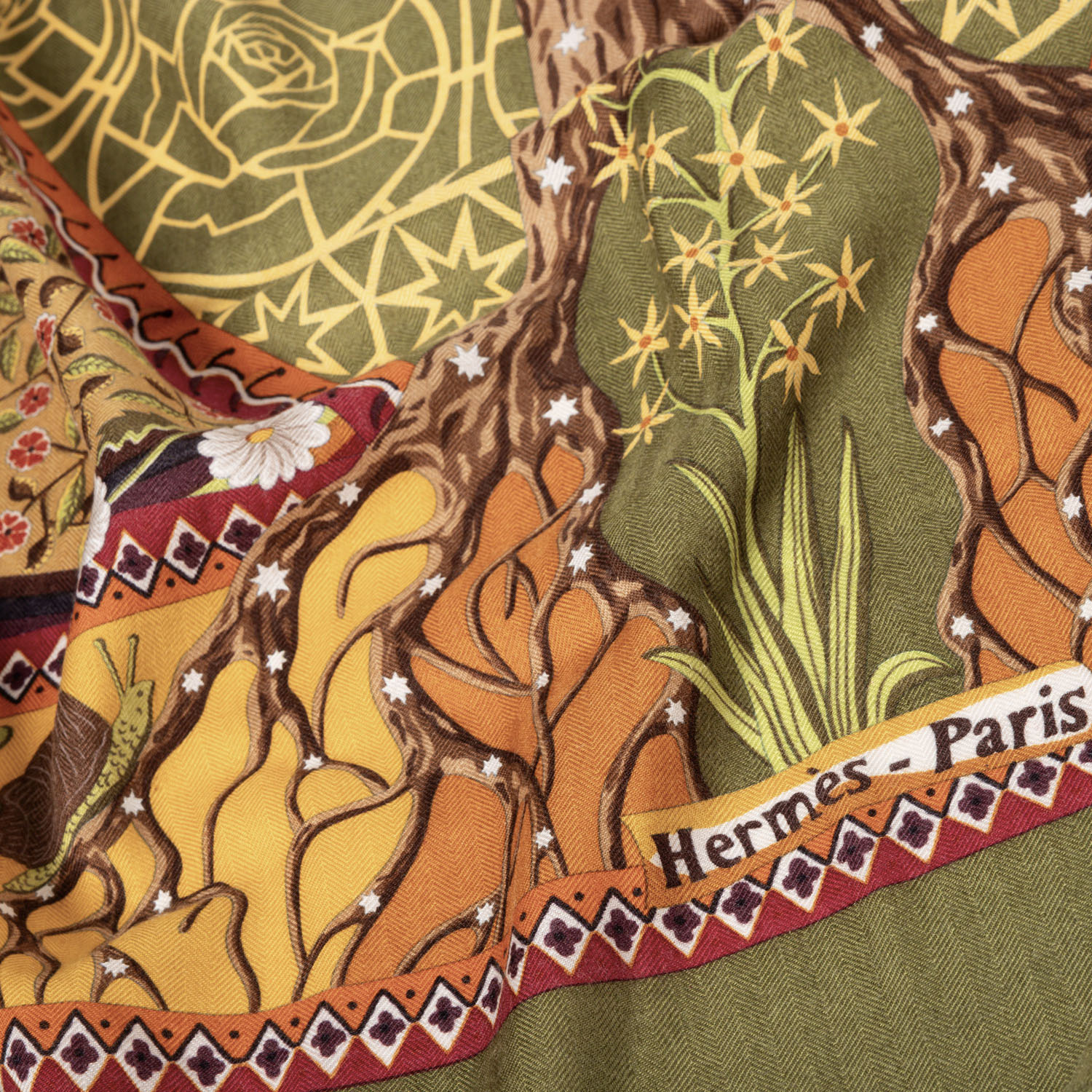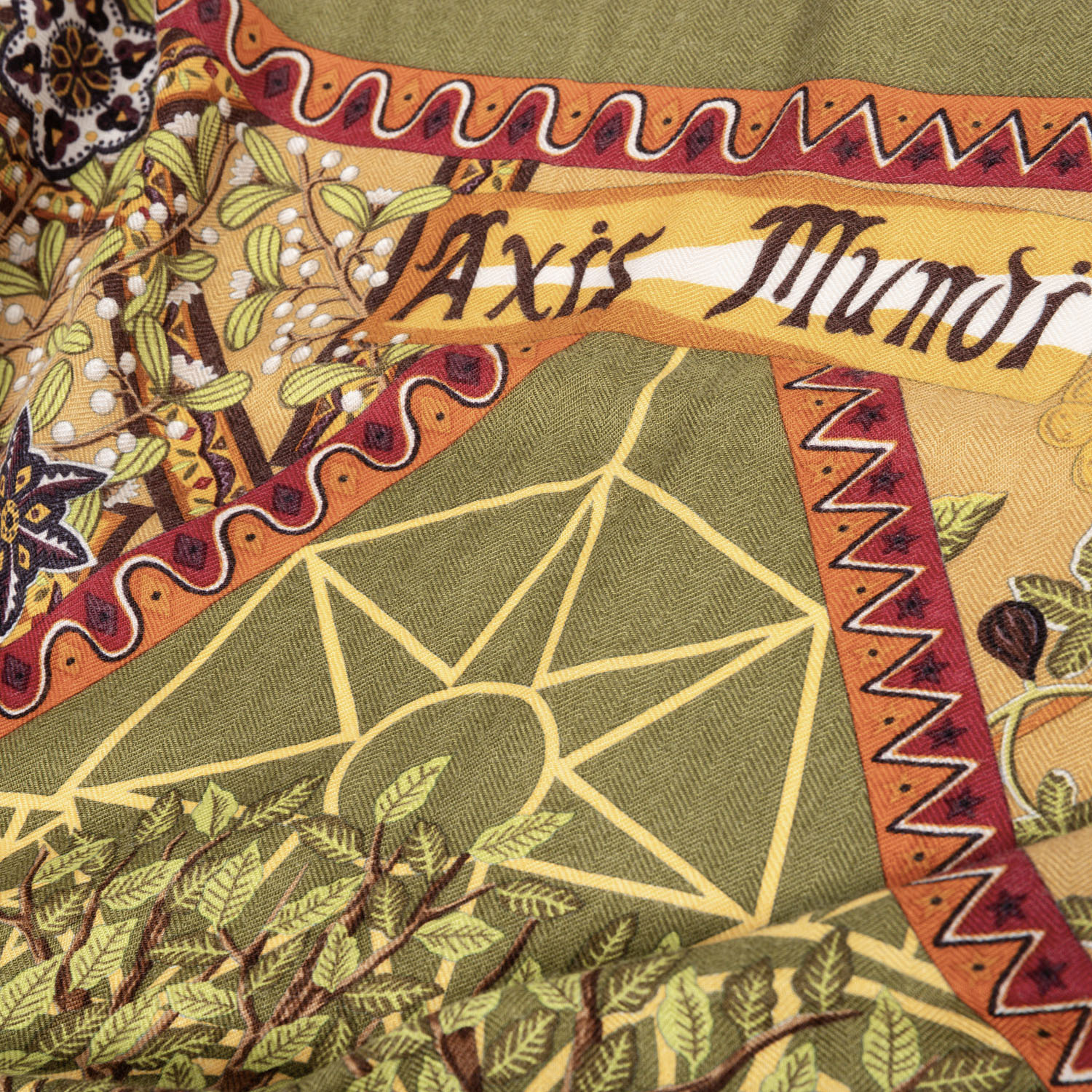 HERMÈS foulard 'AXIS MUNDI'. By Christine Henry, design first published in 1999. 65% cashmere, 35% silk. The world axis, also known as the celestial axis, world pillar, or pillar of the world, is a fundamental concept in cosmogonic myths and refers to the connection between the center of heaven and earth. Hand-rolled hems. Base color in green with multicolor pattern. Hand-rolled hem. 140x140cm. Good condition.