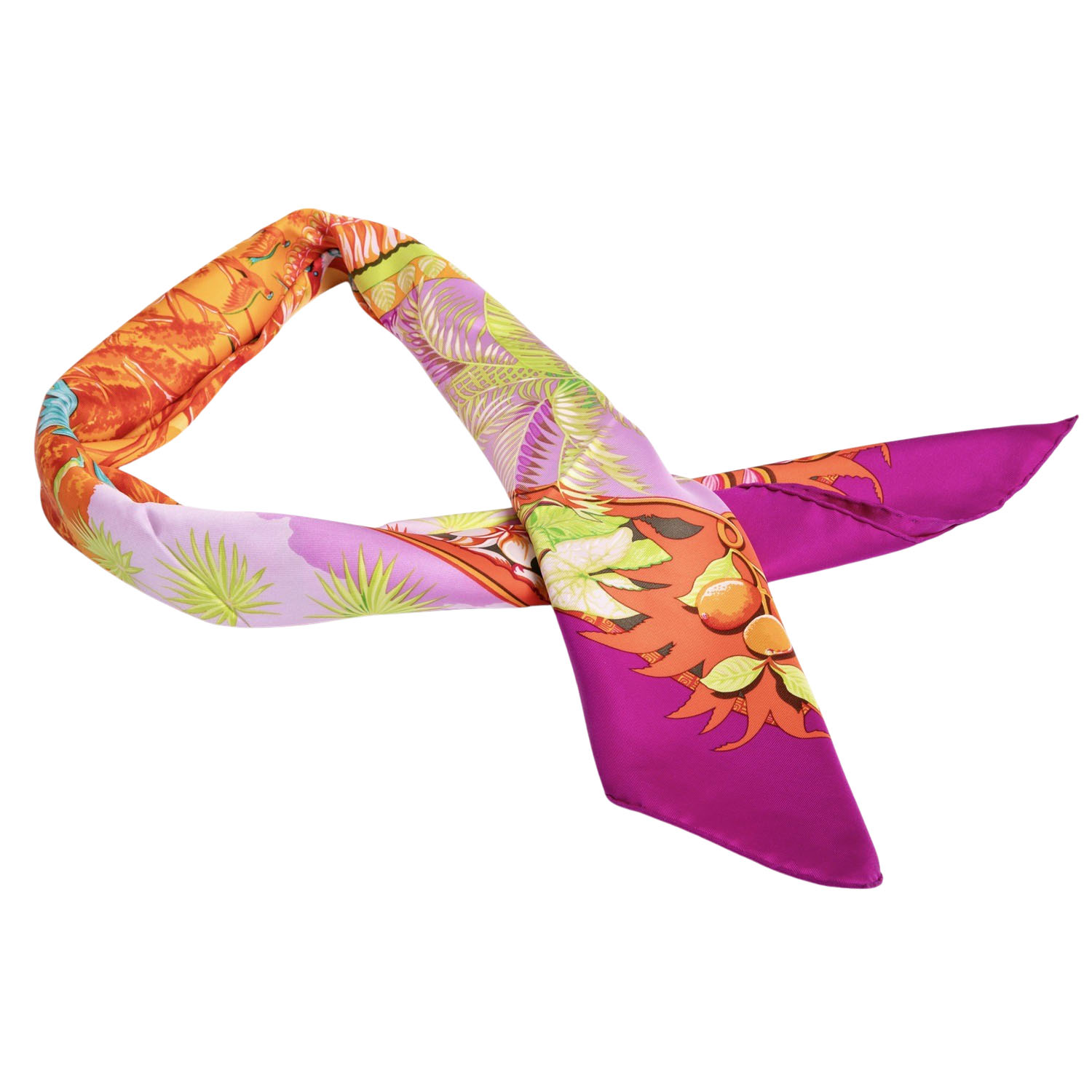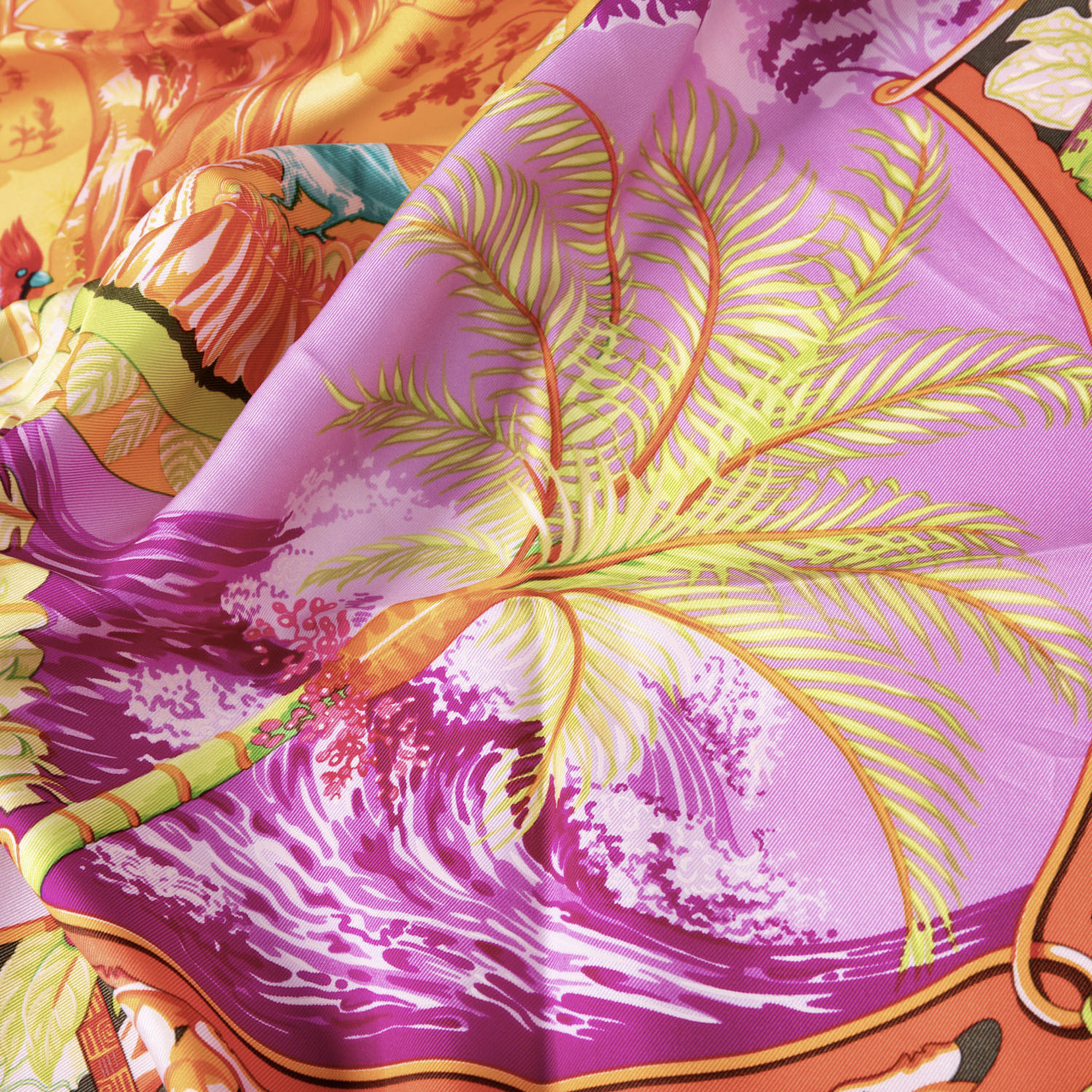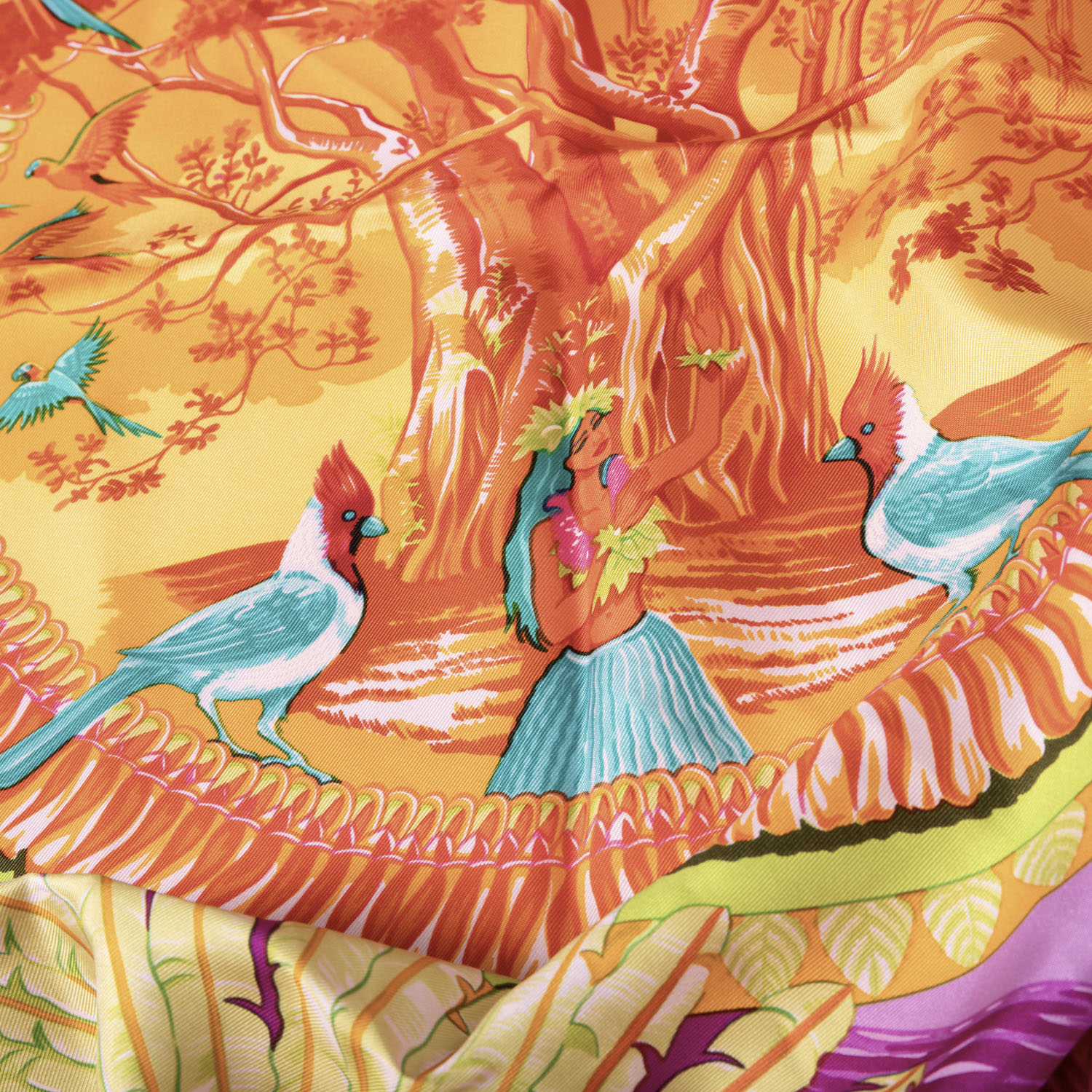 HERMÈS silk scarf 'ALOHA', by Laurence Bourthoumieux, design first published in 2017. Current retail price: €530. 100% silk. ‘Alo’ means ‘nose to nose’, “Ha” means ‘breath of life’. Together, they form ‘Aloha’ – a greeting with meanings such as ‘hello’, “welcome” and ‘I love you’. The Aloha square reflects the tropical nature of Polynesia – with flowers, palm trees, birds and a protective banyan tree in the centre. Hand-rolled hems. 90 x 90 cm. Very good condition.