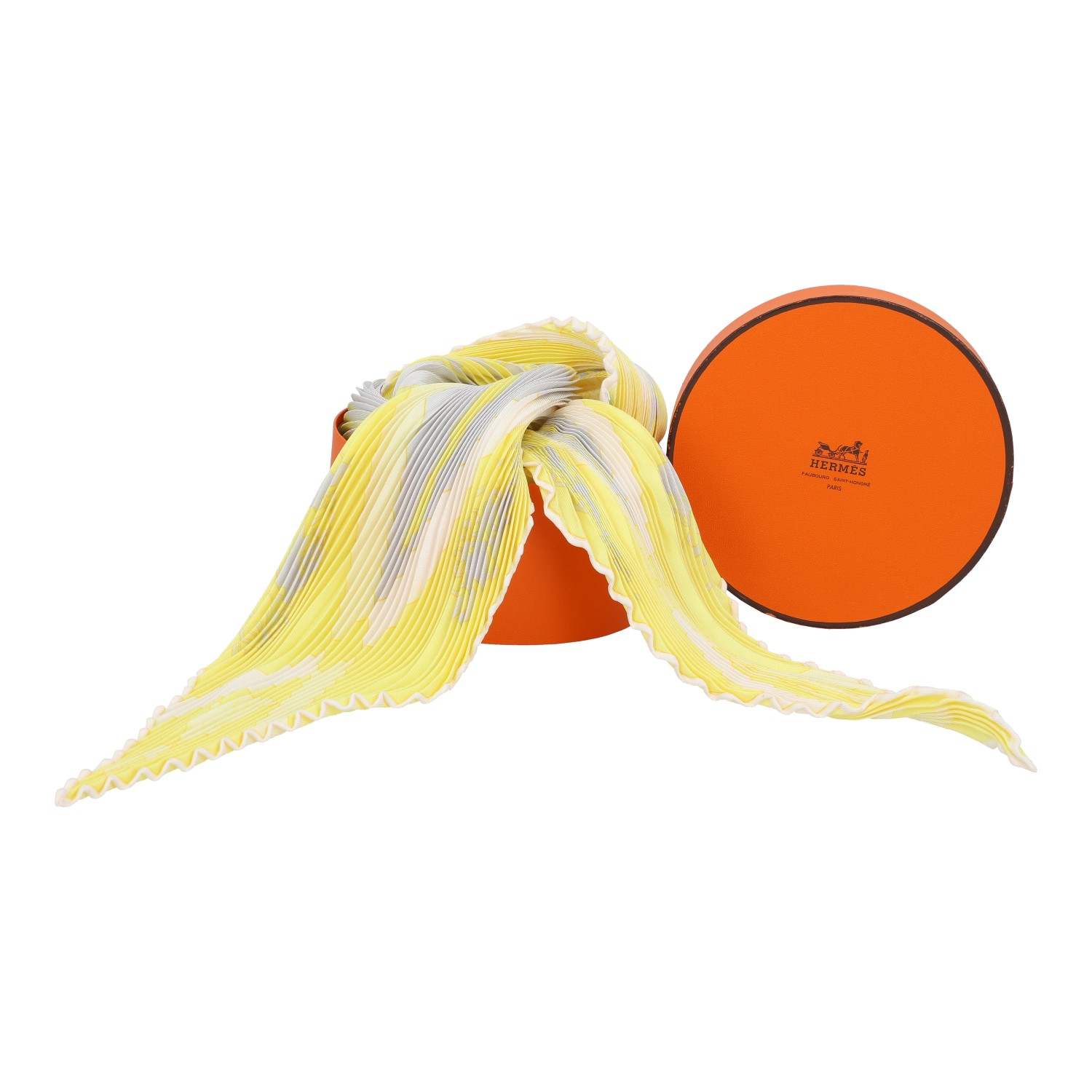 HERMÈS Plissée Carré 'JEUX D'OMBRES', by Loïc Dubigeon, design first published in 2004. 100% silk. Carriage motif in yellow. 90 x 90 cm. Hand-rolled hems. Box included. Very good condition.