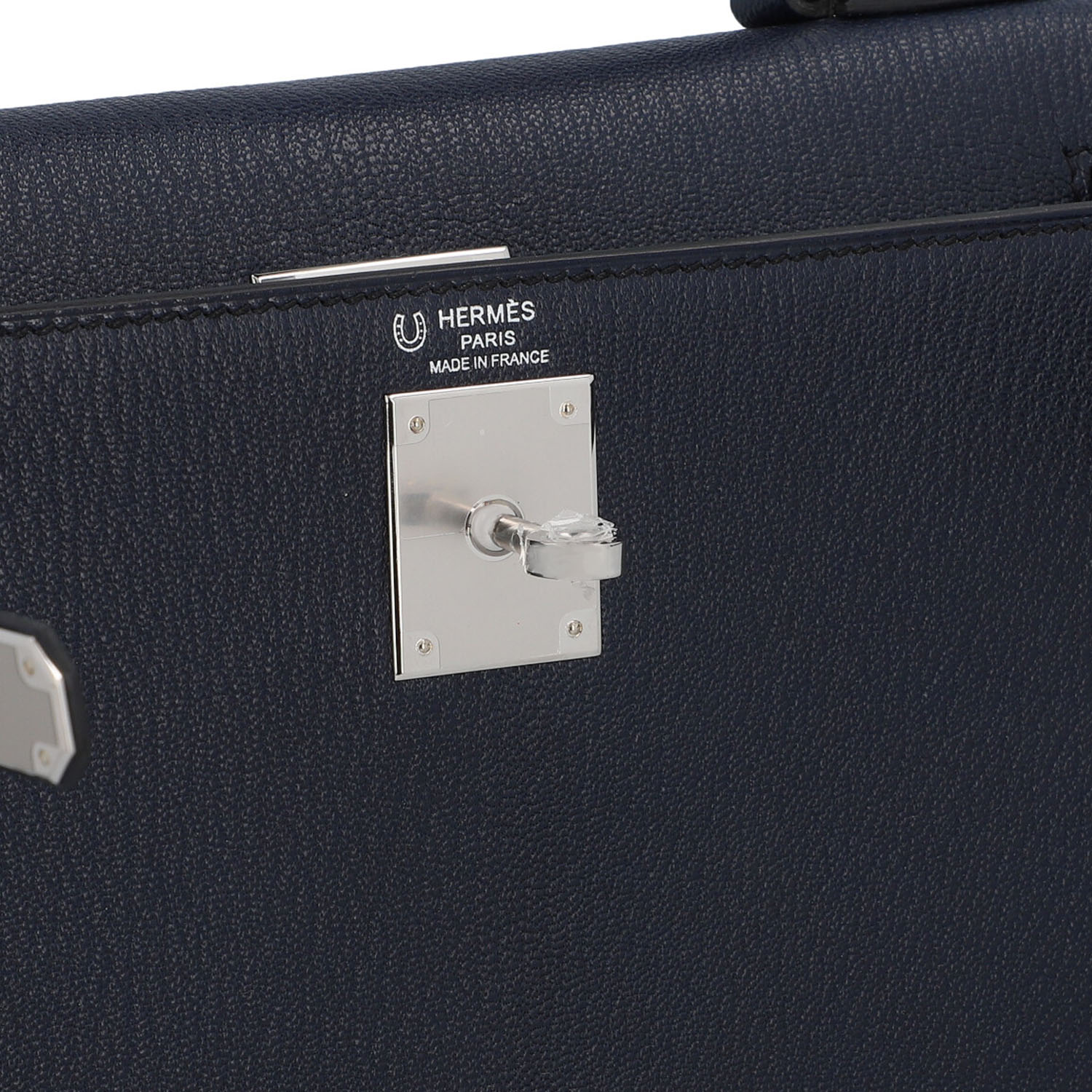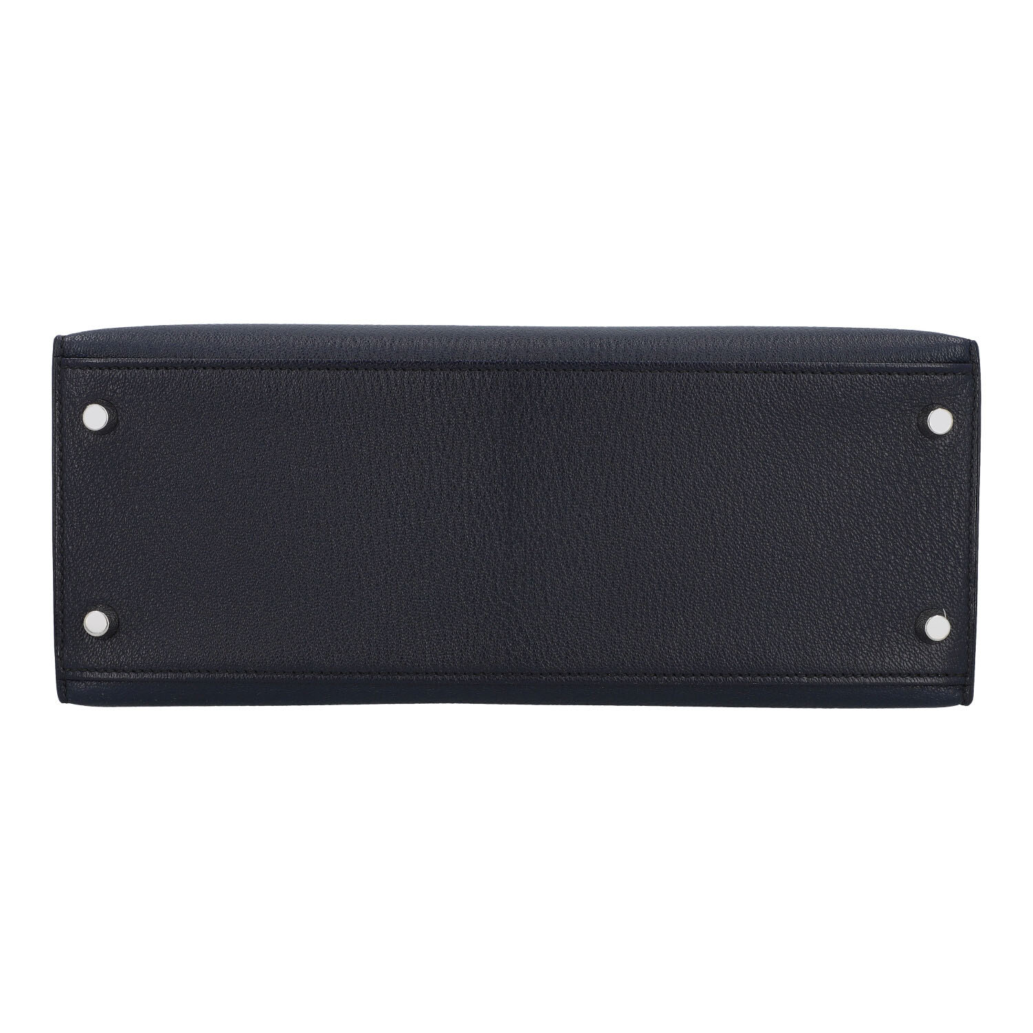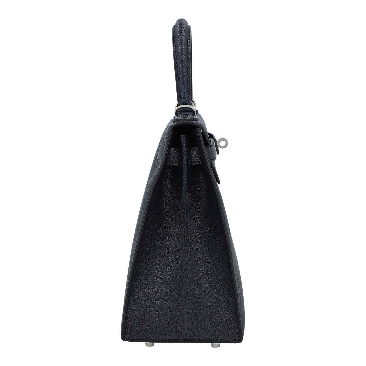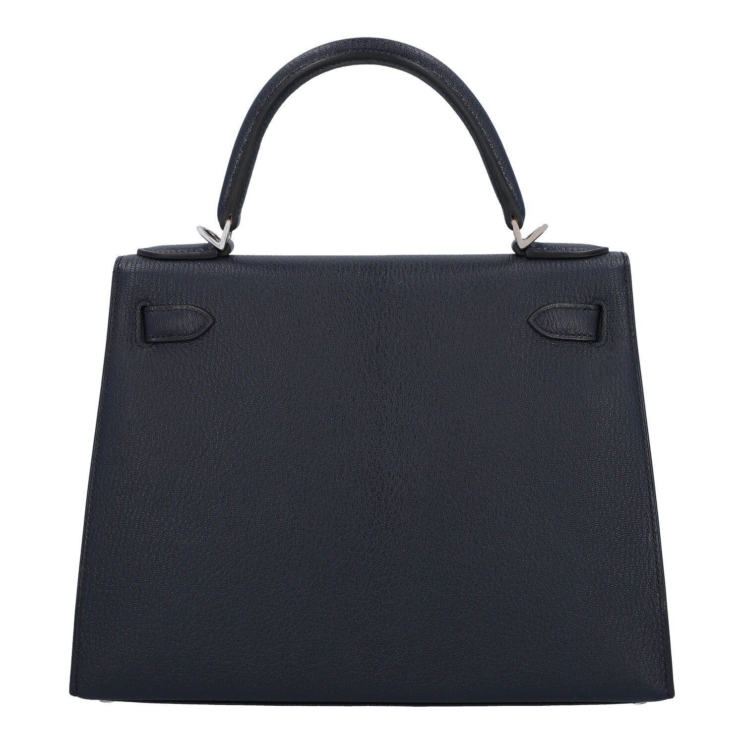 HERMÈS handbag 'KELLY BAG SELLIER 28'. Collection 2024 (Stamp W). Personalized model with horseshoe embossing. Chevre Mysore leather in midnight blue and dark blue (probably Bleu Nuit and Bleu Royal). Silver-colored hardware with paladium plating. In mint condition, hardware still covered with foil. Full set (box, dust bag, shoulder strap, clochette, lock, key and invoice enclosed).