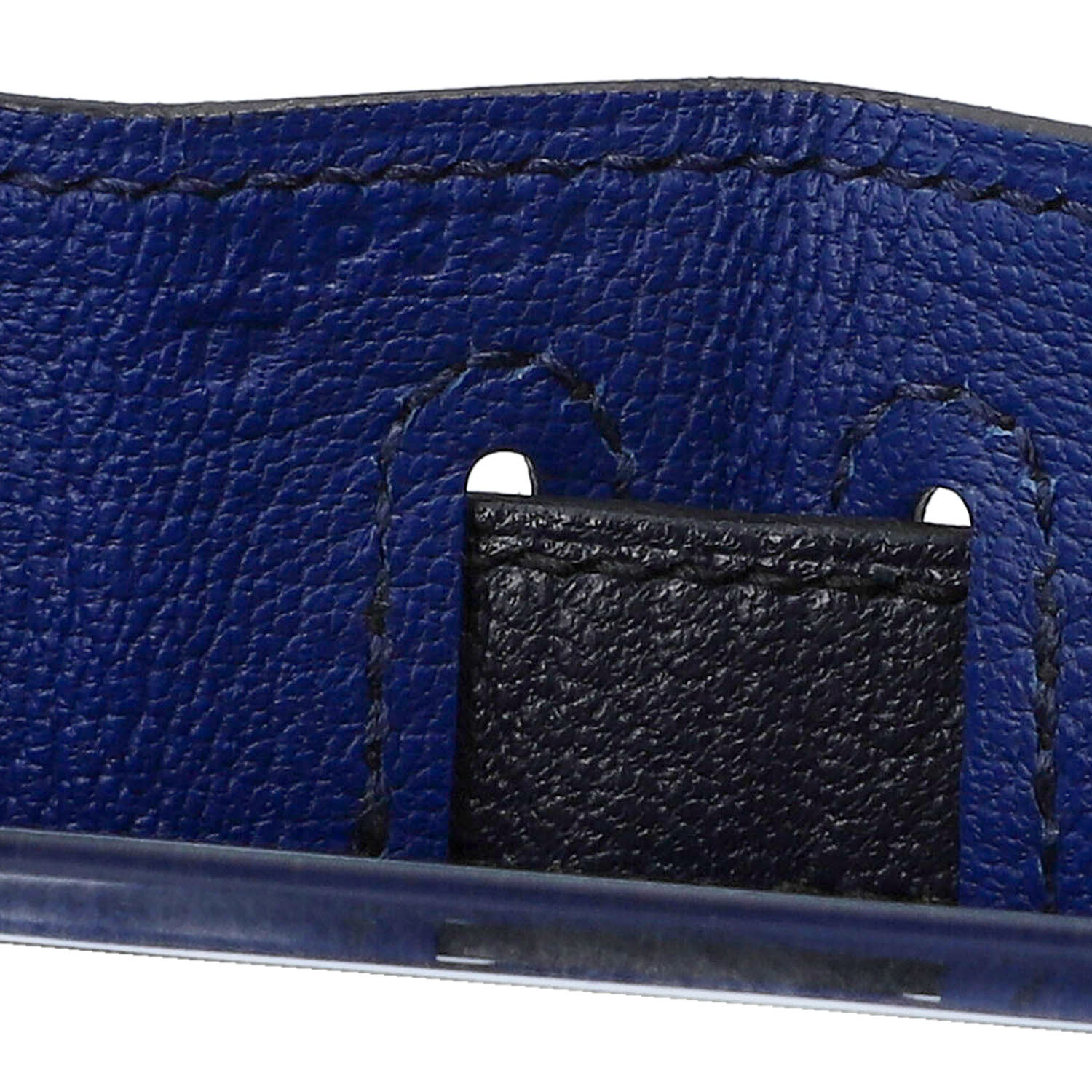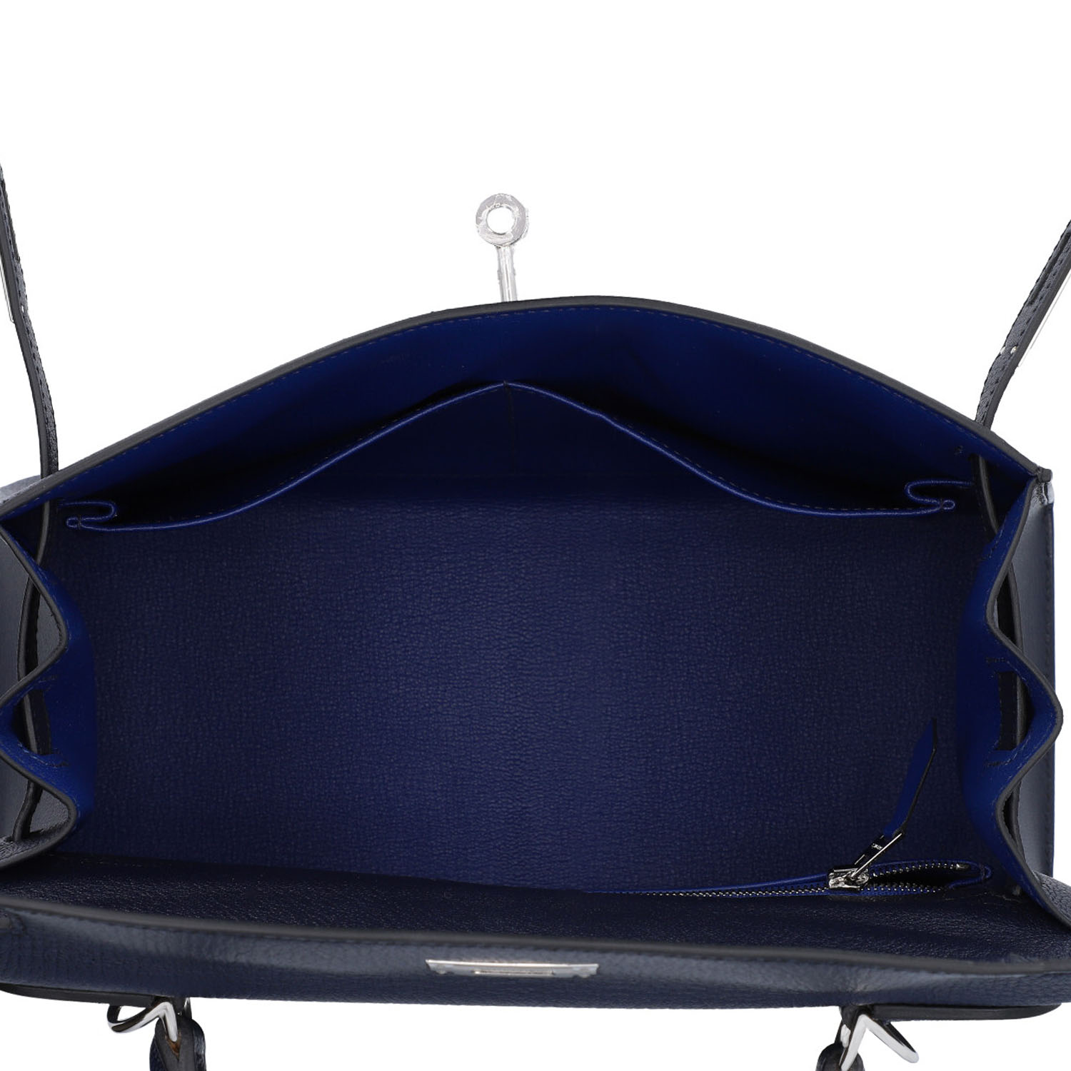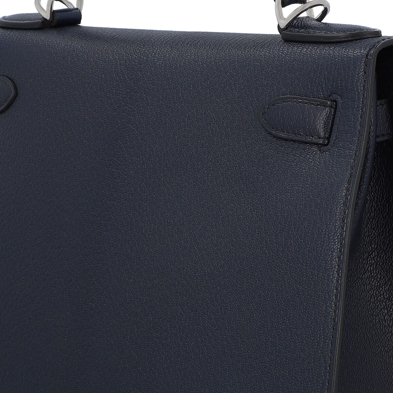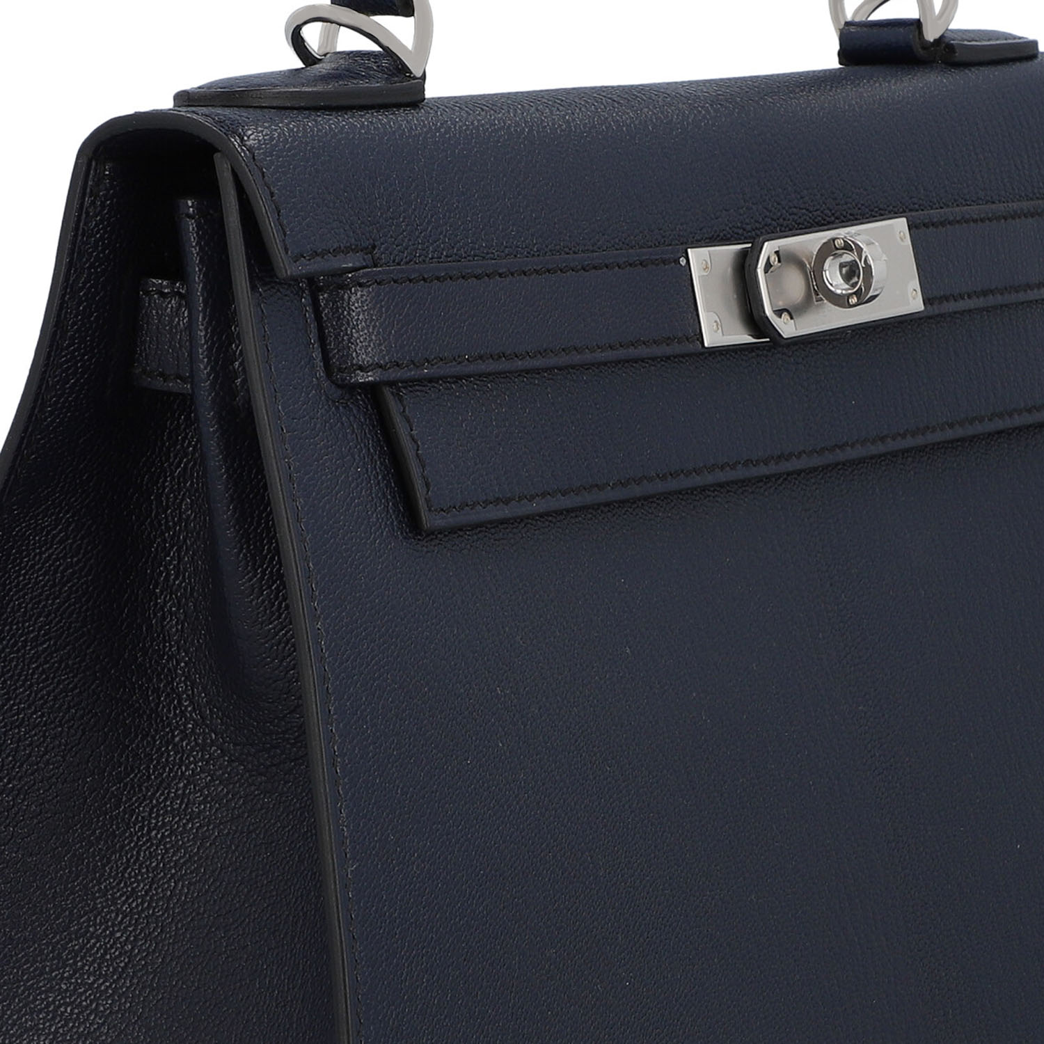 HERMÈS handbag 'KELLY BAG SELLIER 28'. Collection 2024 (Stamp W). Personalized model with horseshoe embossing. Chevre Mysore leather in midnight blue and dark blue (probably Bleu Nuit and Bleu Royal). Silver-colored hardware with paladium plating. In mint condition, hardware still covered with foil. Full set (box, dust bag, shoulder strap, clochette, lock, key and invoice enclosed).