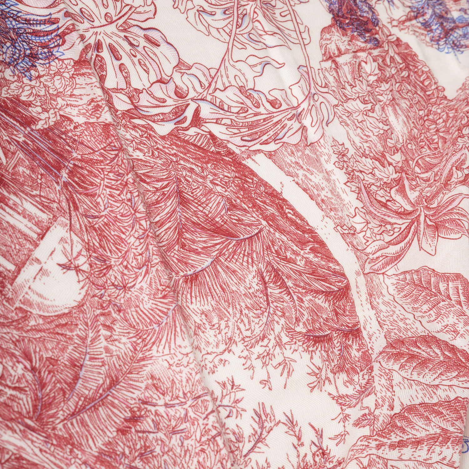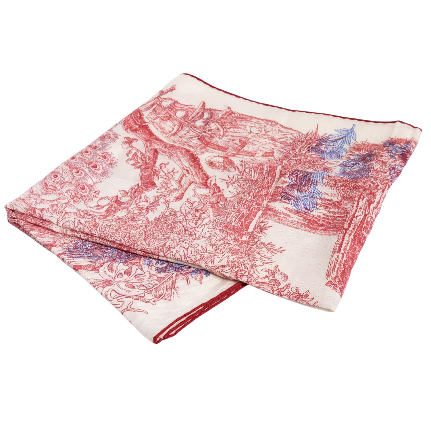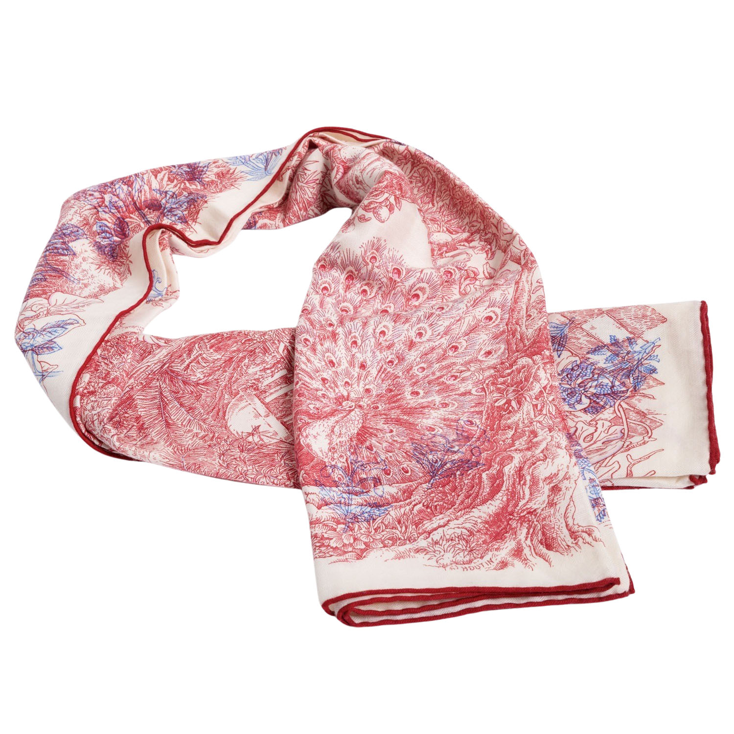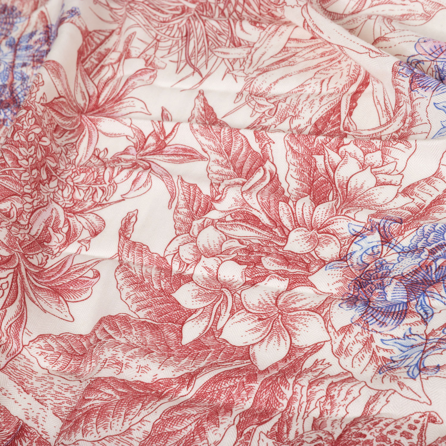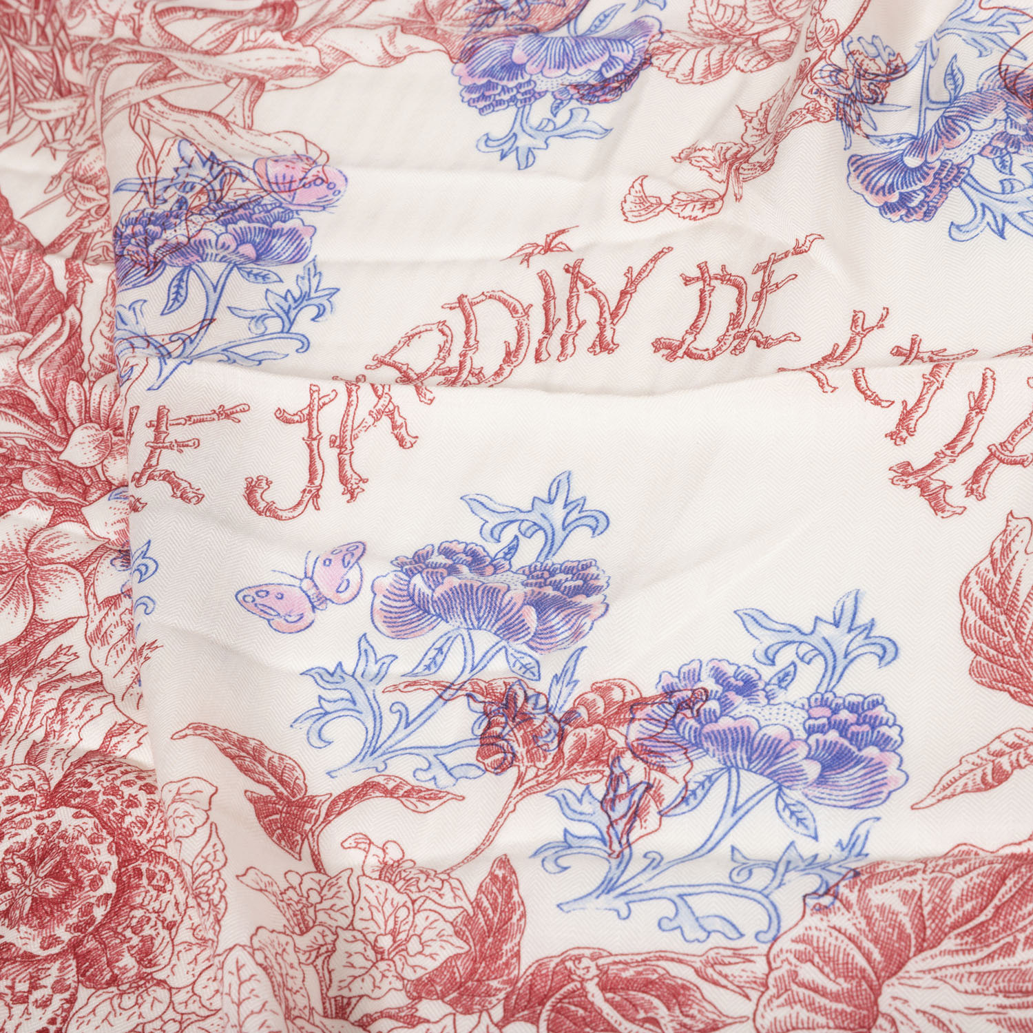 HERMÈS scarf 'LE JARDIN DE LEILA'. Designed by Francois Houtin, first released in 2014. 70% cashmere and 30% silk. Floral motif in red and blue on a cream background. Hand-rolled hem. 140x140cm. Slight signs of wear.