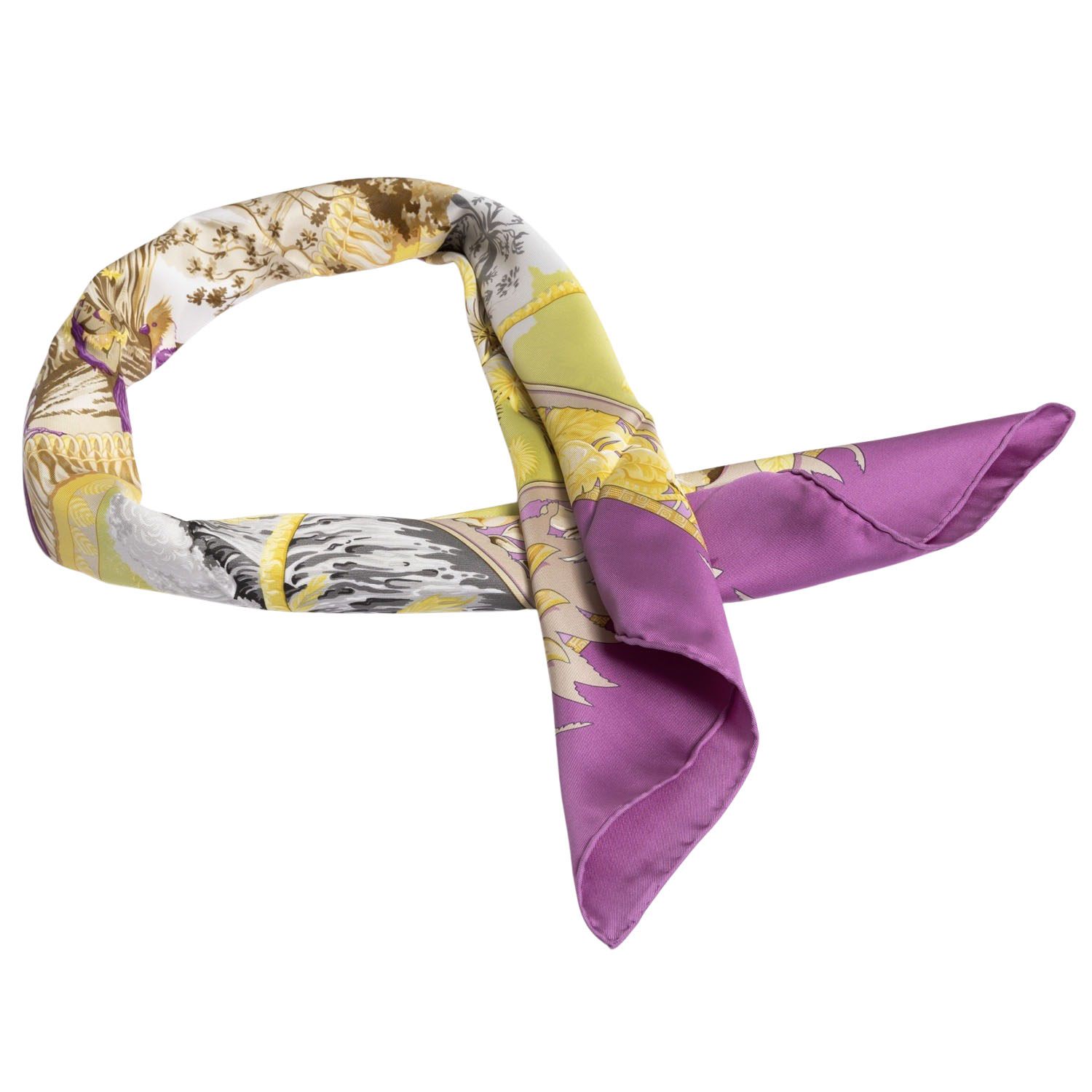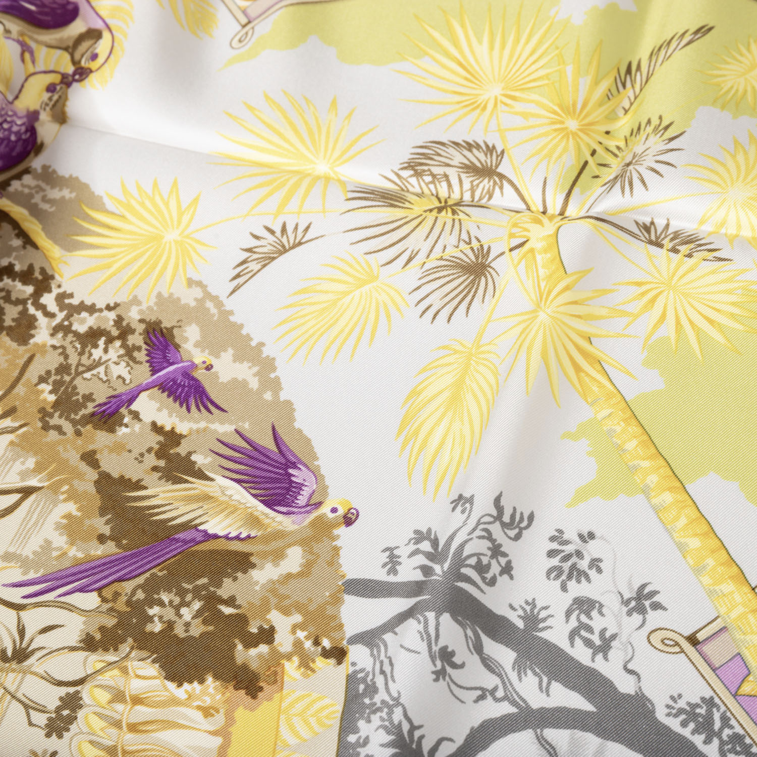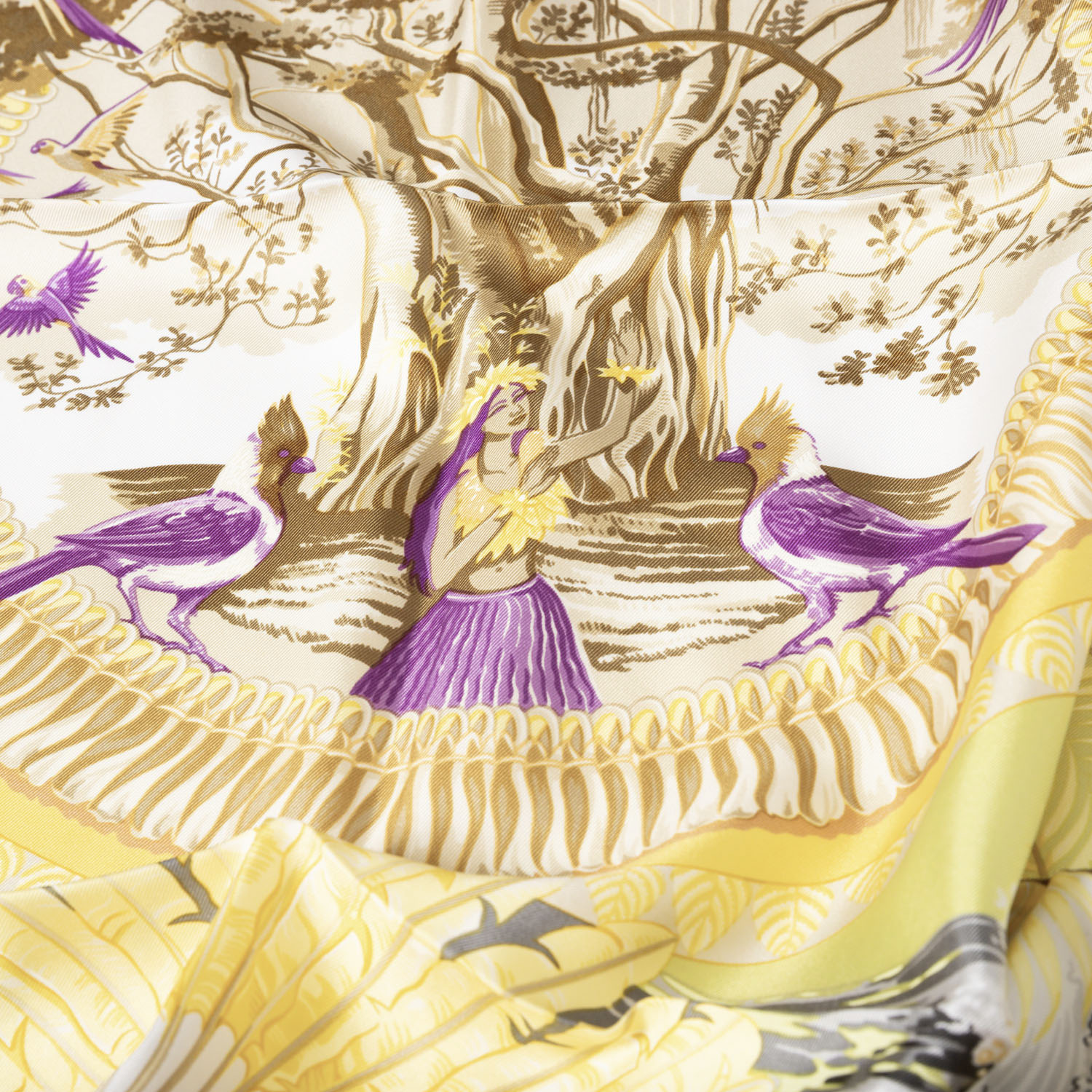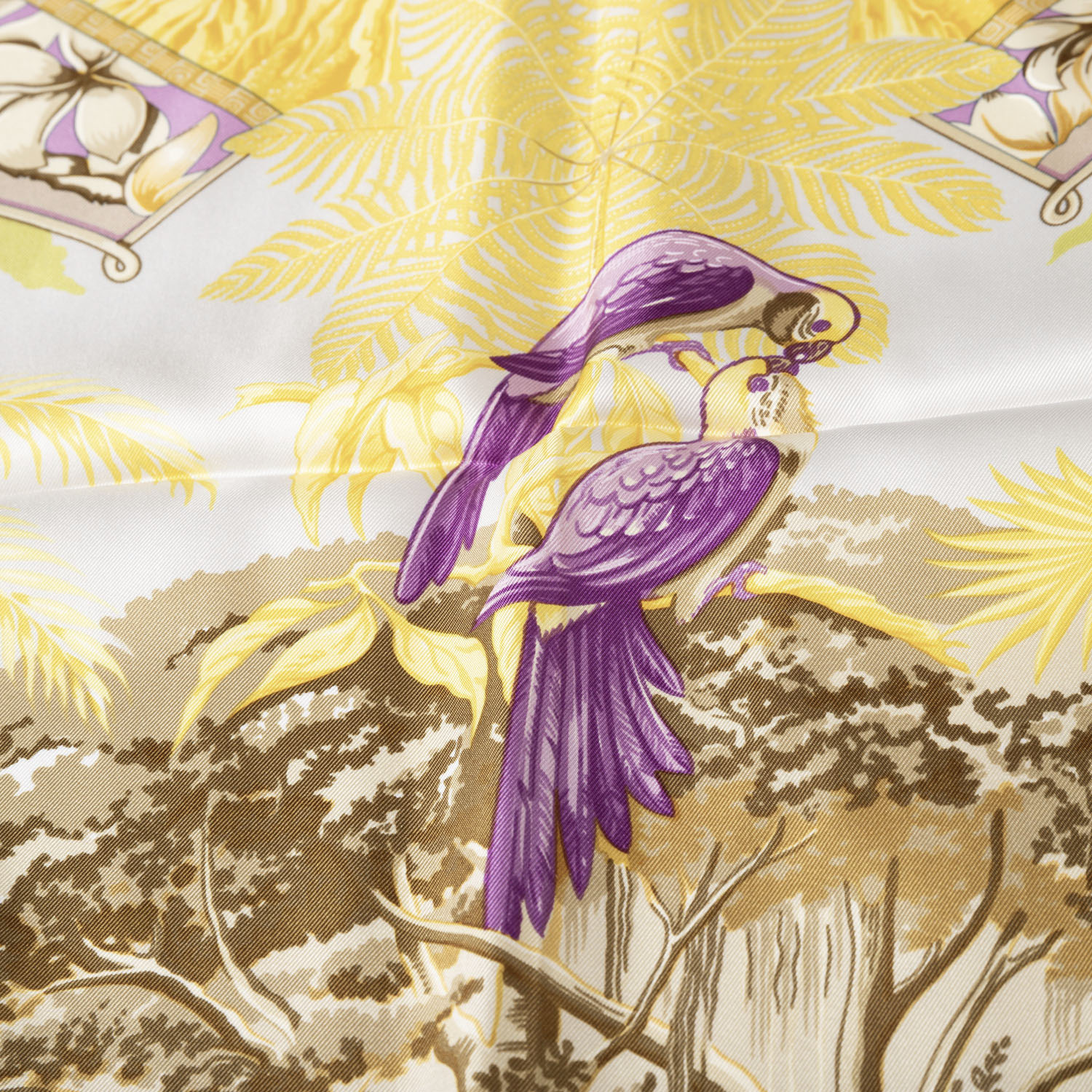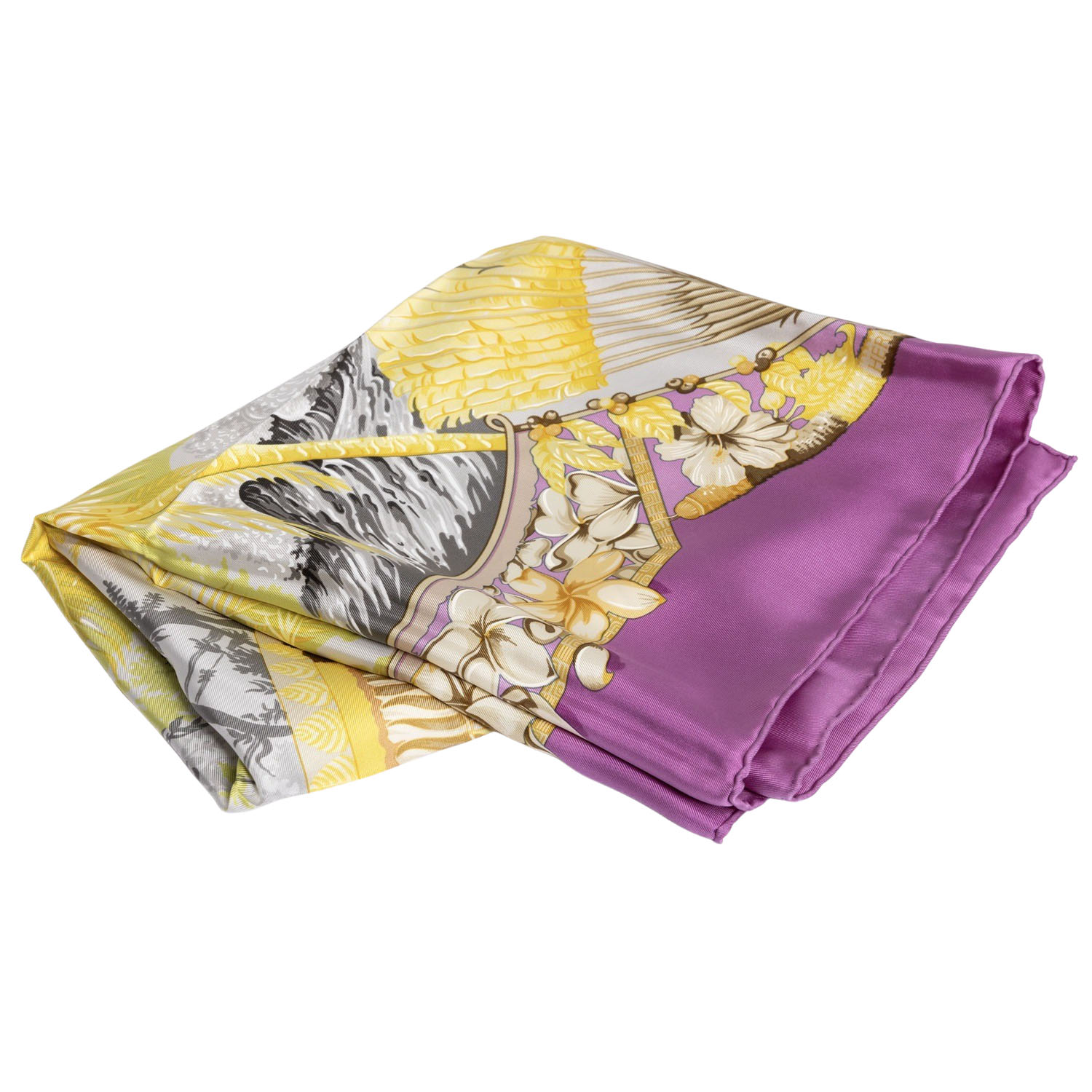 HERMÈS silk scarf 'ALOHA', by Laurence Bourthoumieux, design first published in 2017. Current retail price: €530. 100% silk. ‘Alo’ means ‘nose to nose’, “Ha” means ‘breath of life’. Together, they form ‘Aloha’ – a greeting with meanings such as ‘hello’, “welcome” and ‘I love you’. The Aloha square reflects the tropical nature of Polynesia – with flowers, palm trees, birds and a protective banyan tree in the centre. Hand-rolled hems. 90 x 90 cm. Very good condition.