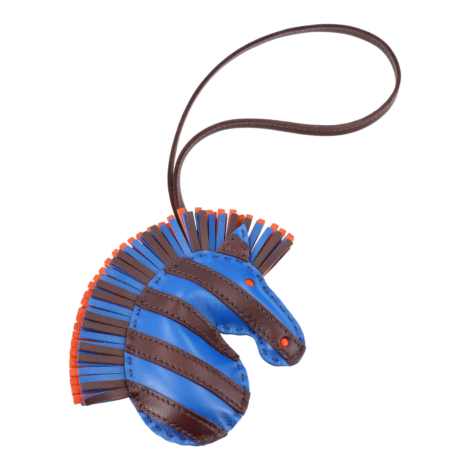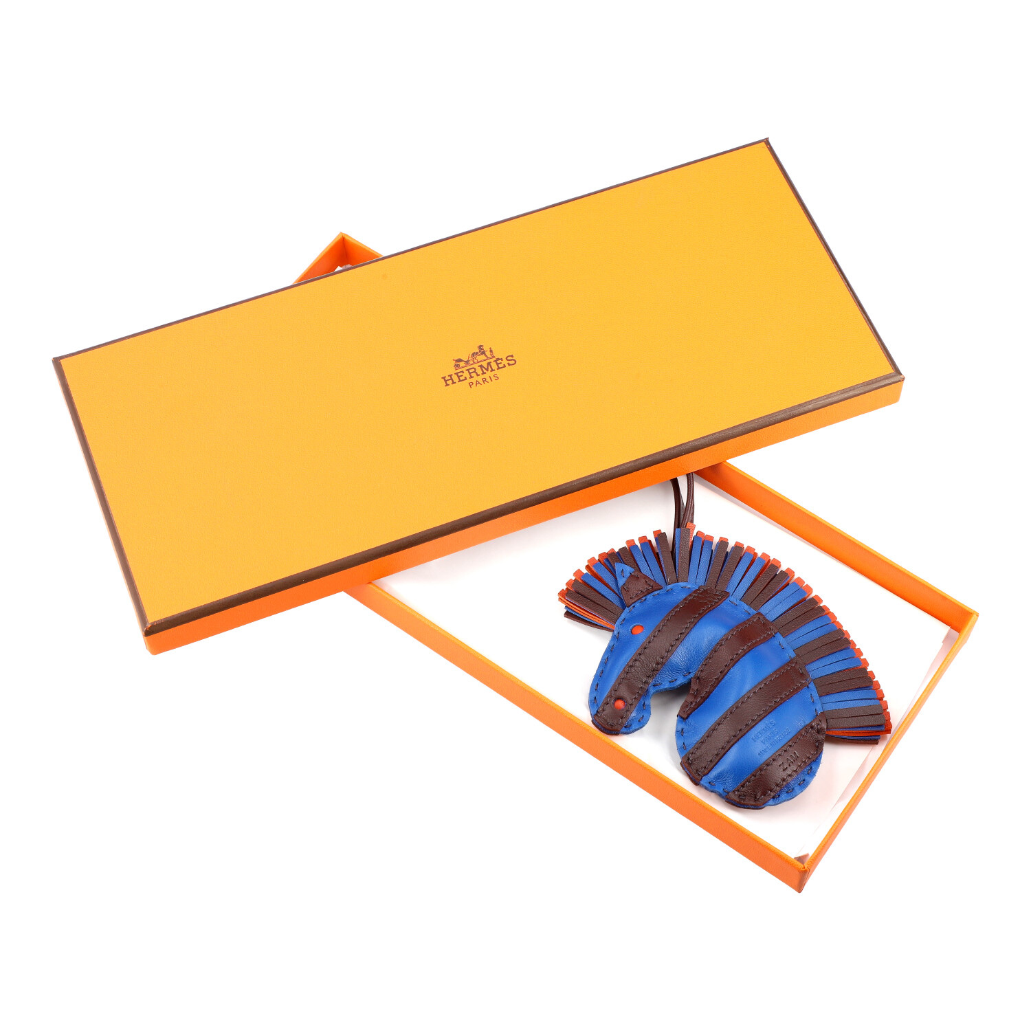 HERMÈS bag charm 'GEEGEE SAVANNAH'. Coll. 2022. Currently sold out and no longer available. Talisman (charm) 'Zebra' in Milo lamb leather. In Bleu France - Rouge Sellier and Cornaline. Like new with box.