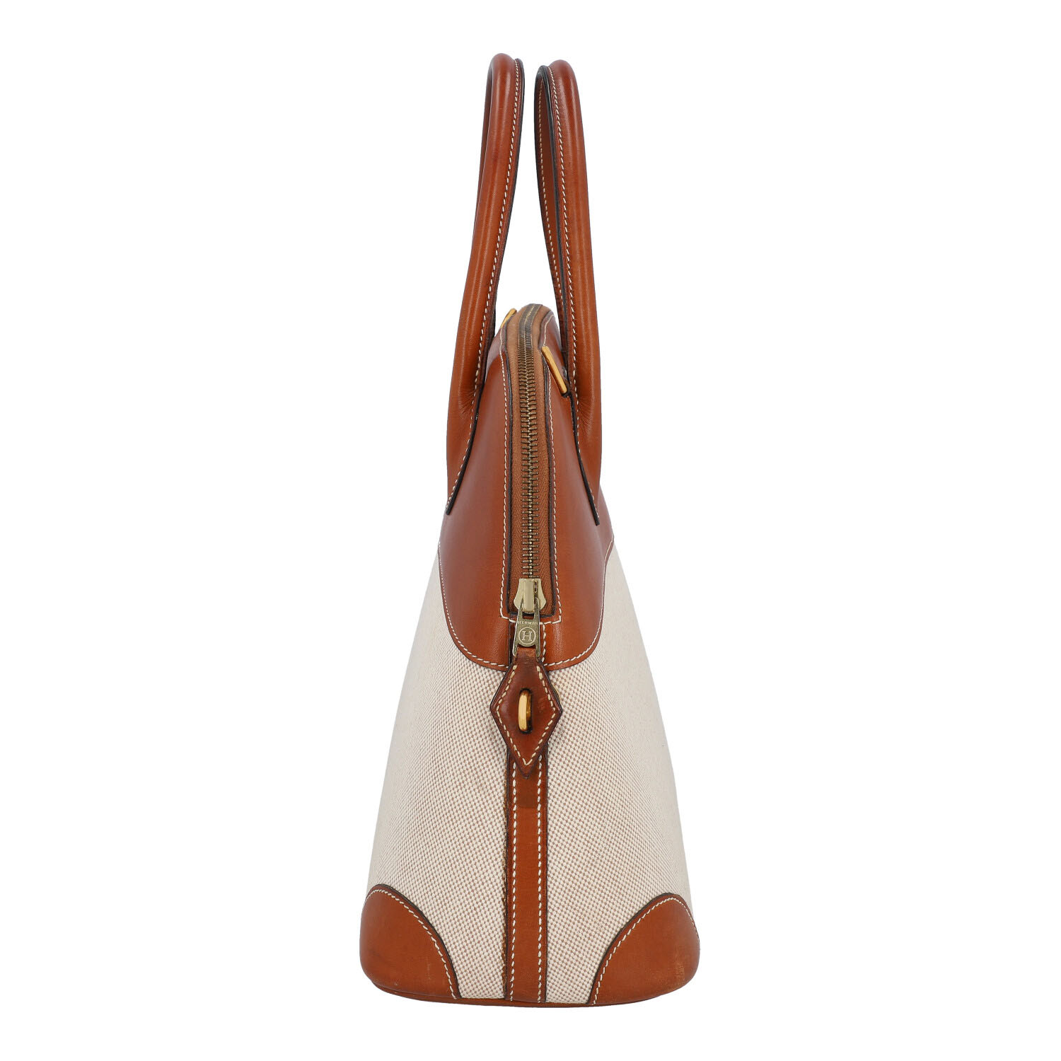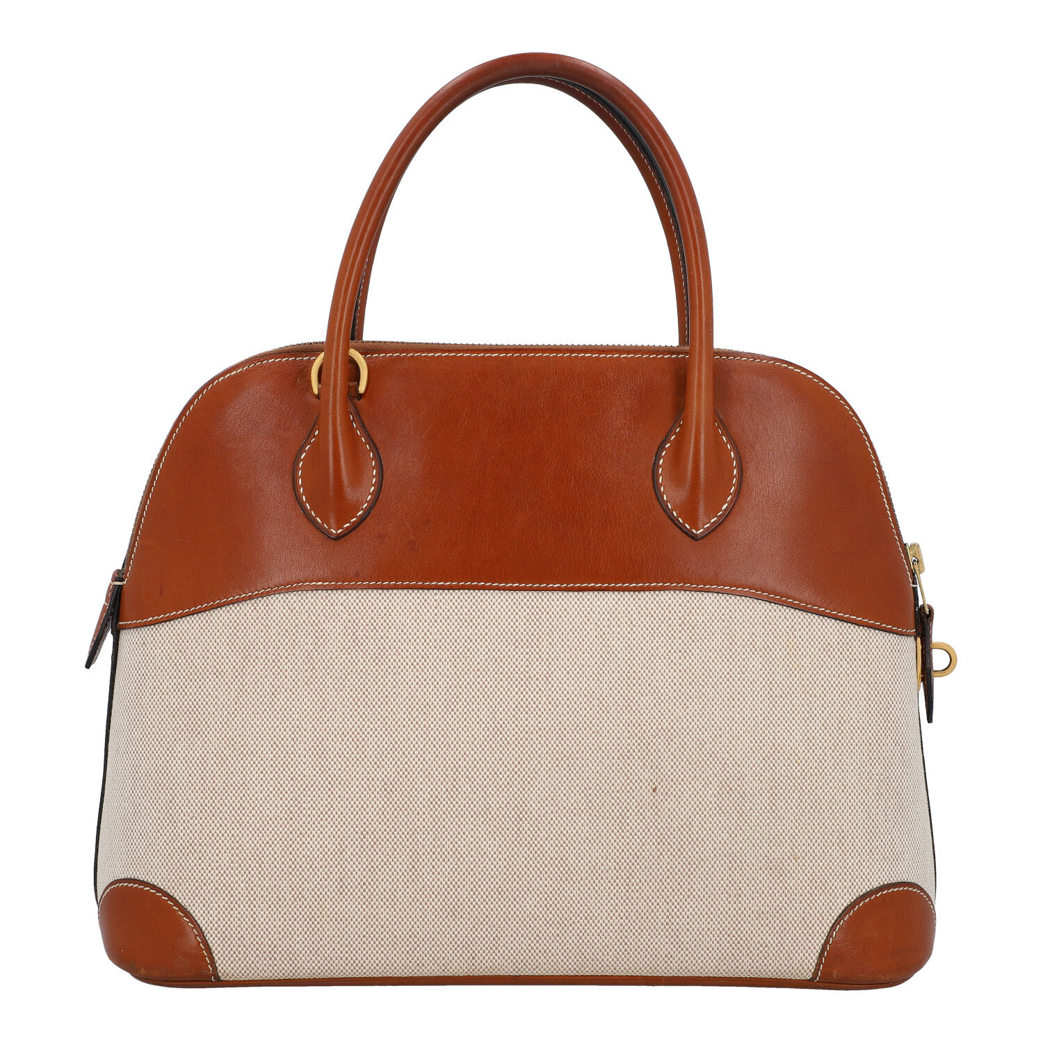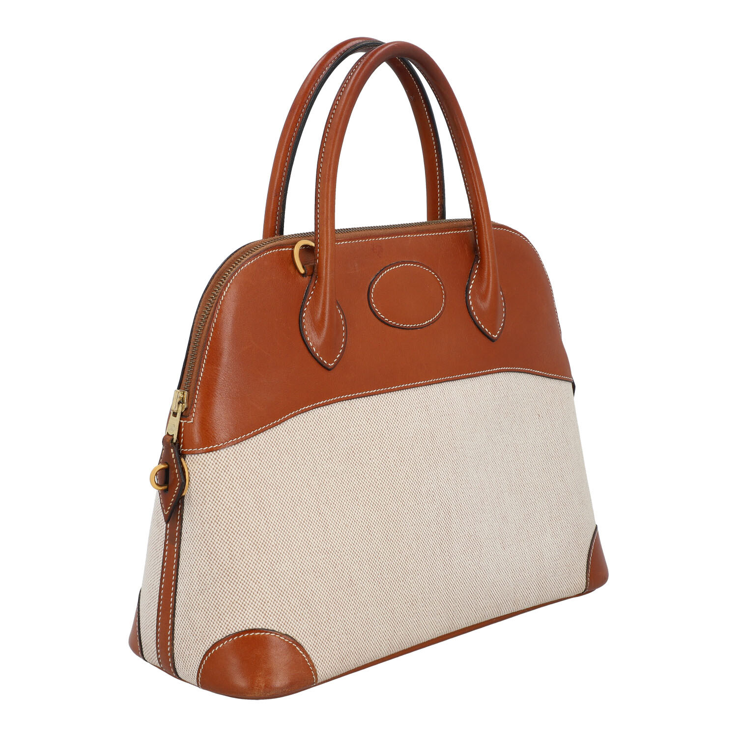 HERMÈS VINTAGE handle bag “BOLIDE 31”, coll.: 1995. Toile and Barina leather with gold-plated hardware, double handle and zipper. Interior with one compartment. Detachable shoulder strap, key in clochette, lock and dust bag enclosed. Signs of use and age present.