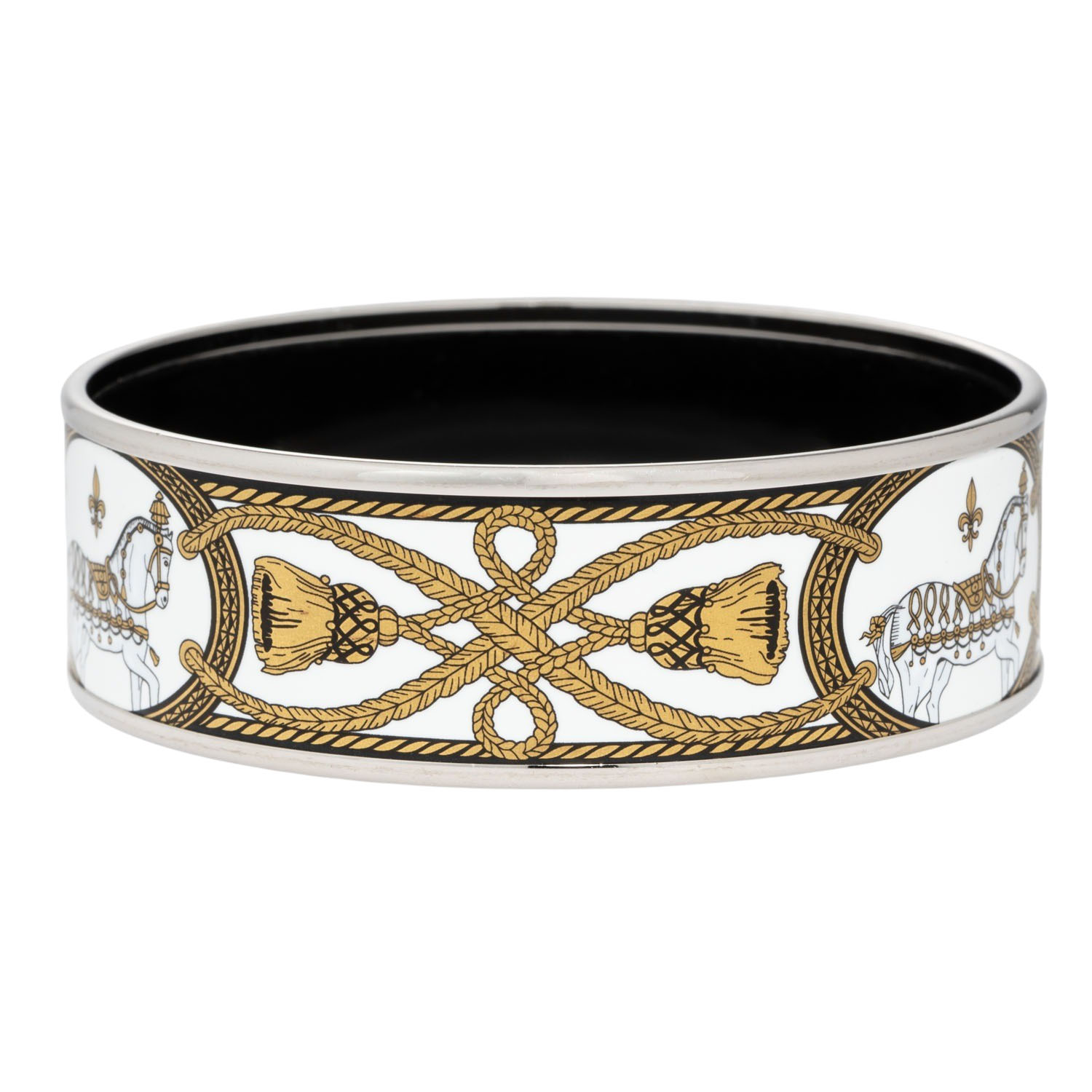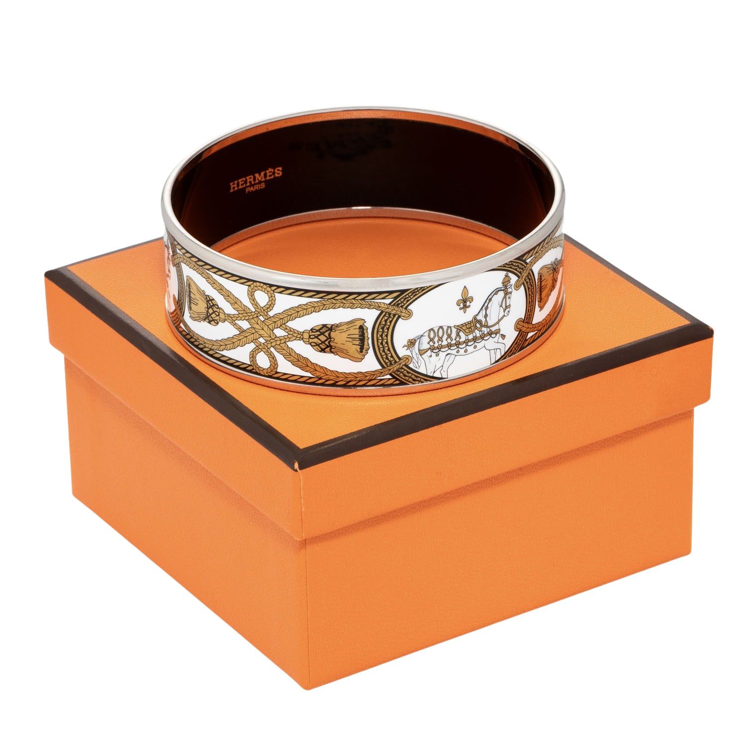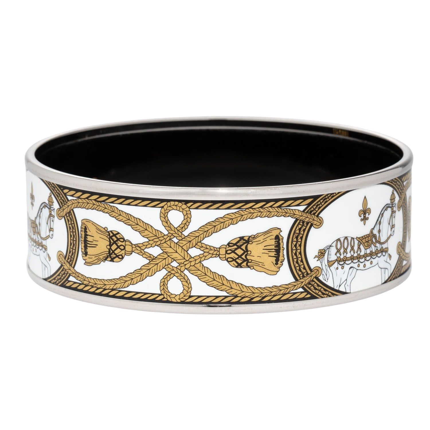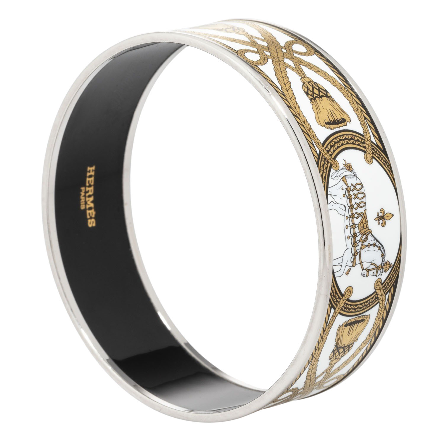 HERMÈS bangle. Wide model with silver-colored frame and decorative gold-colored pattern on a white background. Signs of wear present. Box and dust bag included. Width approx. 2.3 cm, diameter approx. 6.8 cm.