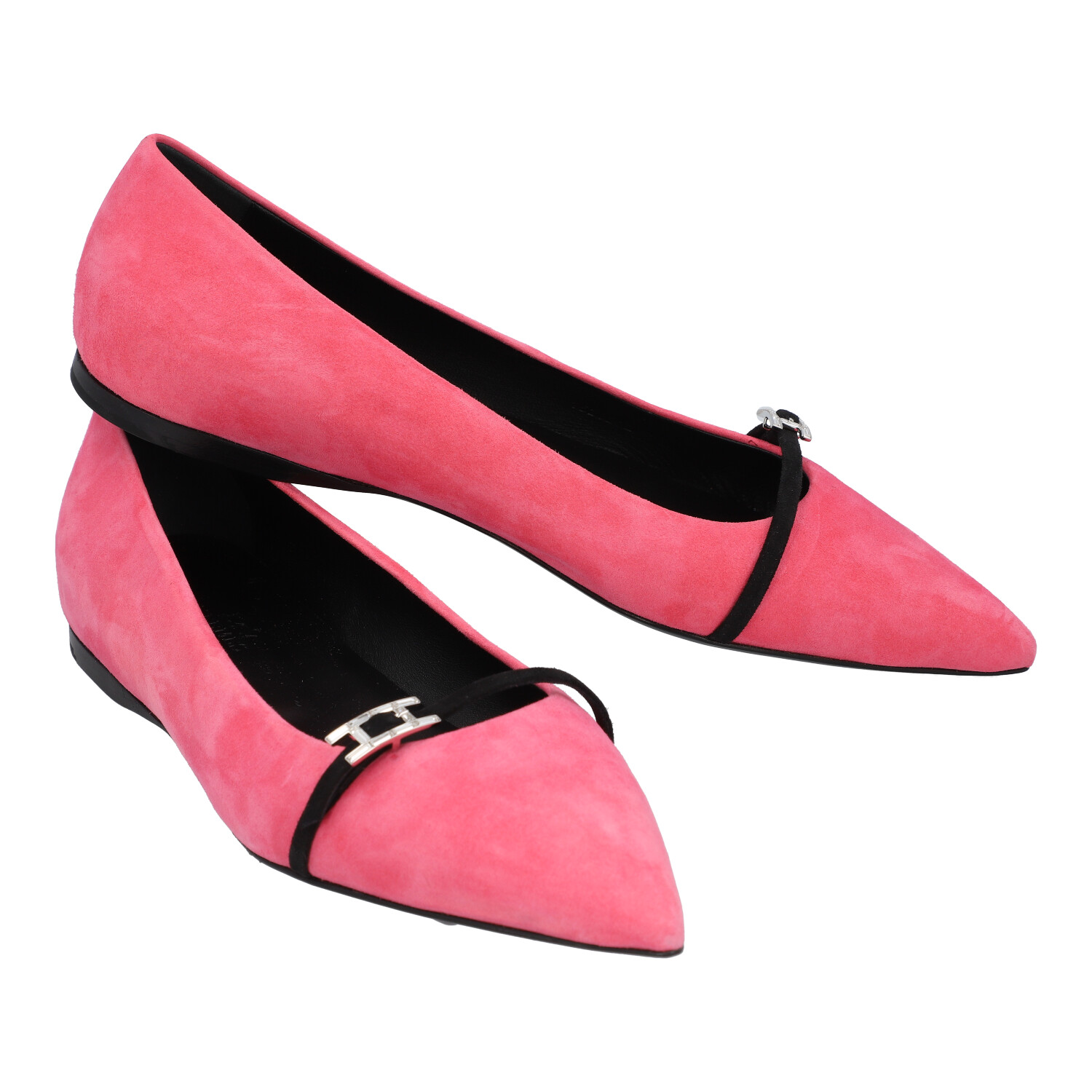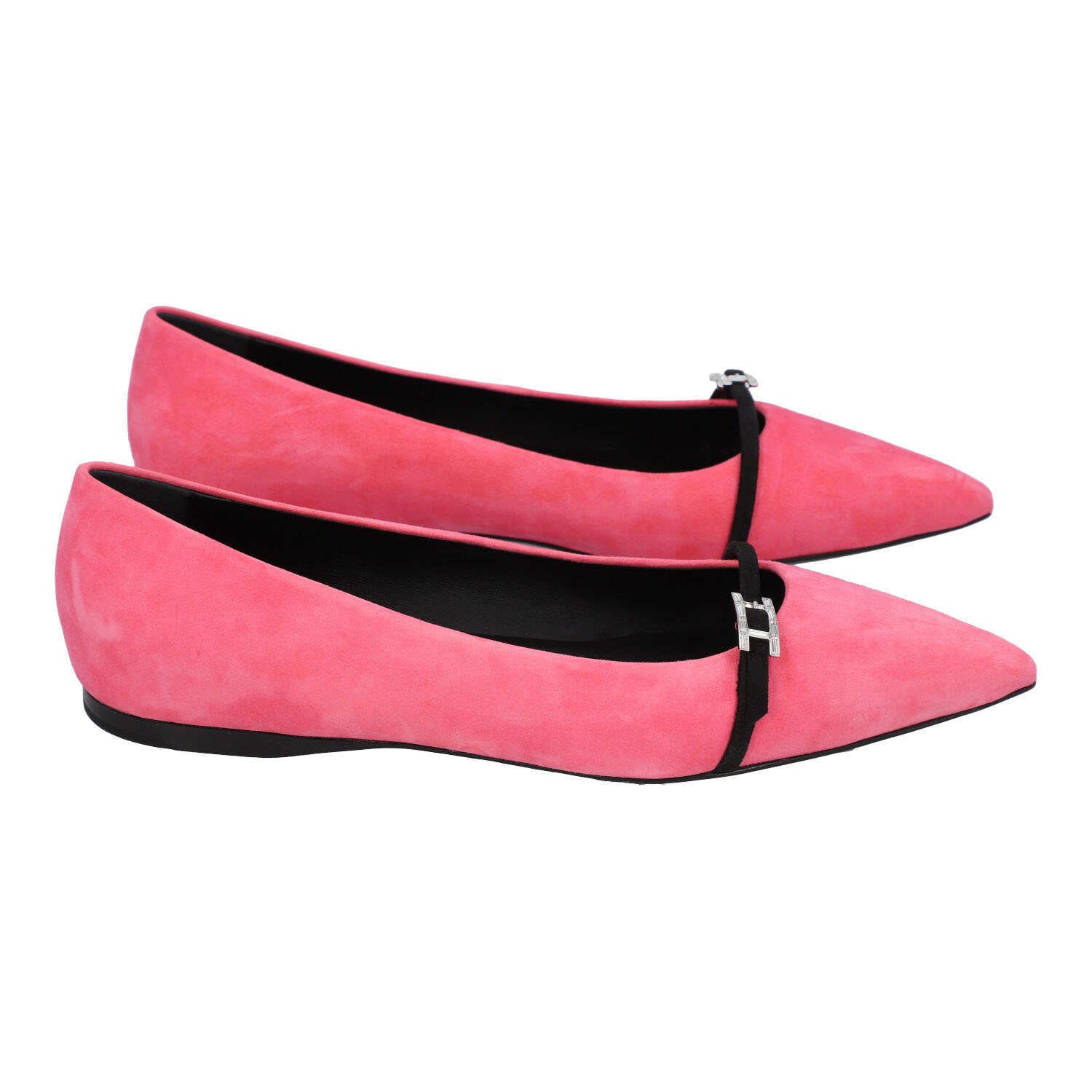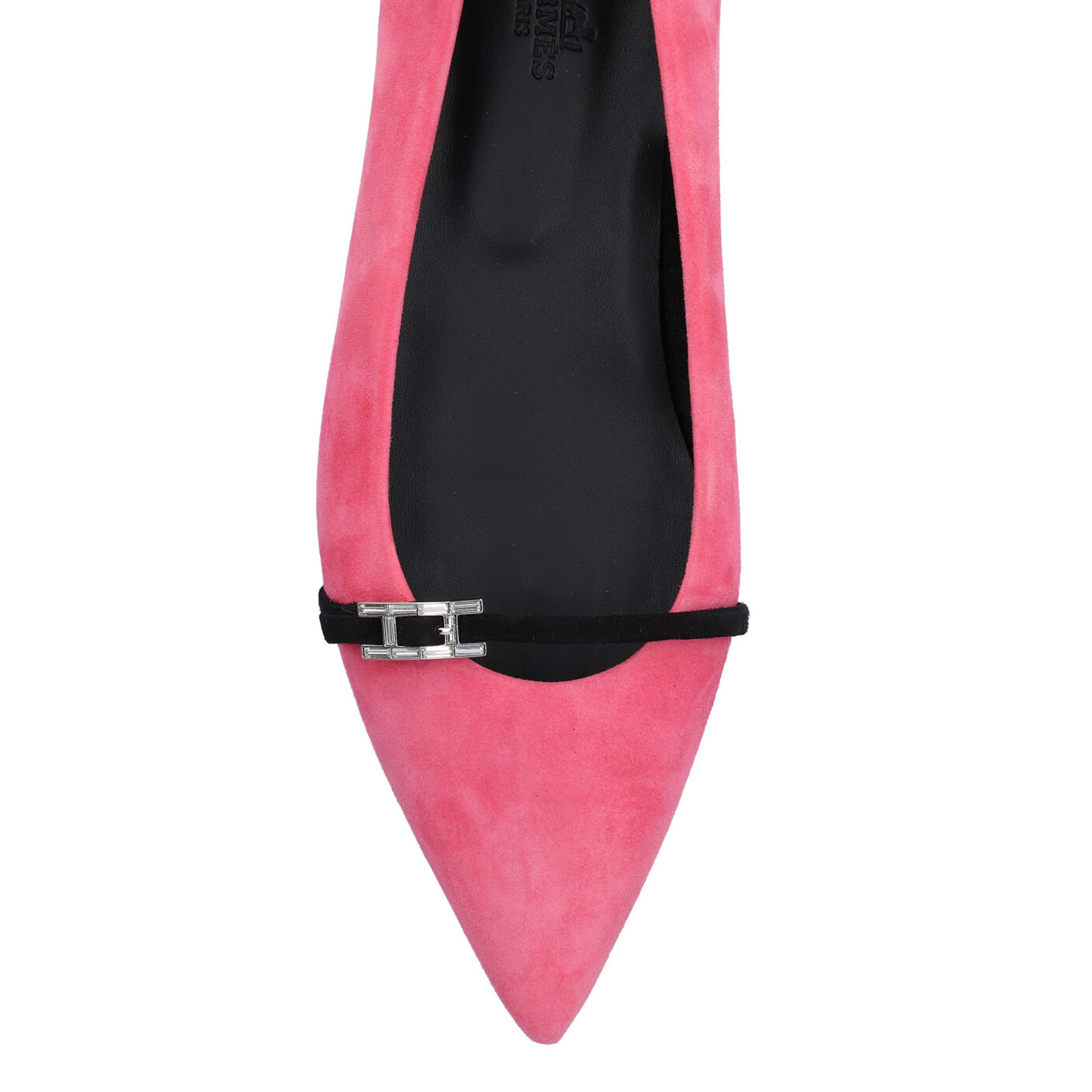 HERMÈS ballet flats 'LAURA', size 39,5. Suede in pink with black strap and hapi clasp with rhinestone trim. Box enclosed. As good as new.