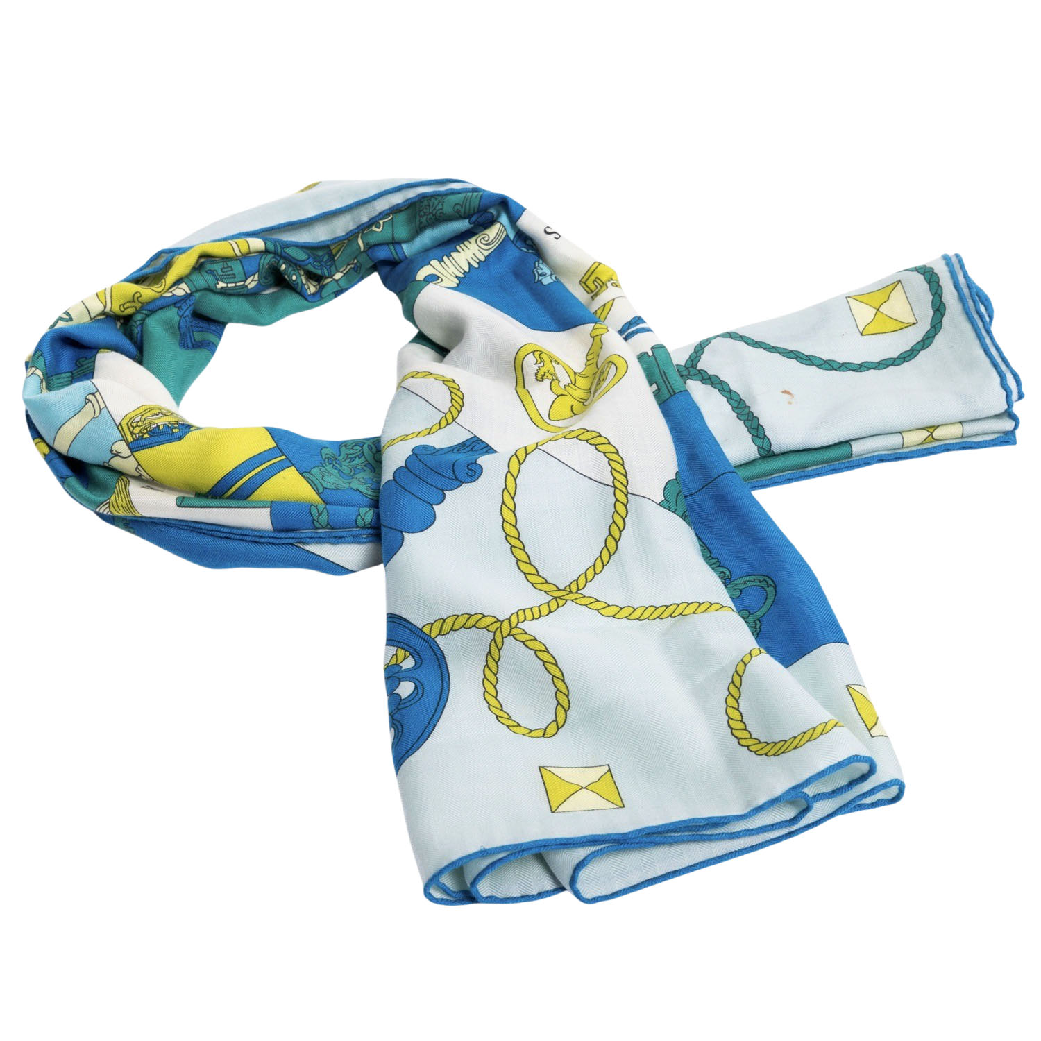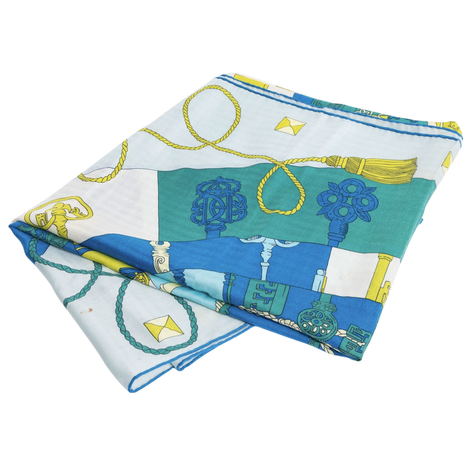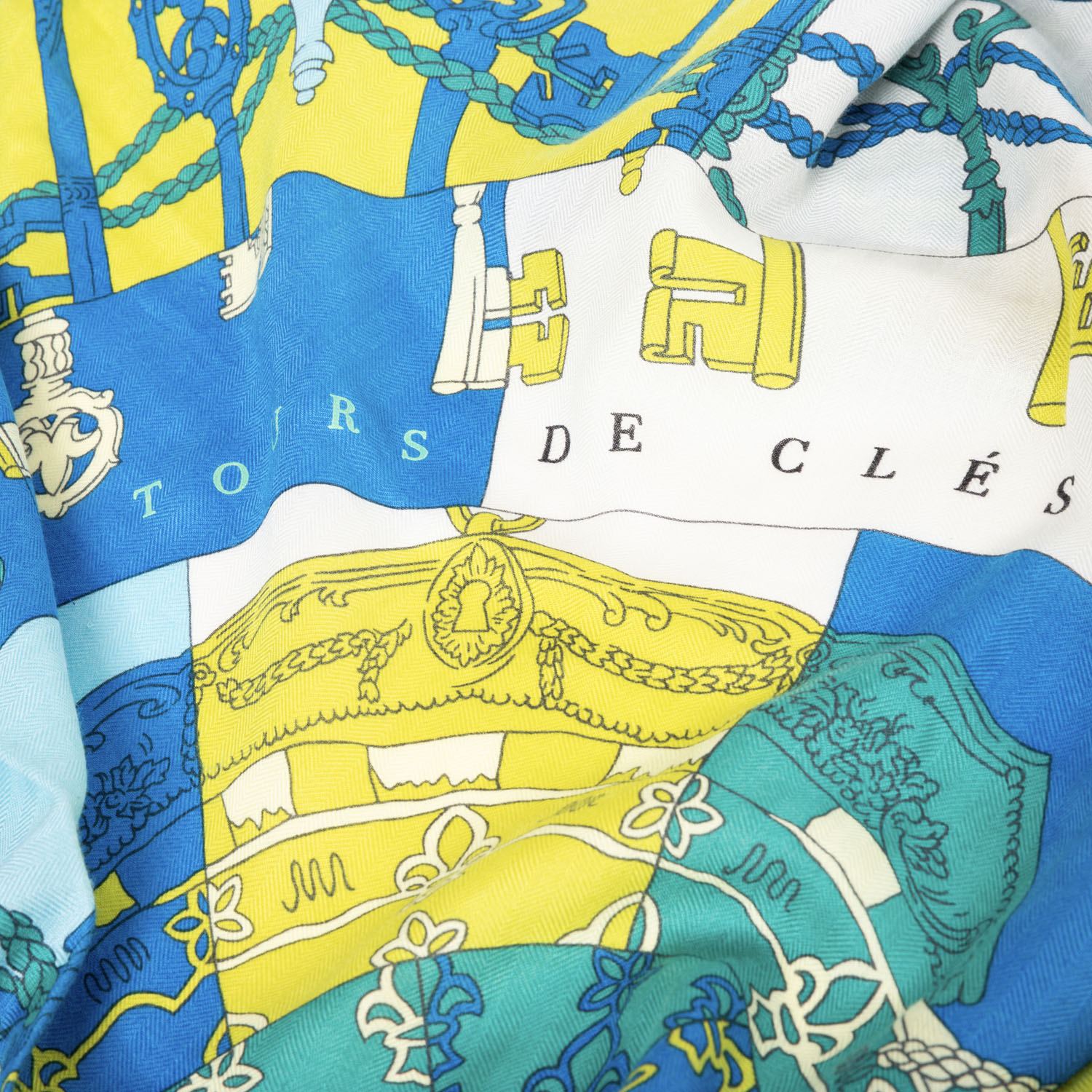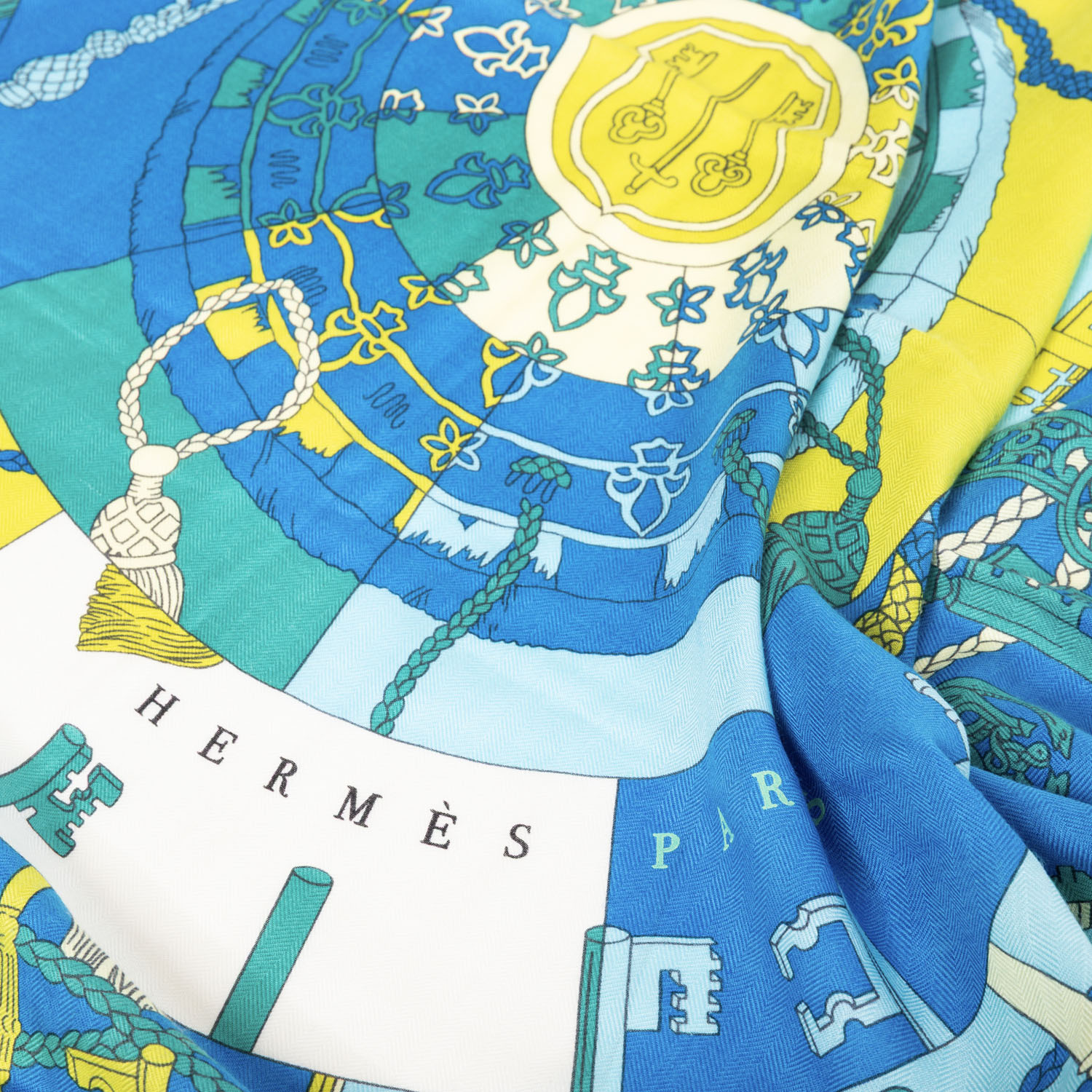 HERMÈS “TOURS DE CLÉS” scarf. By Cyrille Diatkine, design first released in 2010. 65% cashmere, 35% silk. Multicolor key motif on a light blue background. Hand-rolled hem. 140x140cm. Signs of use.