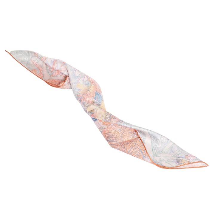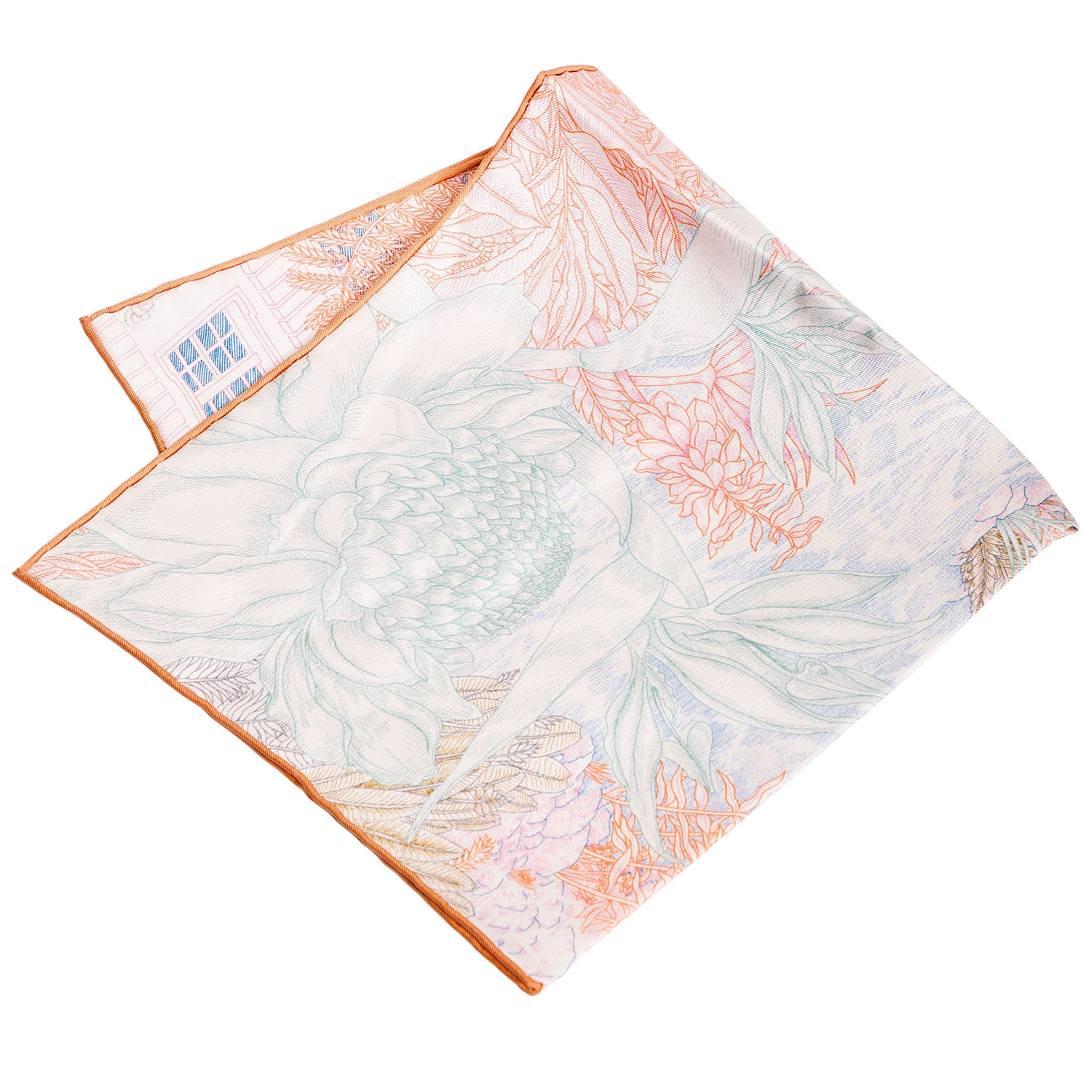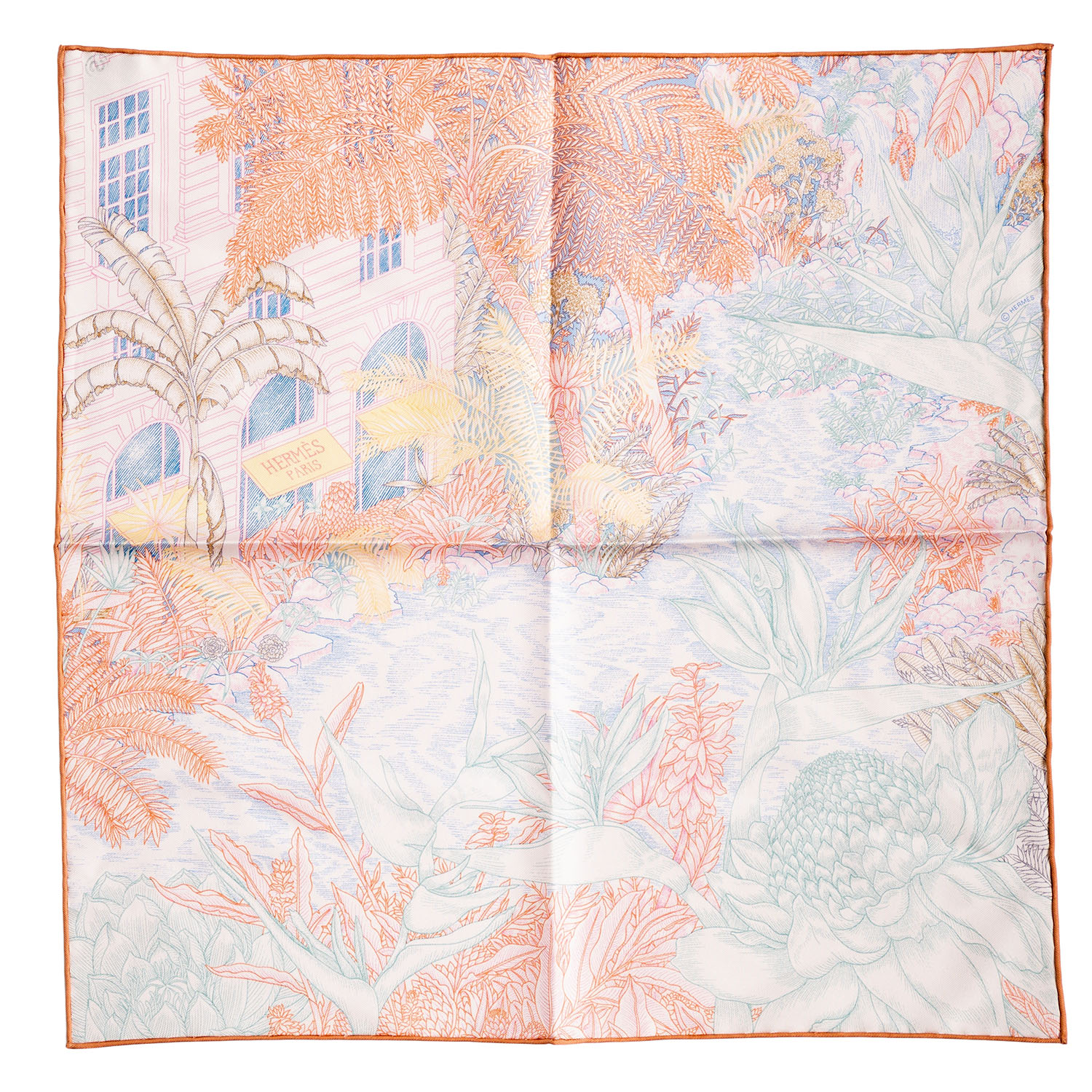 HERMÈS Gavroche ' FAUBOURG TROPICAL DÉTAIL', by Théo de Gueltzl and Octave Marsal. Current price: €240. 100% silk. A lush, imaginative jungle unfolds above the rooftops of the Hermès building on Rue du Faubourg Saint-Honoré. Hidden among the flora and fauna is a mischievous horseman setting off from the Parisian rooftop into the tropical forest. 45 x 45 cm. Hand-rolled hems. Like new.