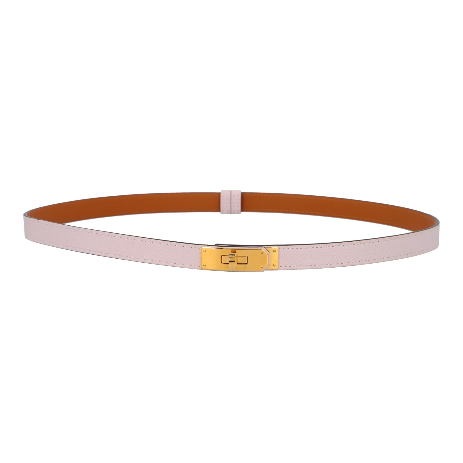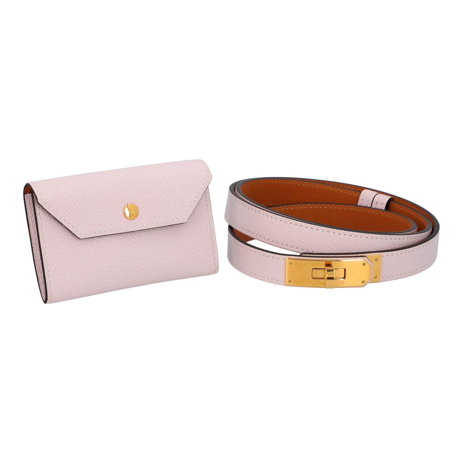 HERMÈS belt “KELLY POCKET 18”. Coll. 2024. Current retail price: €1,600. Mauve Pale Epsom calfskin leather with gold-plated hardware. Classic Kelly belt with small pouch. Very good condition.