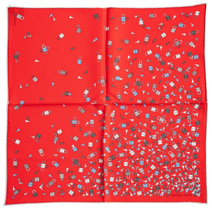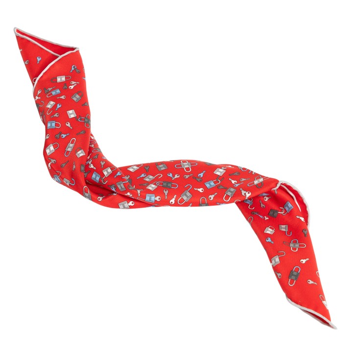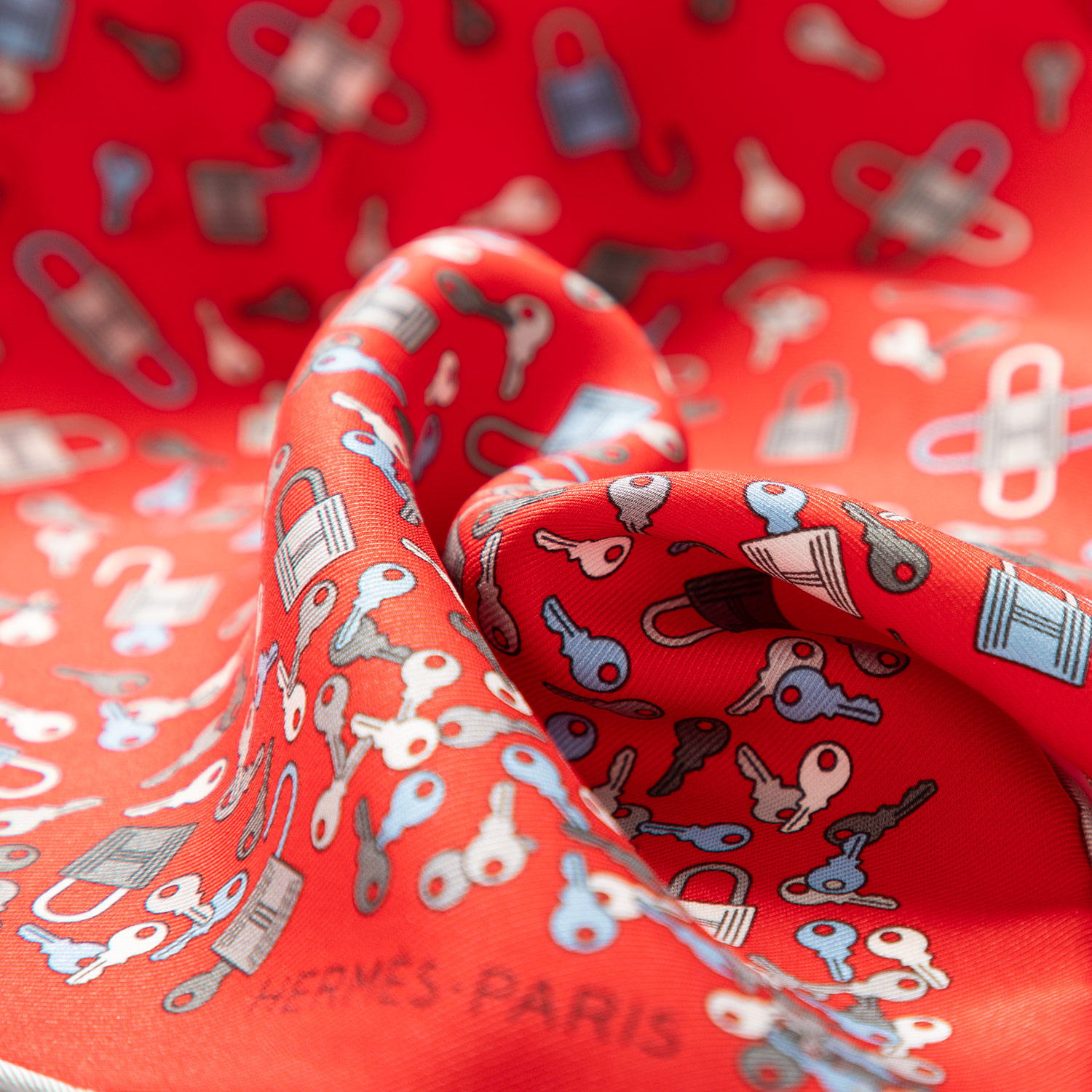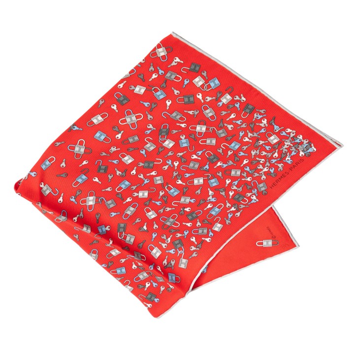 HERMÈS Pocket square 45 ‘N'OUBLIE PAS TES CLES’ by Sandy Queudrus. Current retail price: €190. 100% silk. Key motif on red background. 42 x 42 cm. Hand-rolled hems. Like new.