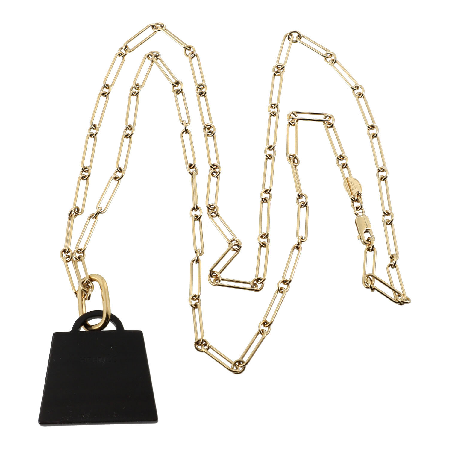 HERMÈS ‘AMULETTE KELLY’ necklace. Large model. No longer available. Length 41cm. Gold-coloured, fine link chain with Kelly pendant in black. Dust bag enclosed. In good condition.