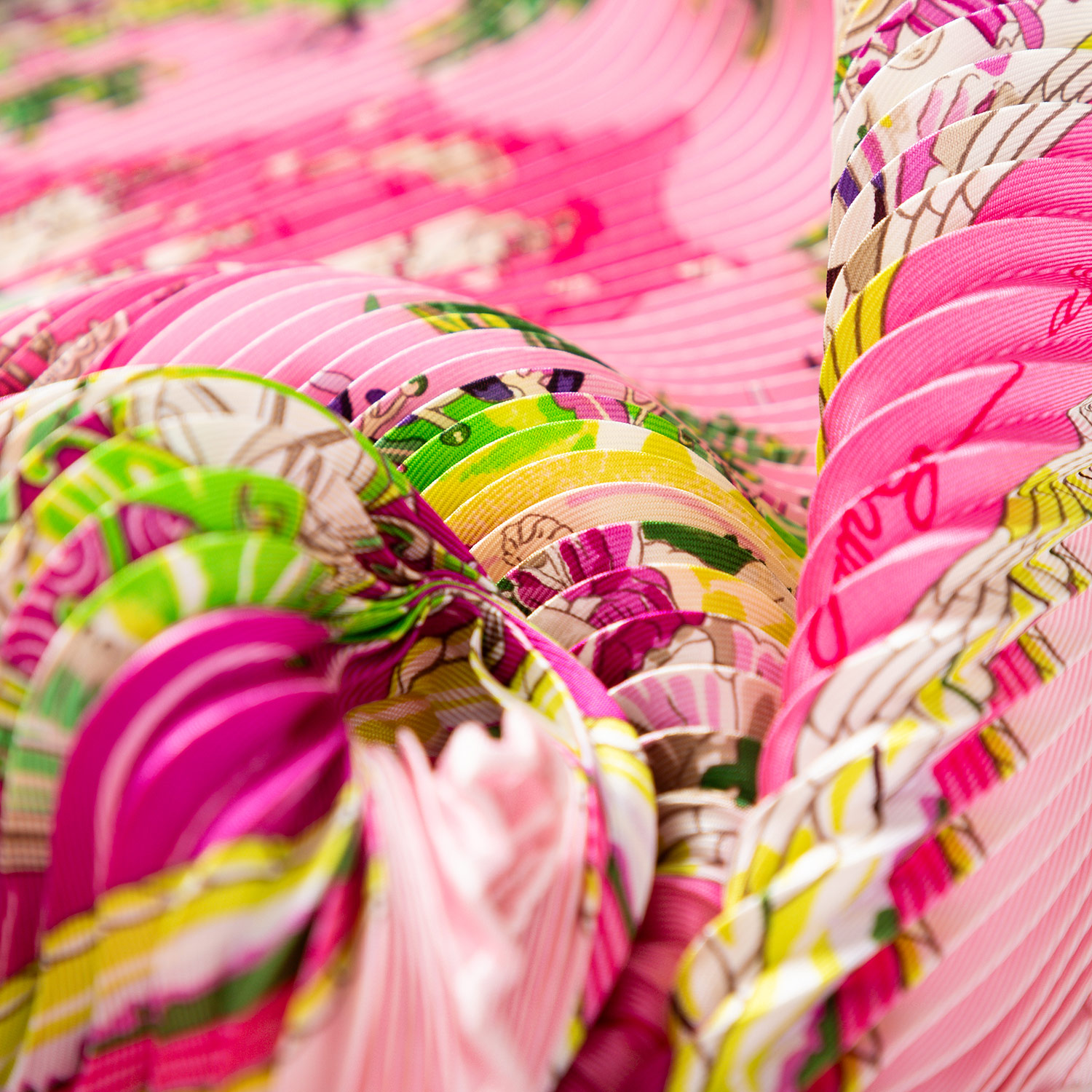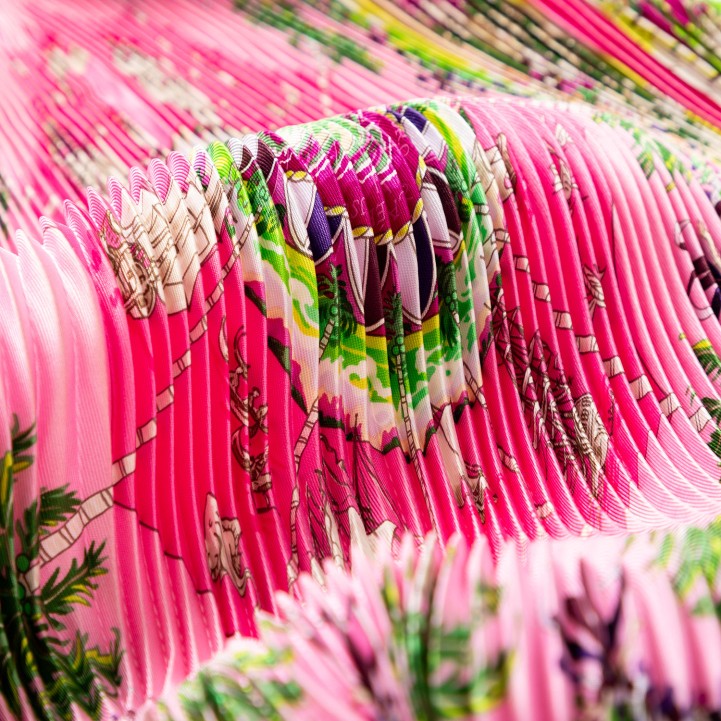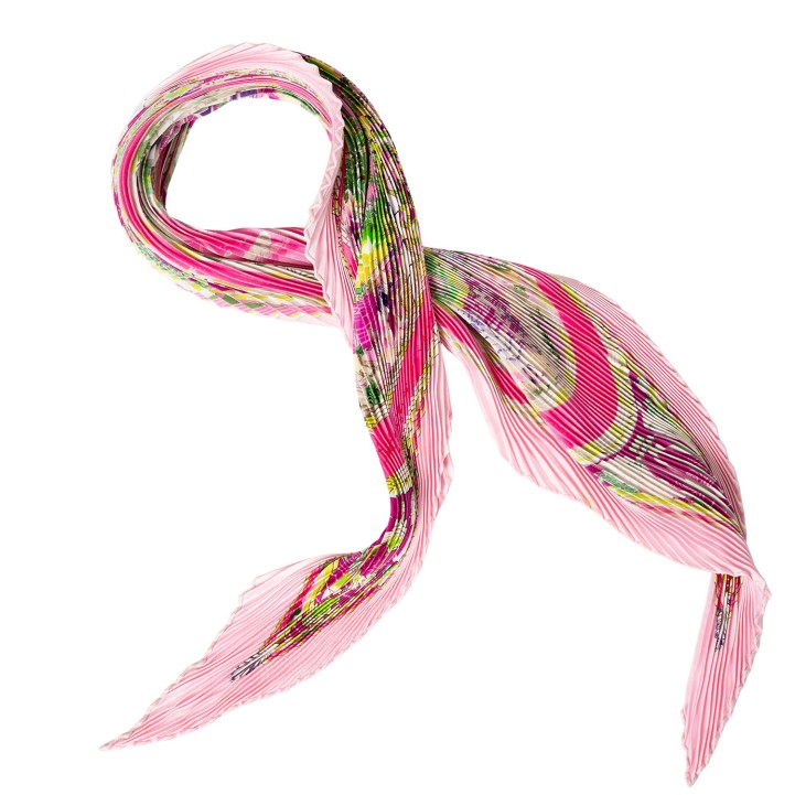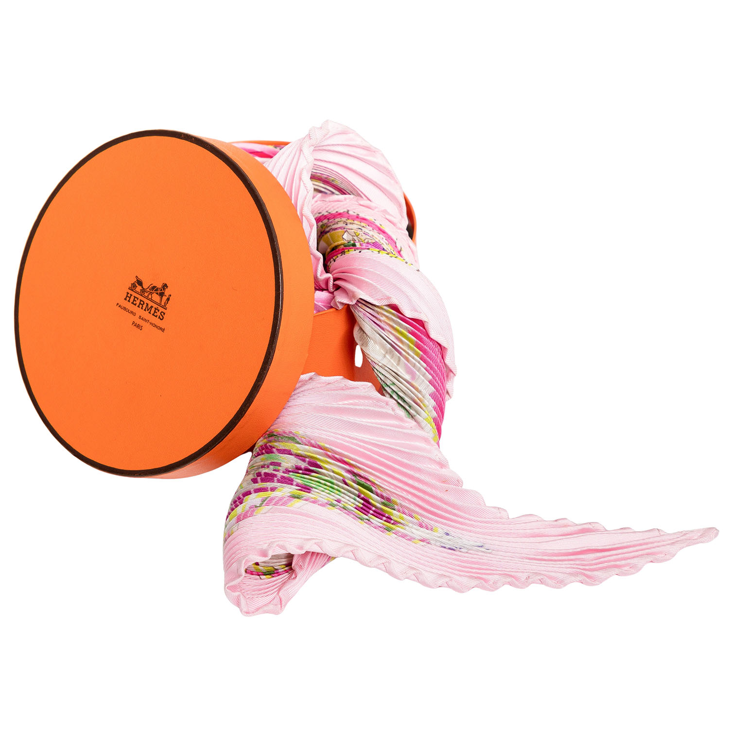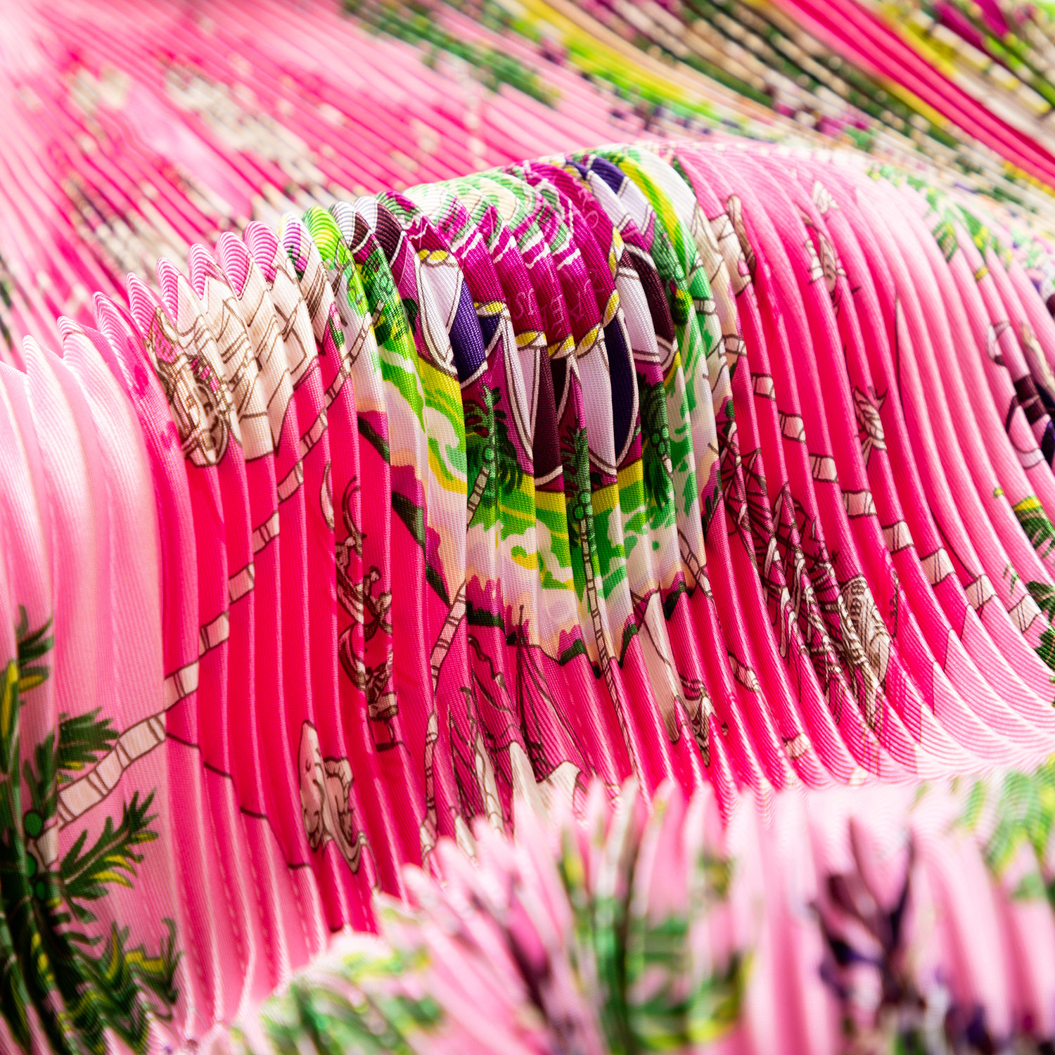 HERMÈS pleated silk square “PER ASTRA AD ASTRA.” Designed by Sandra Laroche, first released in 2009. 100% pleated silk. Nautical motif on a pink background with detailed multicolor pattern. Box included. Very good condition. 90x90cm