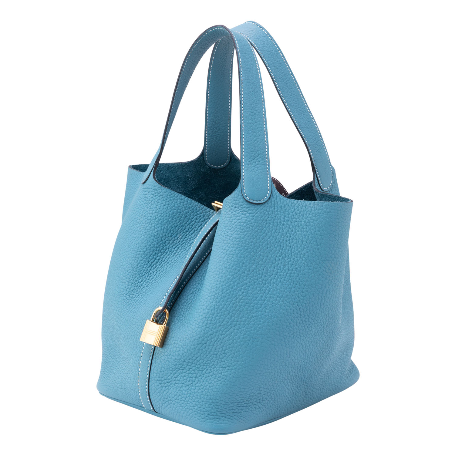 HERMÈS bucket bag 'PICOTIN 22', coll.: 2024. Clemence leather series in Bleu Jean colour with gold-plated hardware, double handles and strap closure. Dust bag included. Lock on the bag without key. Slight abrasion and stains on the bottom.