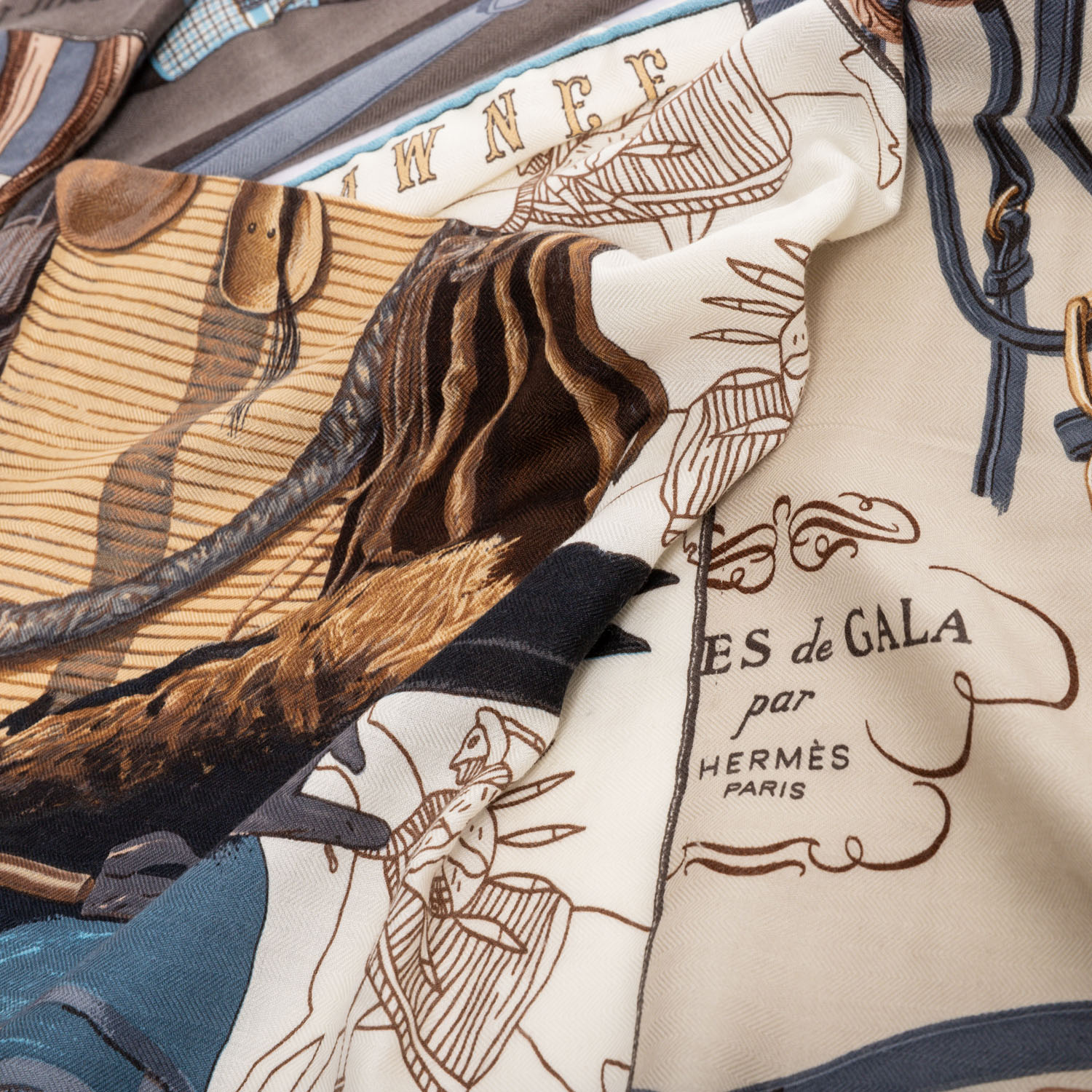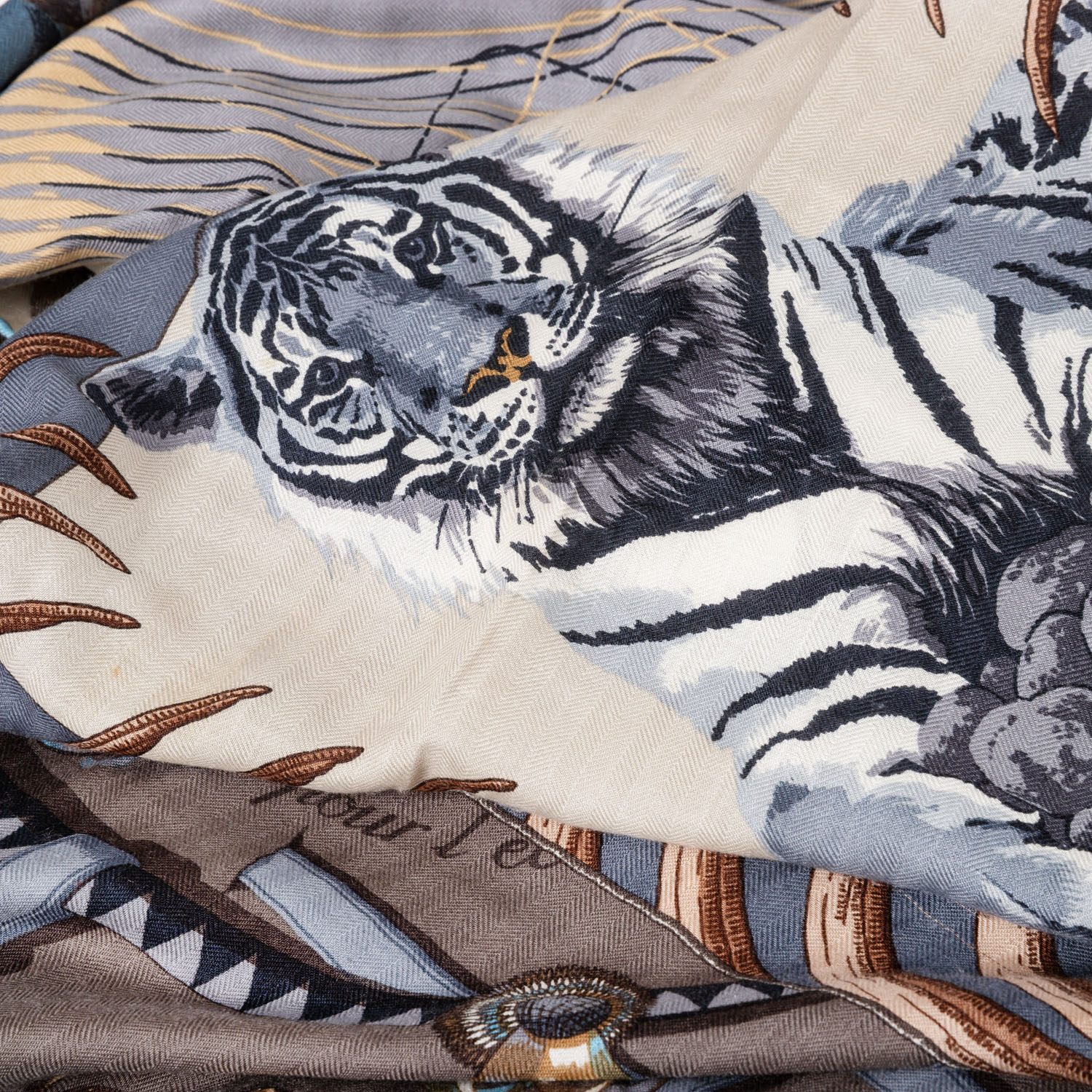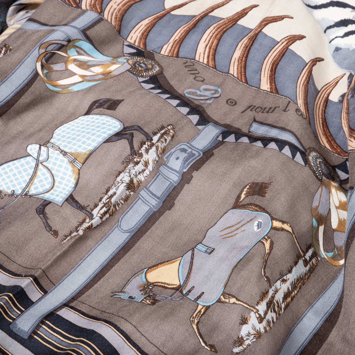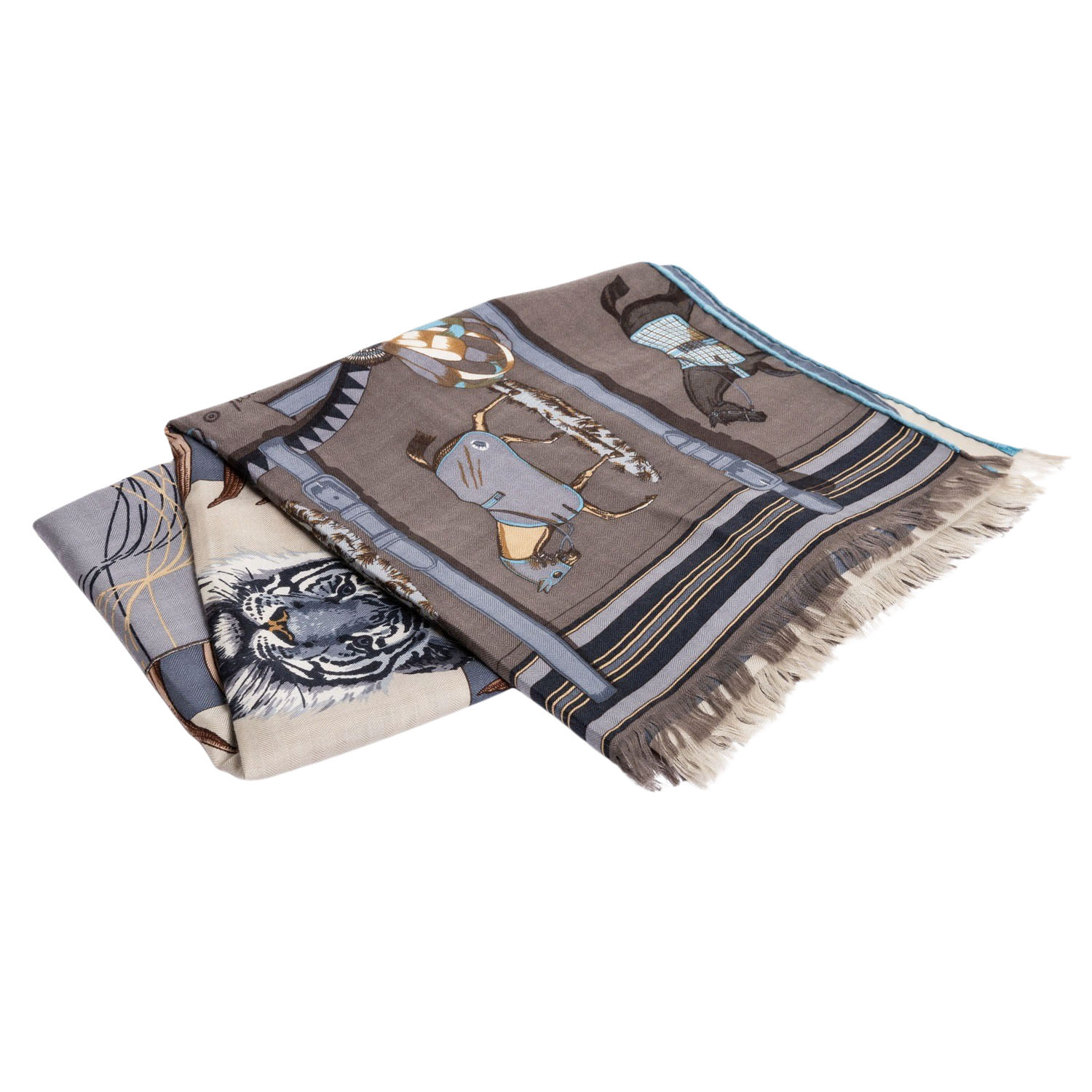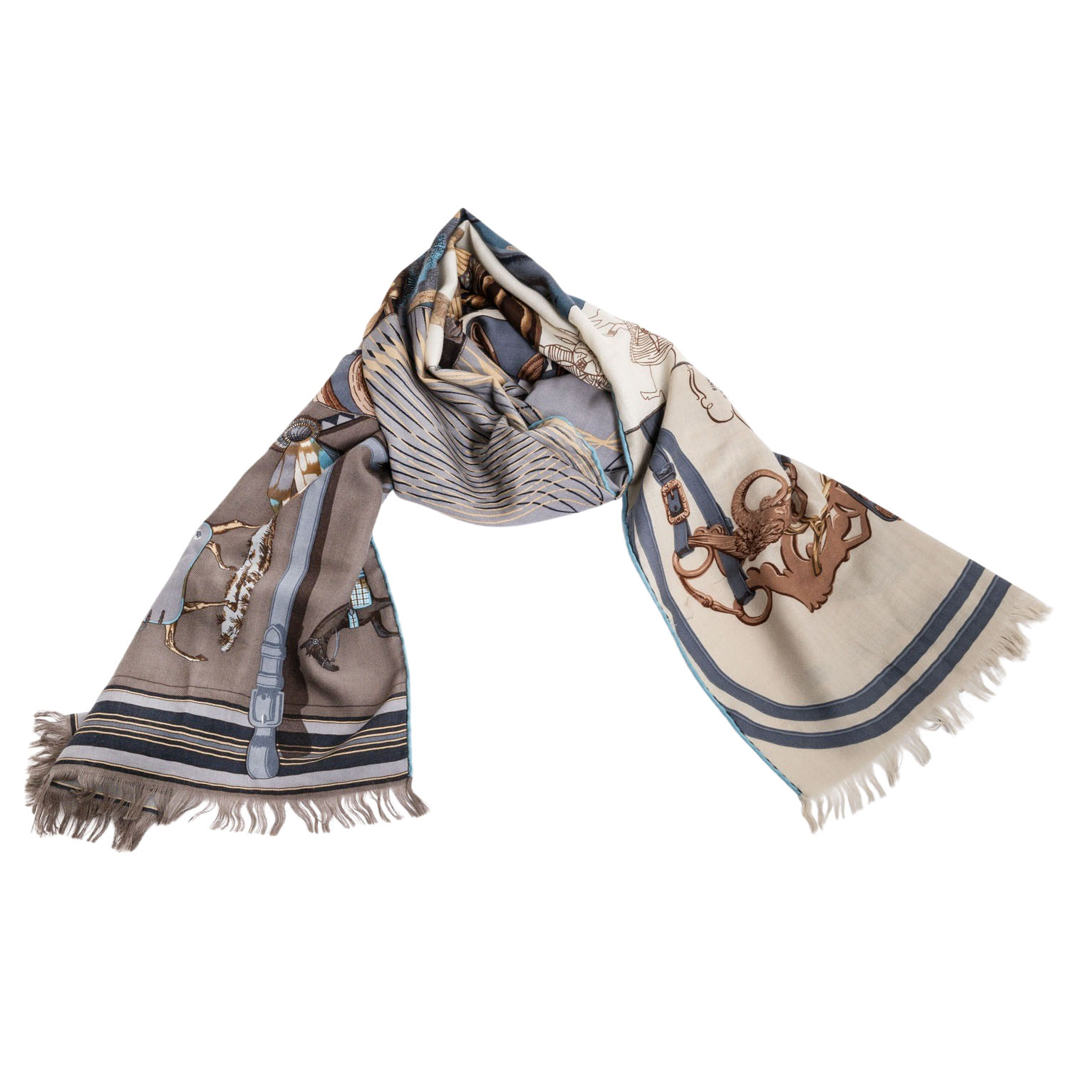 HERMÈS scarf 'CARRE EN CARRES'. Designed by Bali Barret, first released in 2008. “BRIDES DE GALA,” “TIGRE ROYAL,” “LES VOITURES NOUVELLES,” “PANI LA SHAR PAWNEE,” and “H CINETIQUE.” Opaque base colors in gray/brown/beige with fringed edges. Hand-rolled hem. Slight signs of wear and loose threads present. 65x170cm.