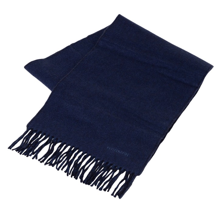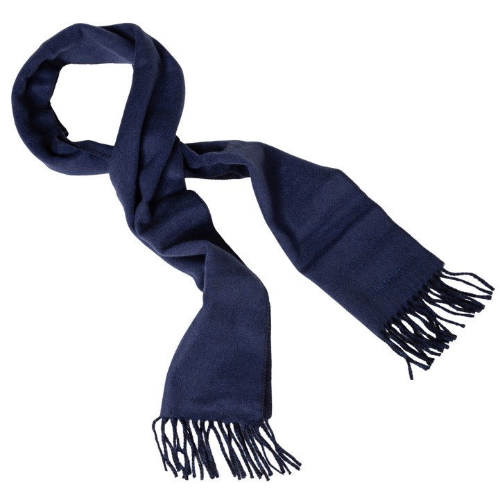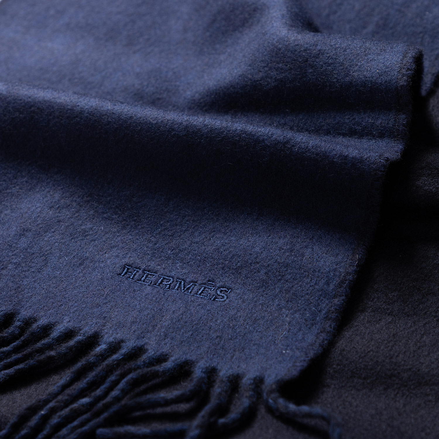 HERMÈS scarf “RECTO-VERSO,” length 25x150cm. Current retail price: €570. 100% cashmere in ocean/navy blue with fringed edges. Like new condition with box.