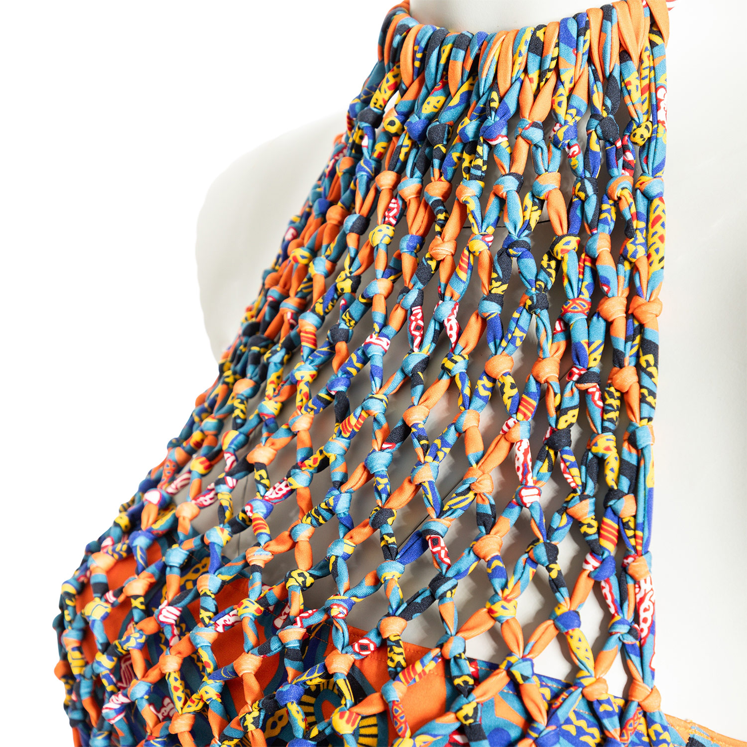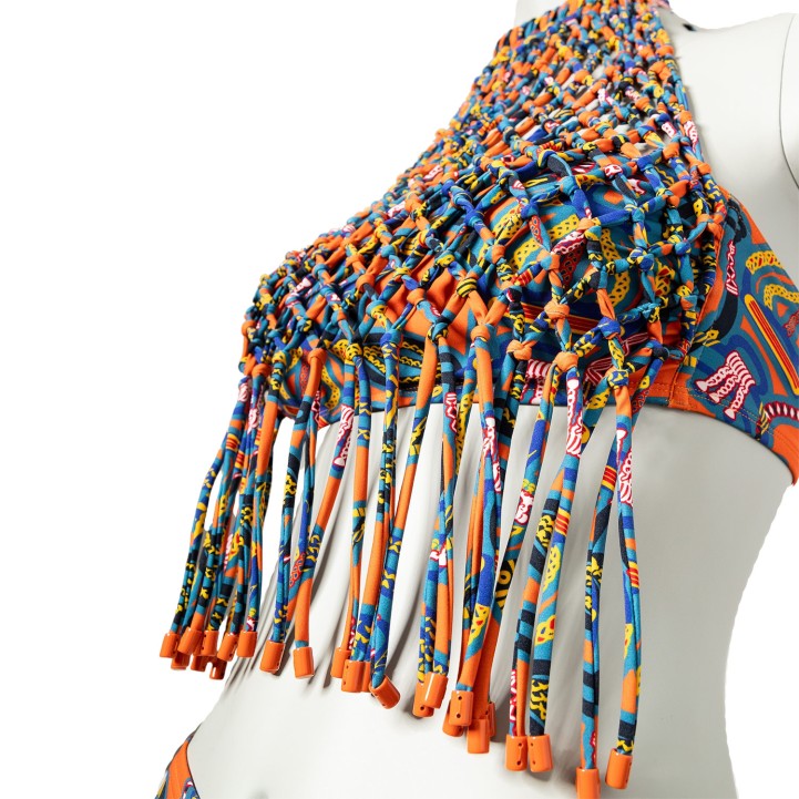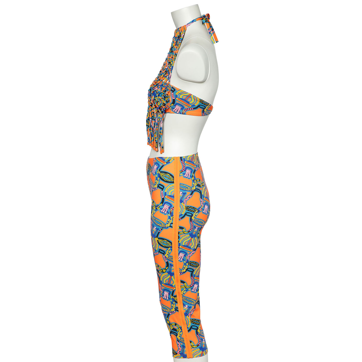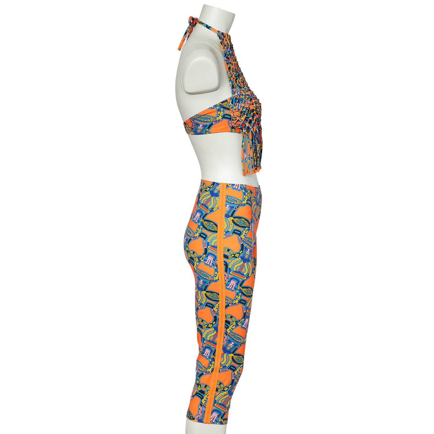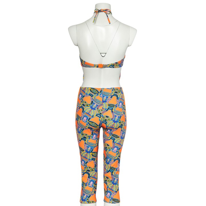 HERMÈS Set, size 38, retail price: 1.580,-€. 3/4 leggings and halterneck top in orange with multicoloured print. Inserts included. New with label.