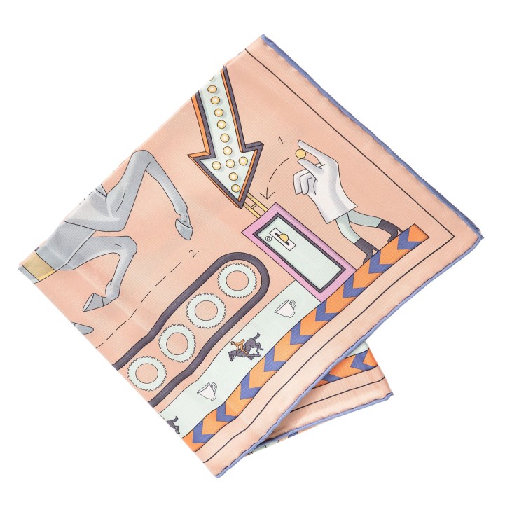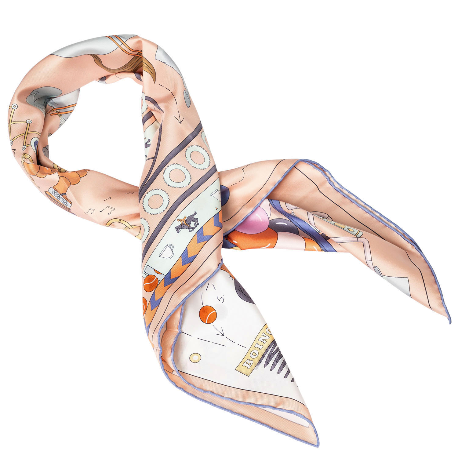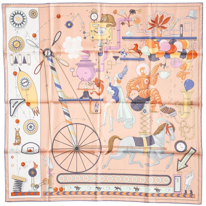 HERMÈS silk scarf 'TEA FOR TWO', by Jonathan Burton. Current price: €530. 100% silk, tick-tock, four o'clock – time for tea with magic vitamins! Jonathan Burton's superheroine inserts a coin and the crazy machine starts up: clack, clang, clink. It works like clockwork – most of the time. Sometimes it needs the paw of a grumpy tomcat or help from an astronaut and a horse. 90 x 90 cm. Hand-rolled seams. Like new.