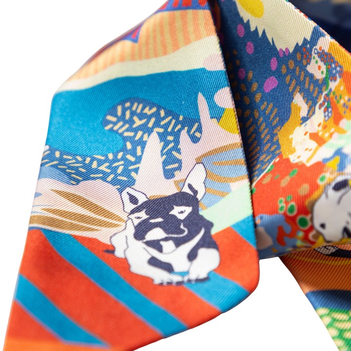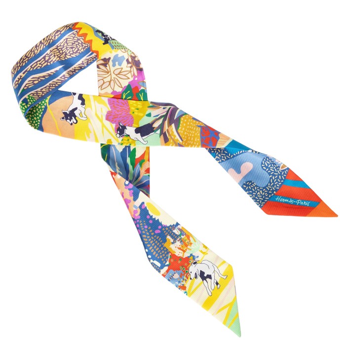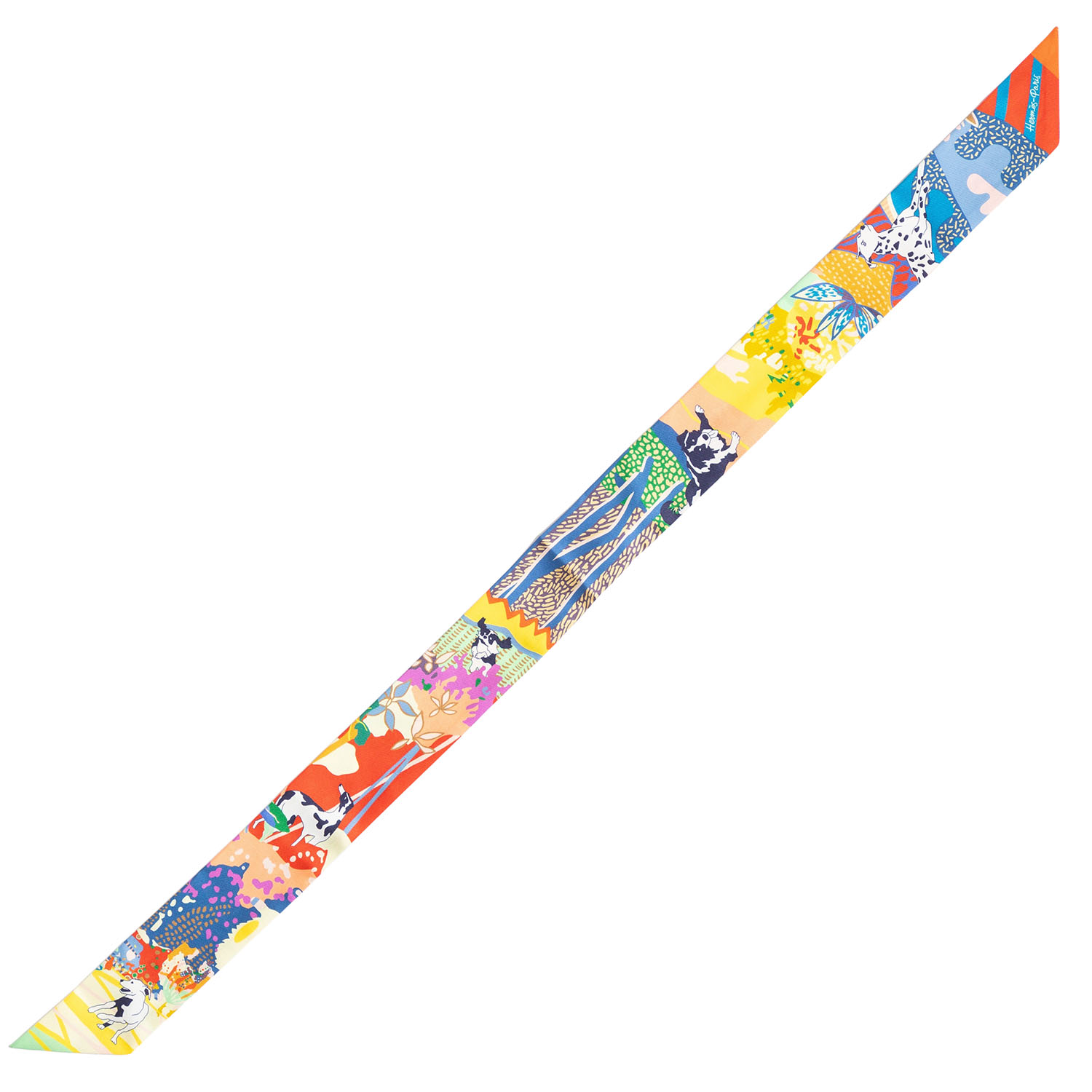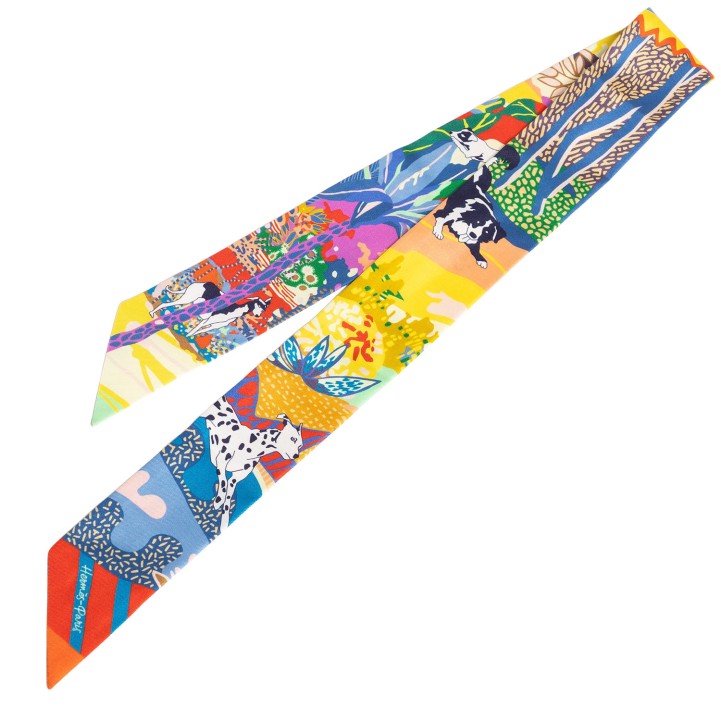 HERMÈS Twilly 'EN LIBERTE', by Carine Brancowitz. Current retail price: €210. 100% silk. A lively dog adventure in the gardens of Villa Borghese: playful four-legged friends, children's laughter, birdsong – surrounded by Rome's lush vegetation. 5 x 86 cm. Like new.