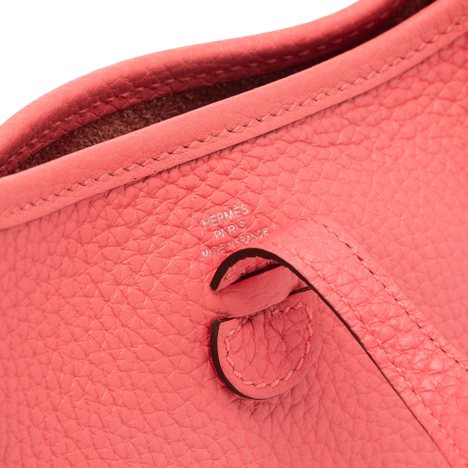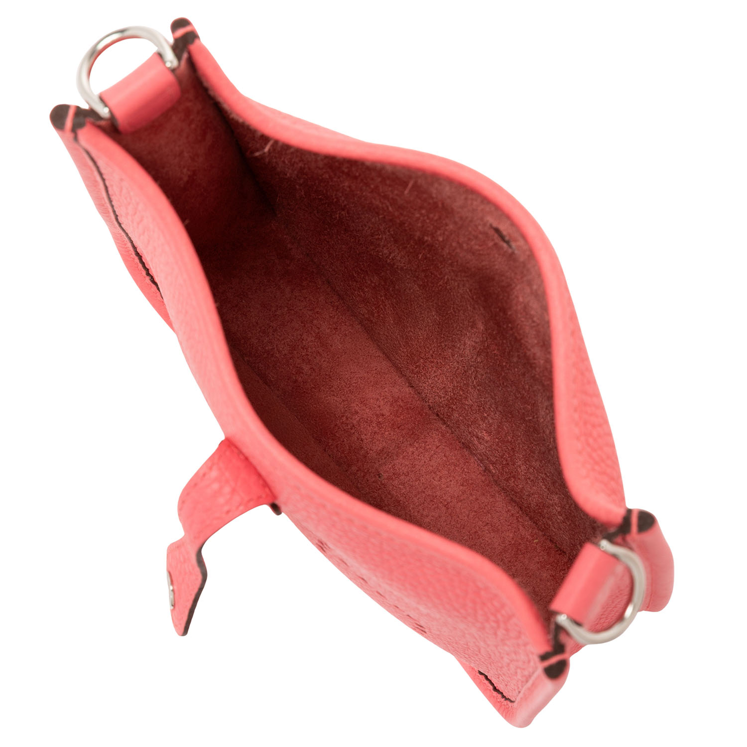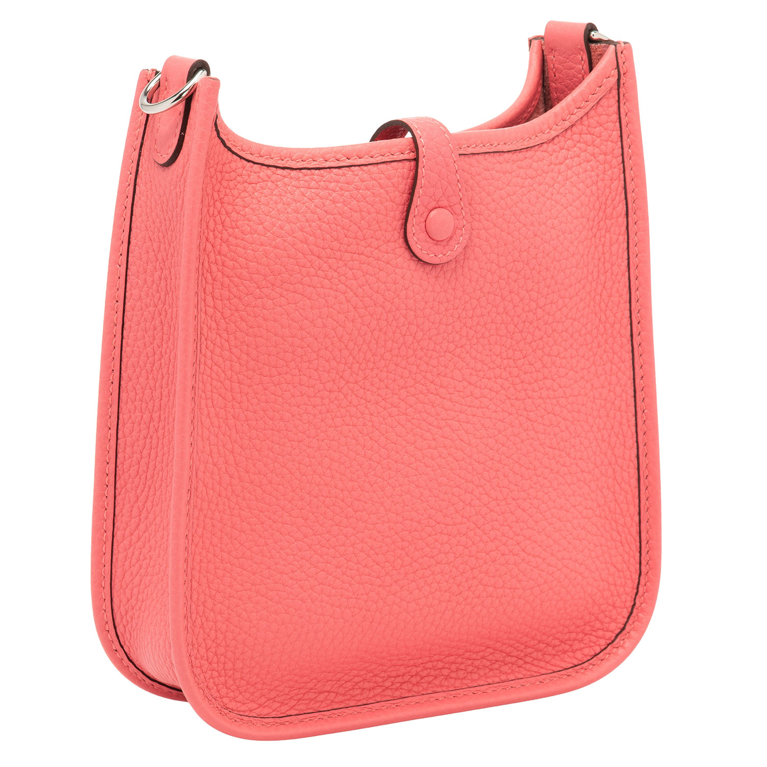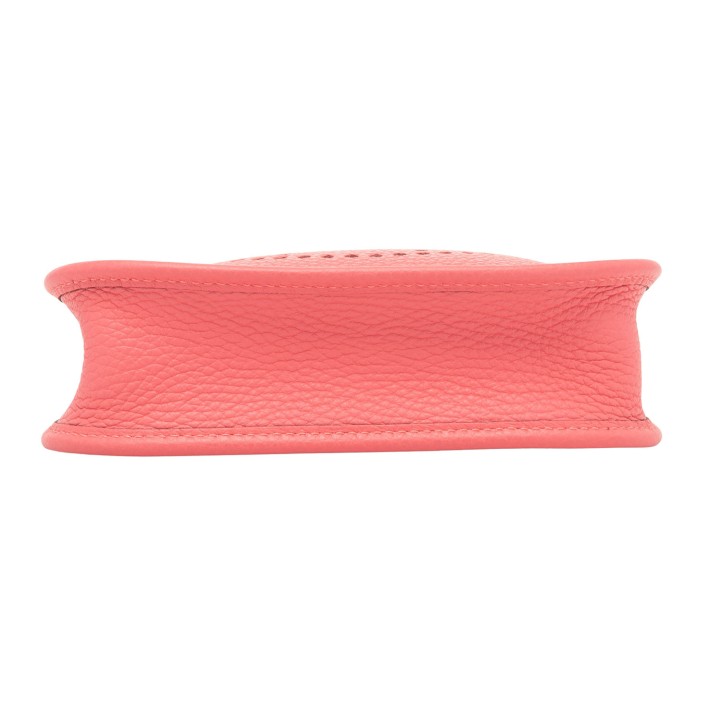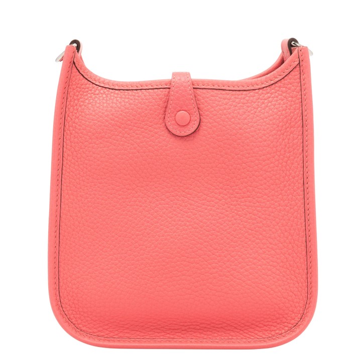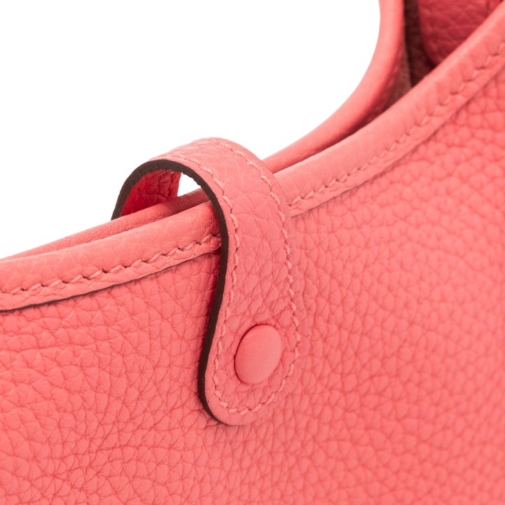 HERMÈS shoulder bag 'EVELYNE TPM 16', coll.: 2020. Clemence leather in rose azalea with palladium-plated hardware, red wool shoulder strap, perforated H on the front and flap with press stud closure.