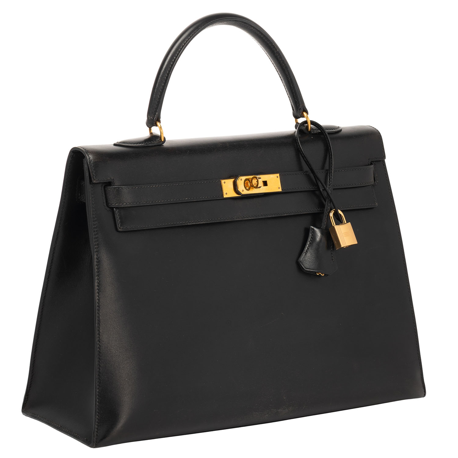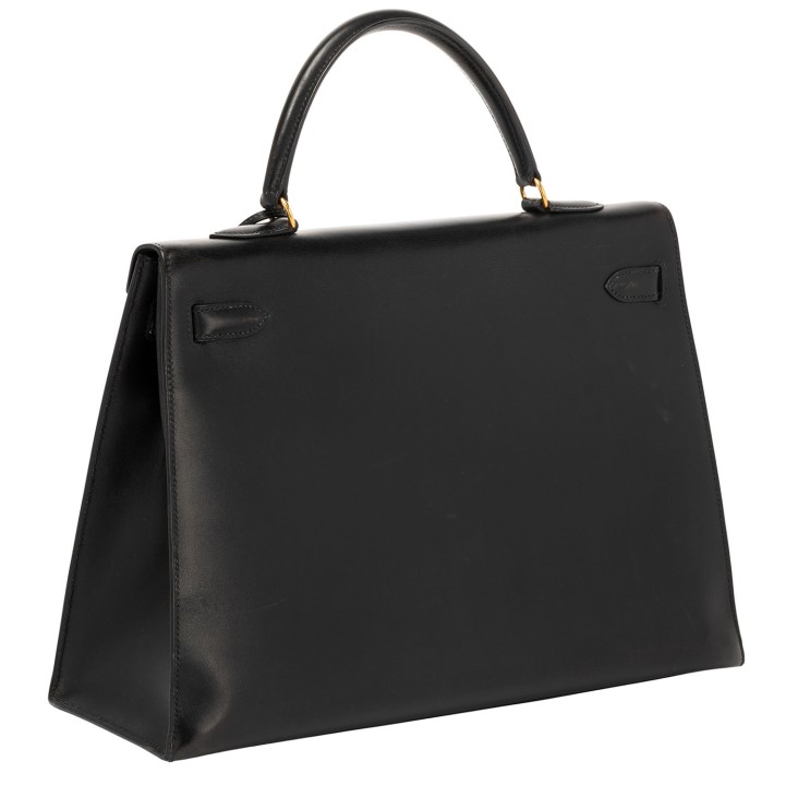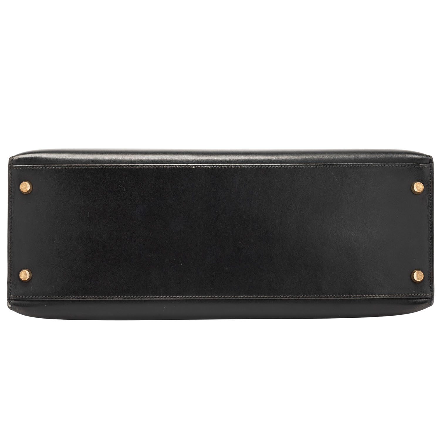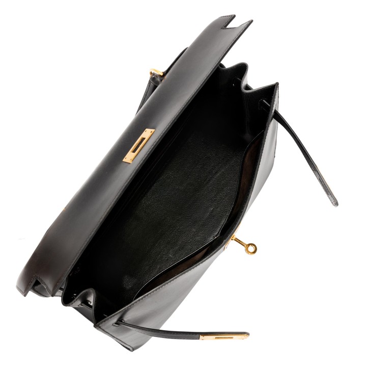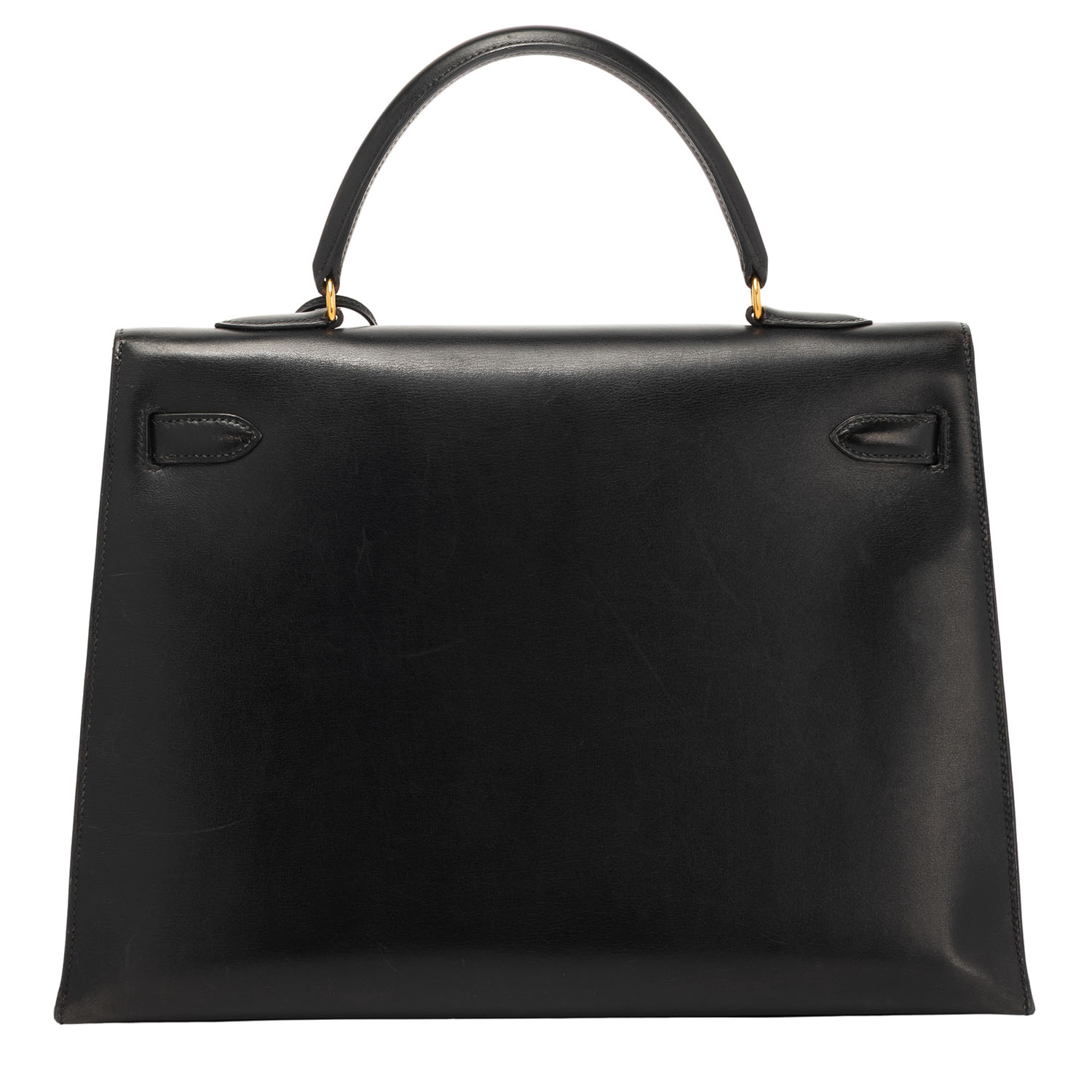 HERMÈS VINTAGE bag 'KELLY BAG SELLIER 35', coll.: 1996. Box calf leather in black with gold-plated hardware, one handle, strap closure on the front and removable shoulder strap. Interior with three compartments, one of which has a zip closure. Box, dust bag, papers, keys in Clochette and lock included. Signs of wear, especially on the handle.