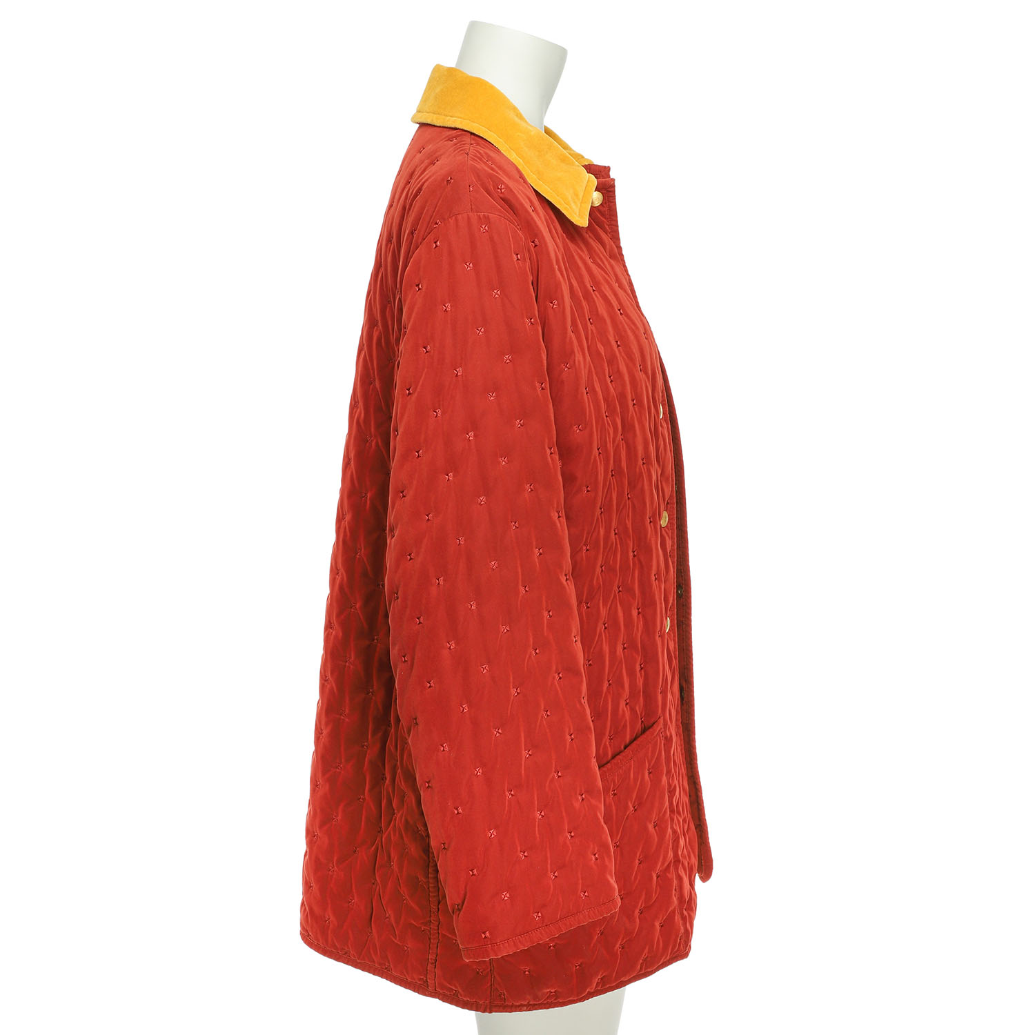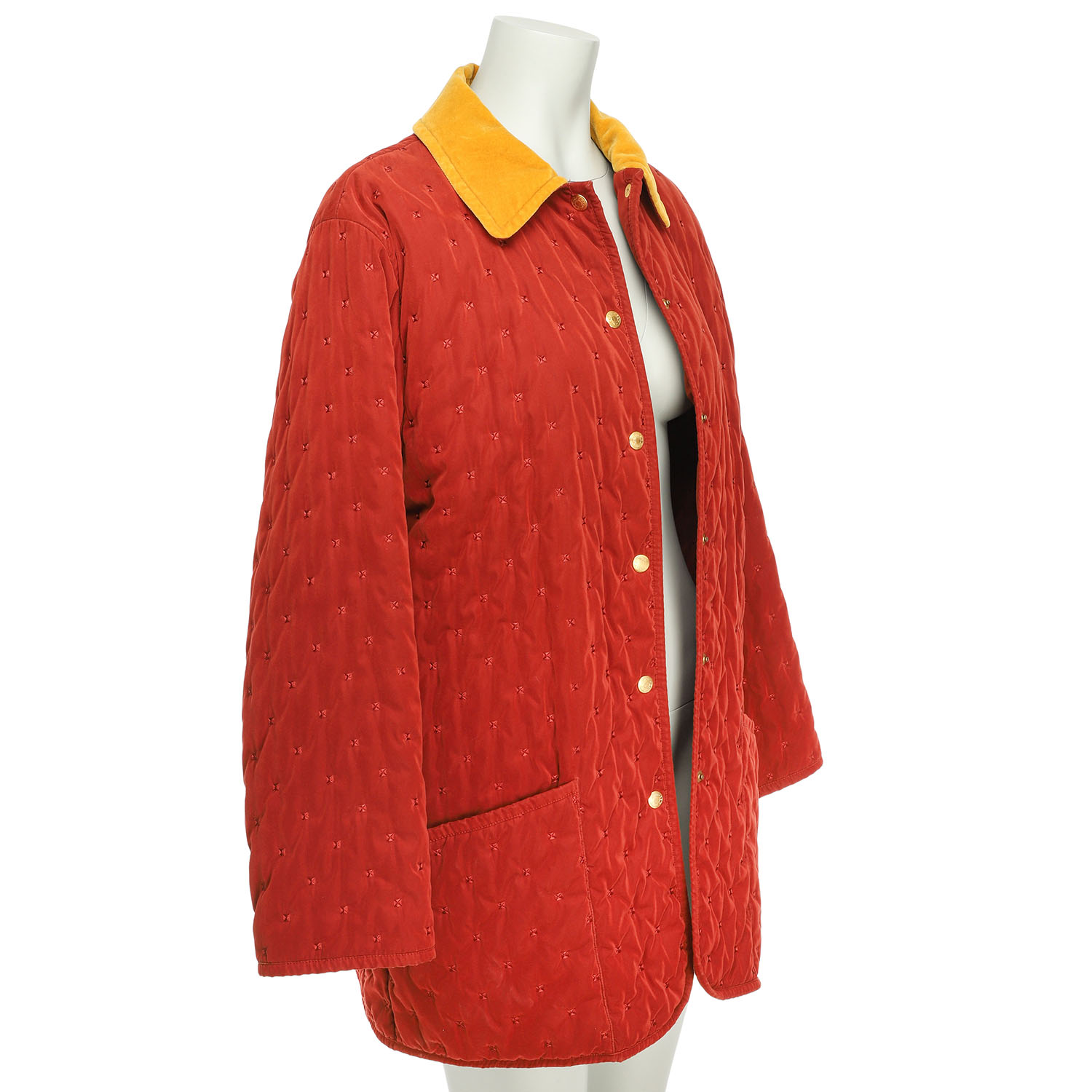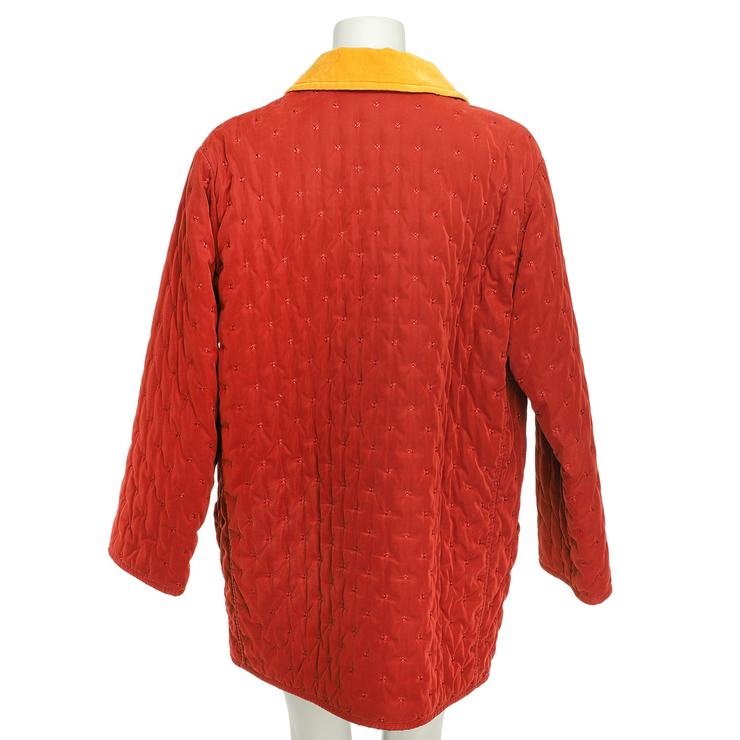 HERMÈS VINTAGE short coat, size 40, Padded fabric in rust red with small, square embroidery. Yellow velvet collar and button placket with gold-coloured press studs. Slight signs of age.