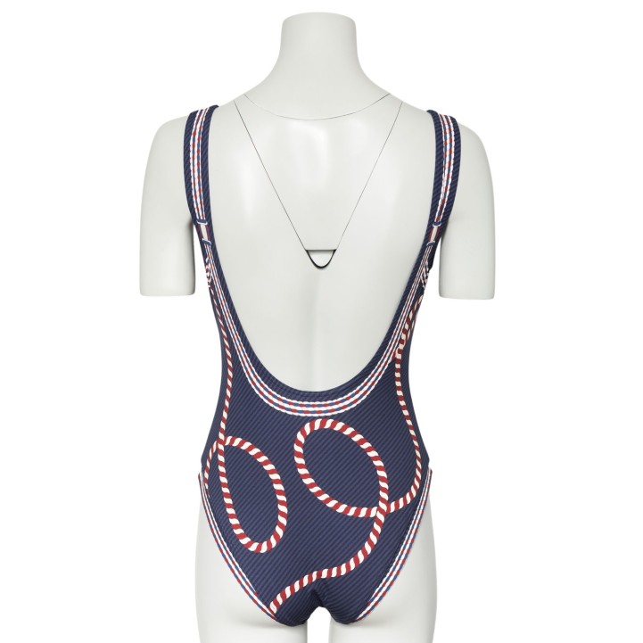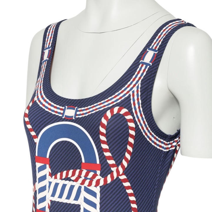 PRE-LOVED ITEM BY @JENNIFERKATHE - HERMÈS “ALEX CANOE” swimsuit, size 38. Coll. 2023. Stretch fabric blend in dark blue with striped pattern and cord motif in dark red/white. Slight signs of wear.
