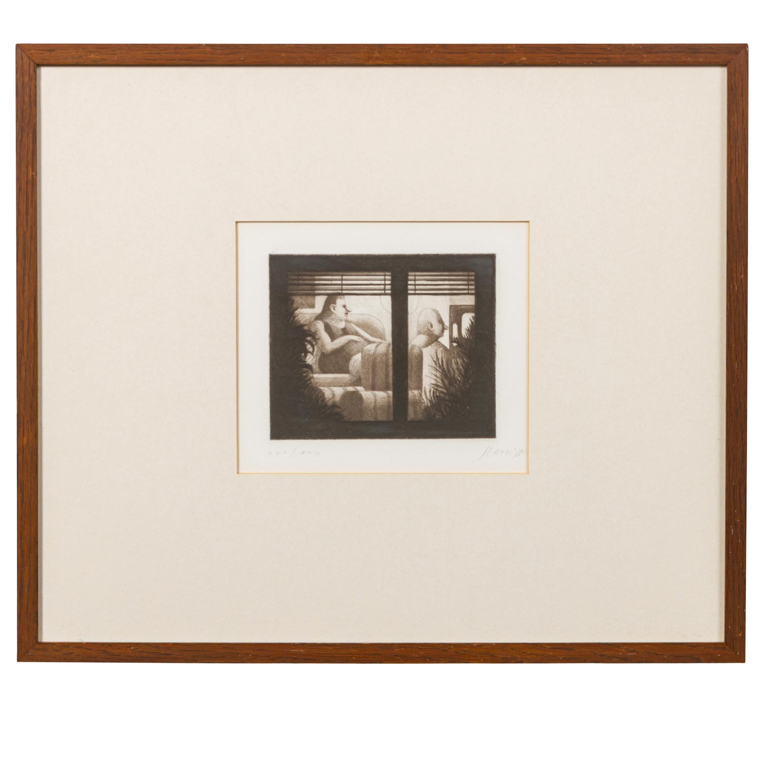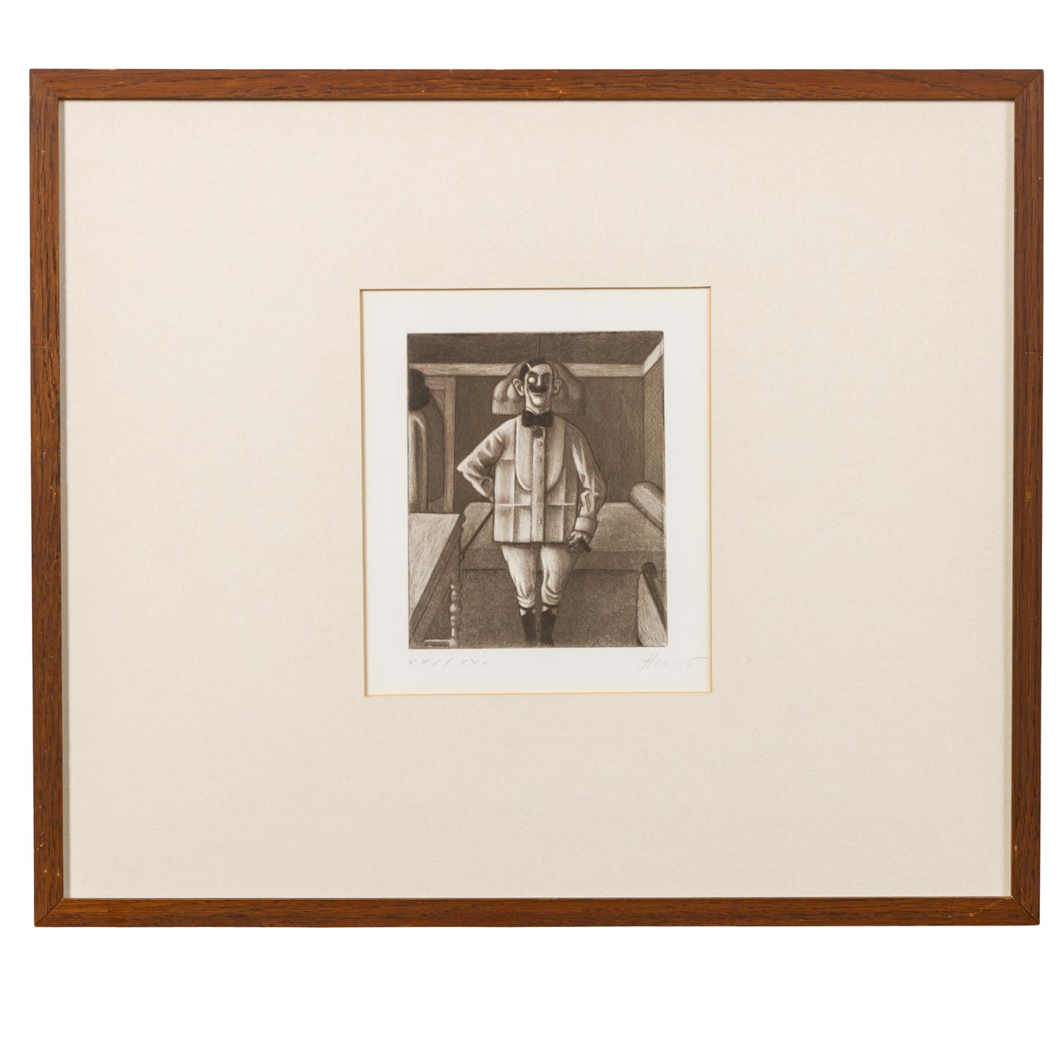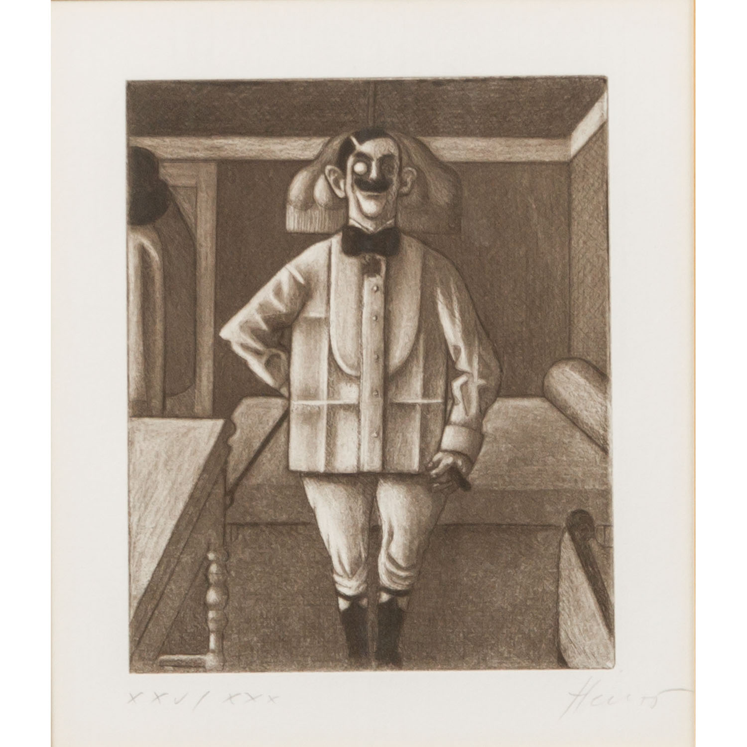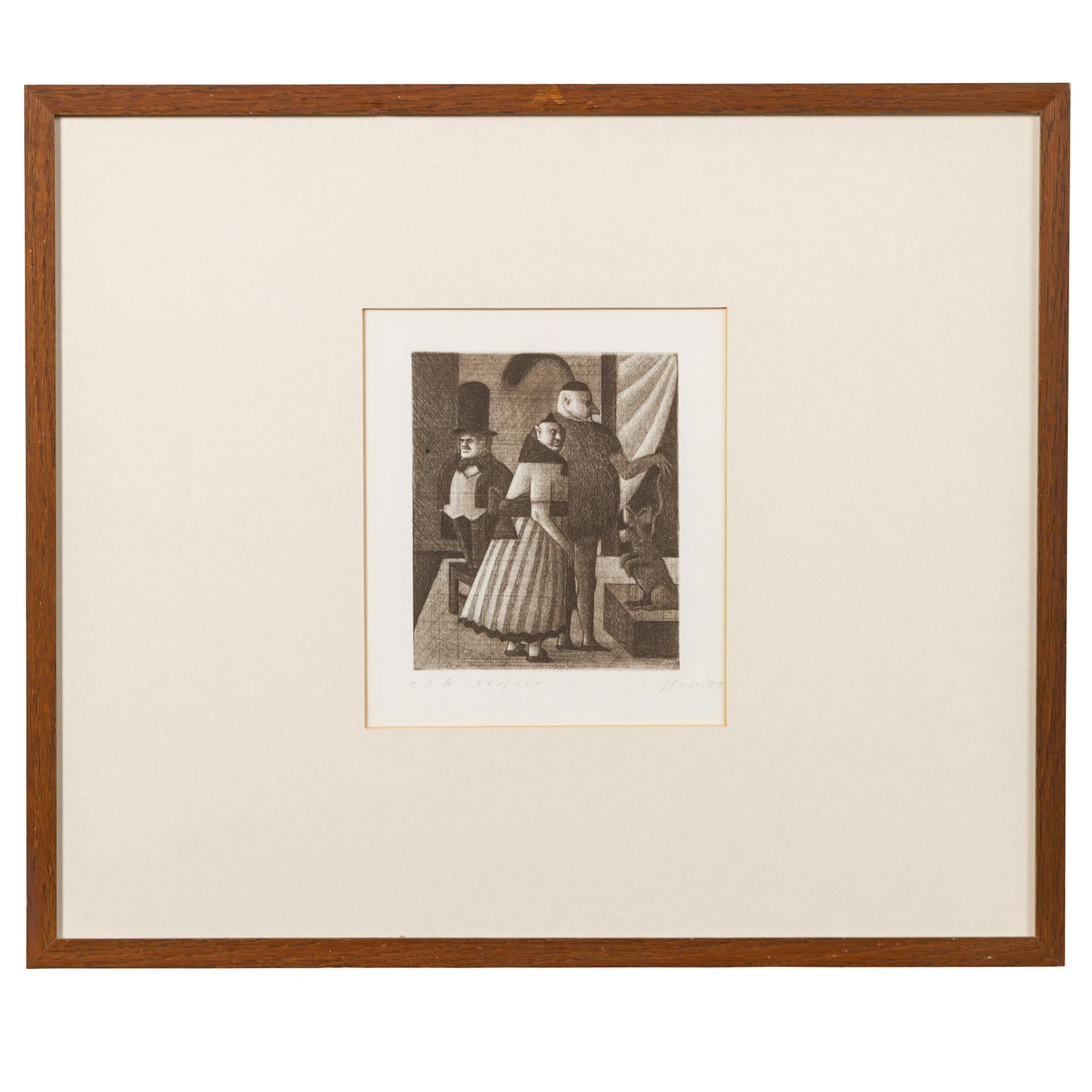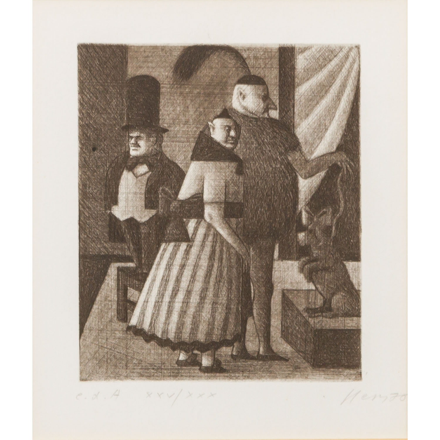 HERZIG, WOLFGANG (born 1941), 3 etchings, 1.) “The Cavalier”, numbered XXV/XXX in pencil by hand lower left, signed in pencil by hand lower right, etching, HxW: plate approx. 16.4x13.4 cm, mat opening approx. 21x18 cm, frame approx. 44.5x52 cm. 2.) ”Television”, numbered XXV/XXX in pencil by hand lower left, signed in pencil by hand lower right, etching, HxW: plate approx. 13.2x16.2 cm, mat opening approx. 18x21 cm, frame approx. 44.5x52 cm. 3) “The top hat man”, numbered E.d.A. XXV/XXX in pencil by hand lower left, signed in pencil by hand lower right, etching, HxW: plate ca. 15.9x13.4 cm, mat opening ca. 21x18 cm, frame ca. 44.5x52 cm. Each with traces of age and rubbing, browned. Each framed behind glass in passepartout (traces of age and rubbing).