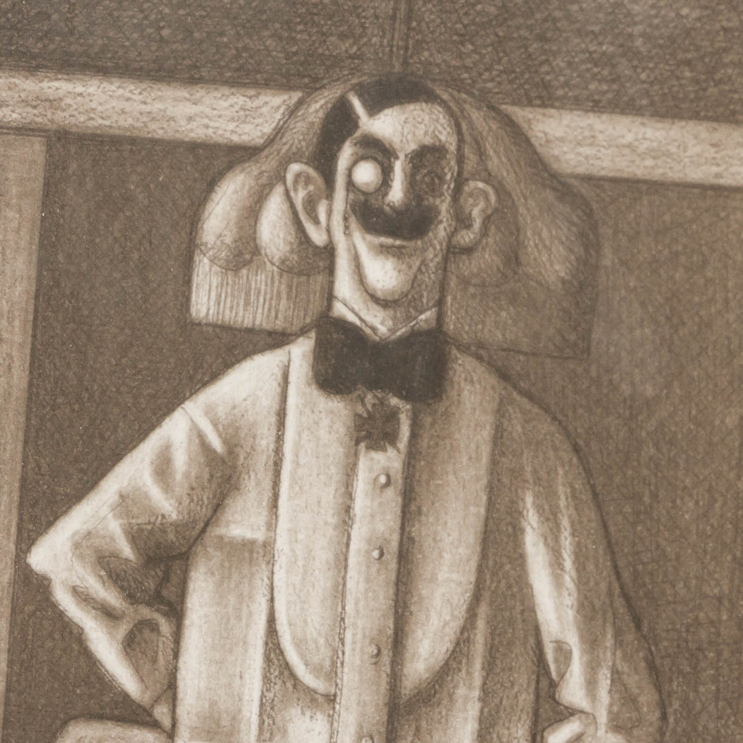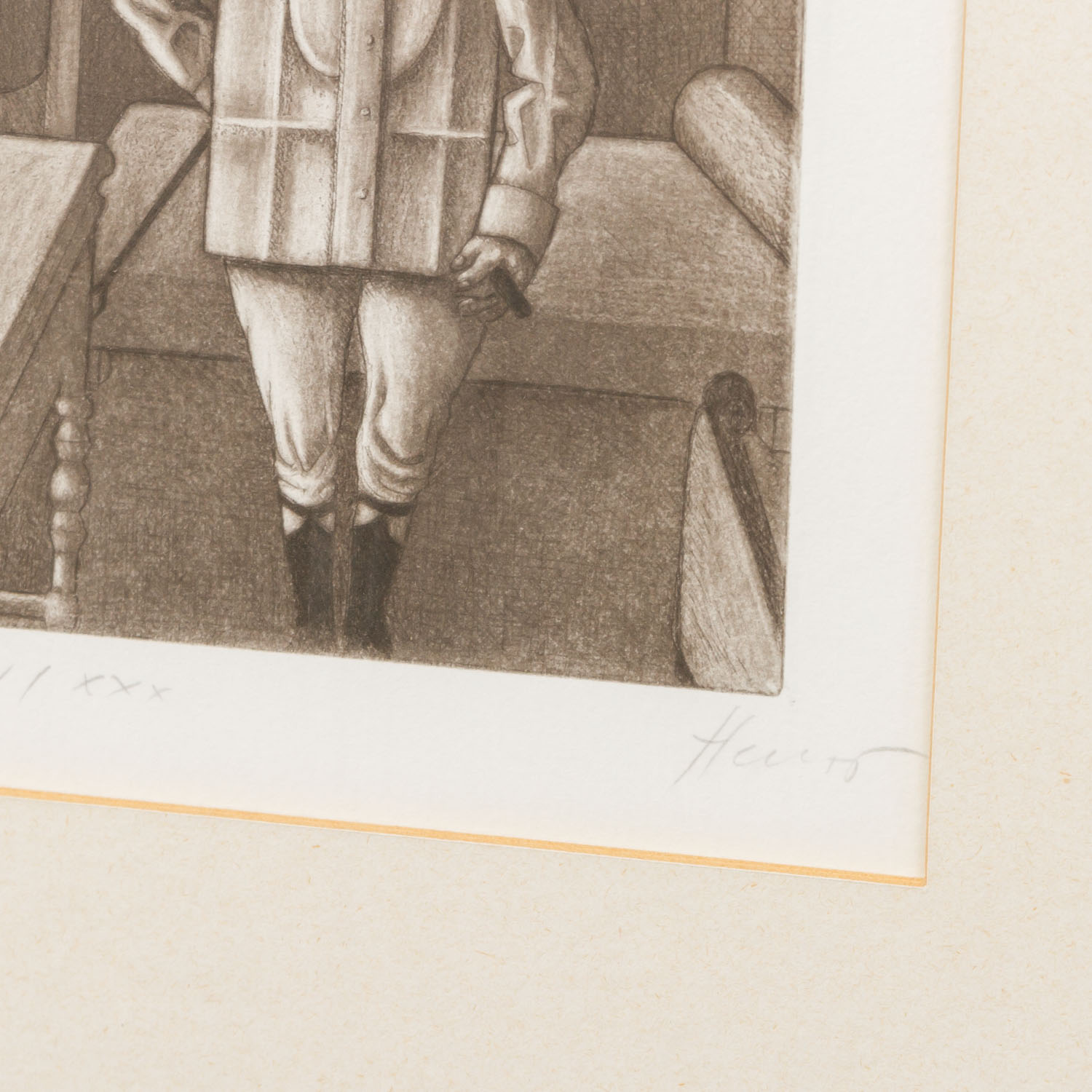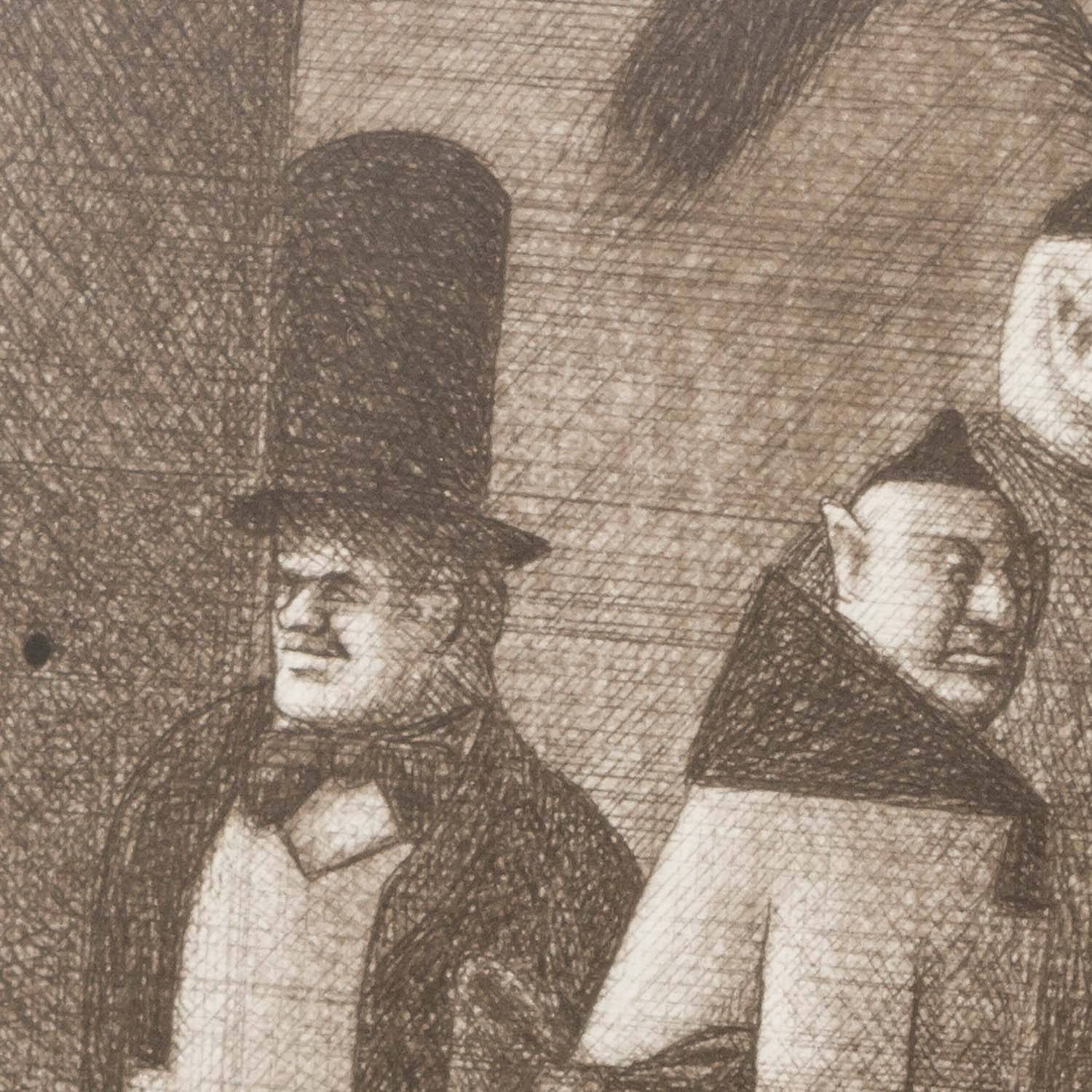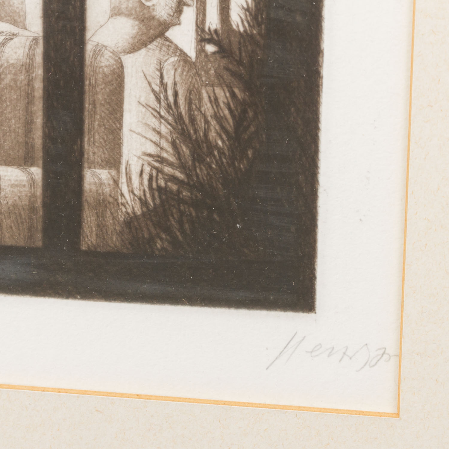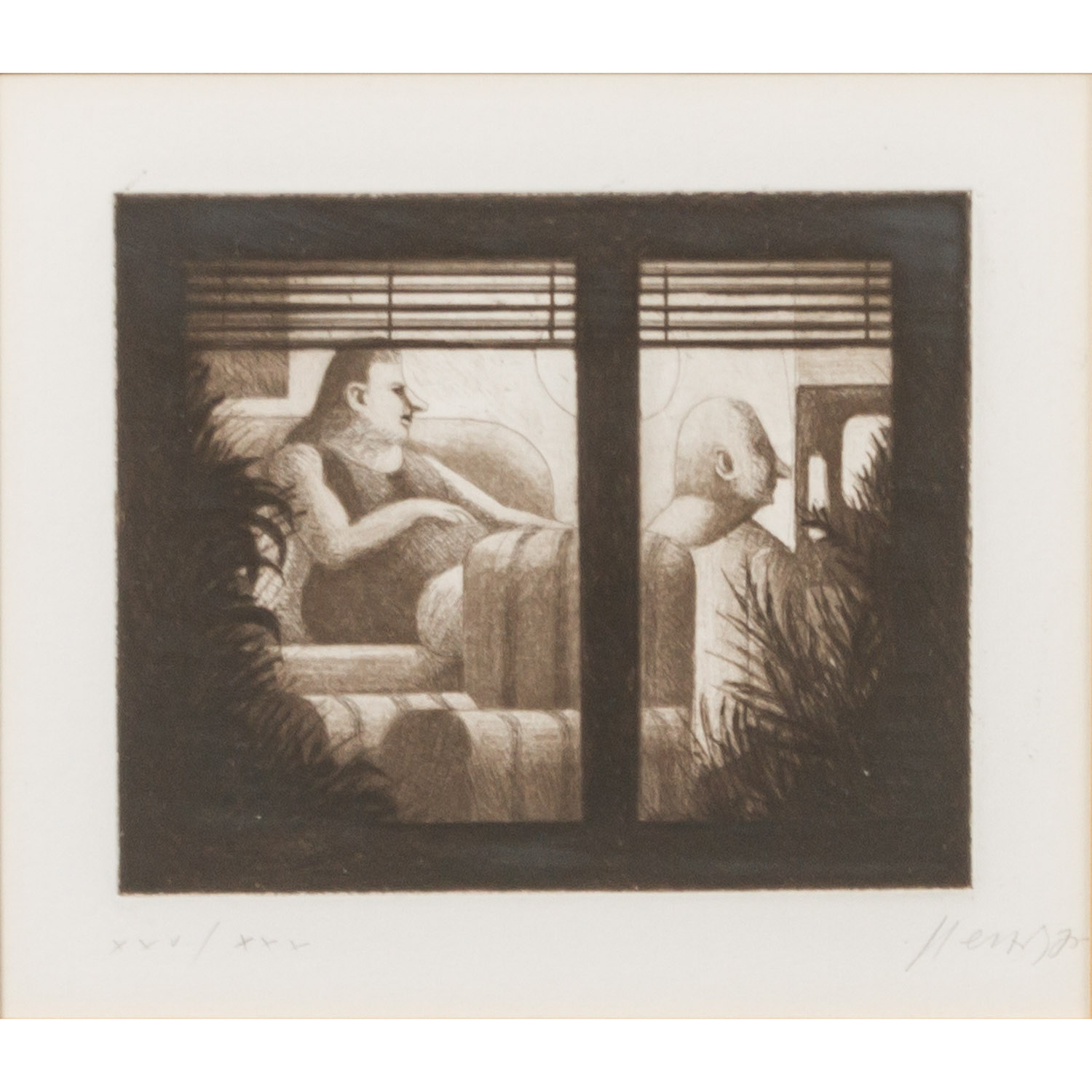 HERZIG, WOLFGANG (born 1941), 3 etchings, 1.) “The Cavalier”, numbered XXV/XXX in pencil by hand lower left, signed in pencil by hand lower right, etching, HxW: plate approx. 16.4x13.4 cm, mat opening approx. 21x18 cm, frame approx. 44.5x52 cm. 2.) ”Television”, numbered XXV/XXX in pencil by hand lower left, signed in pencil by hand lower right, etching, HxW: plate approx. 13.2x16.2 cm, mat opening approx. 18x21 cm, frame approx. 44.5x52 cm. 3) “The top hat man”, numbered E.d.A. XXV/XXX in pencil by hand lower left, signed in pencil by hand lower right, etching, HxW: plate ca. 15.9x13.4 cm, mat opening ca. 21x18 cm, frame ca. 44.5x52 cm. Each with traces of age and rubbing, browned. Each framed behind glass in passepartout (traces of age and rubbing).