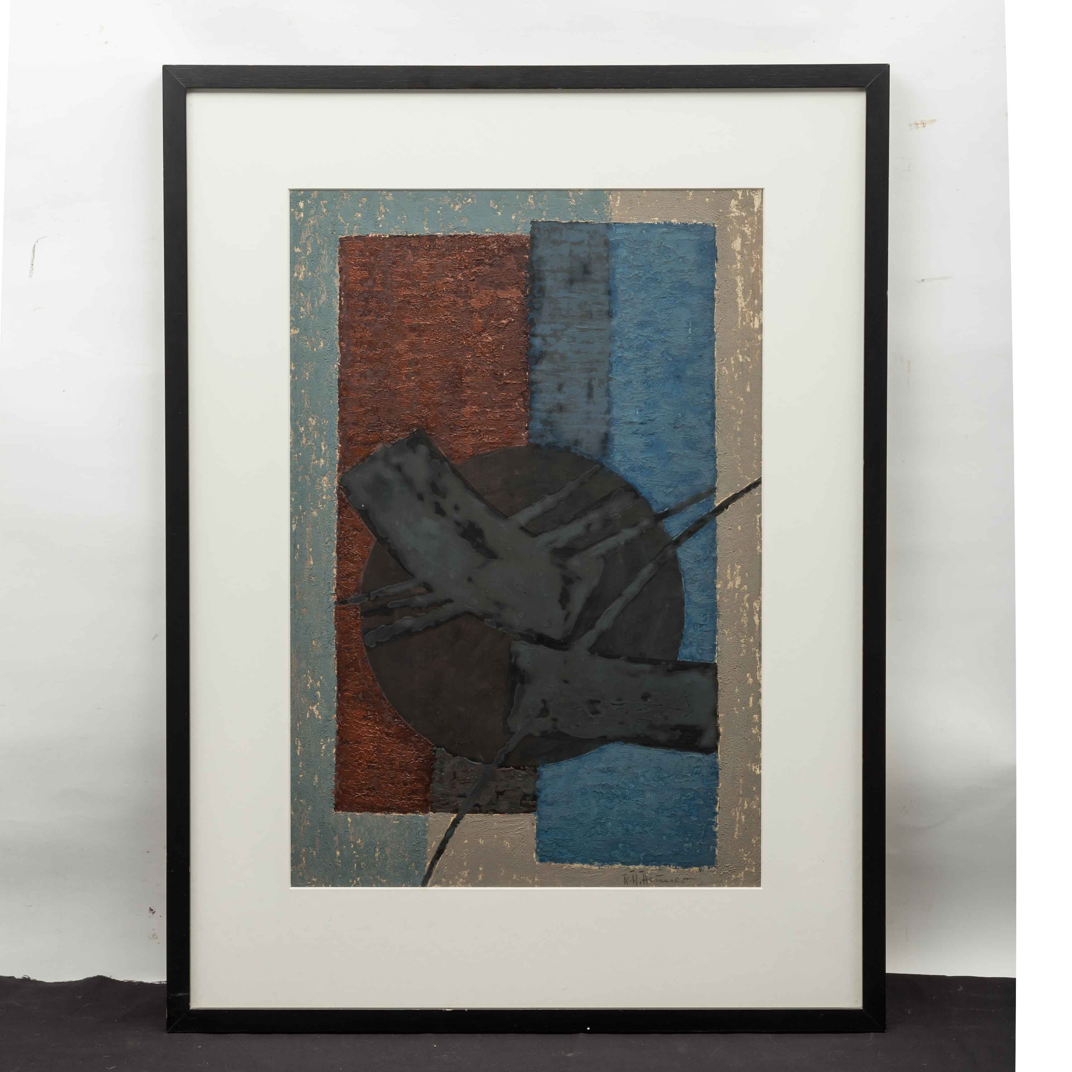 HEUNER, KARL HEINZ (1914-1982), "Geheimnisvolles Schwarz", abstract composition with a black-toned center in front of blue and brown colored areas, u.re. signed, mixed media, HxW: mat section approx. 59.5x40 cm (82.5x61 cm with frame). Framed behind glass in passepartout. Signs of age. Verso box with handwritten title and label Kunsthaus Schaller, Stuttgart.