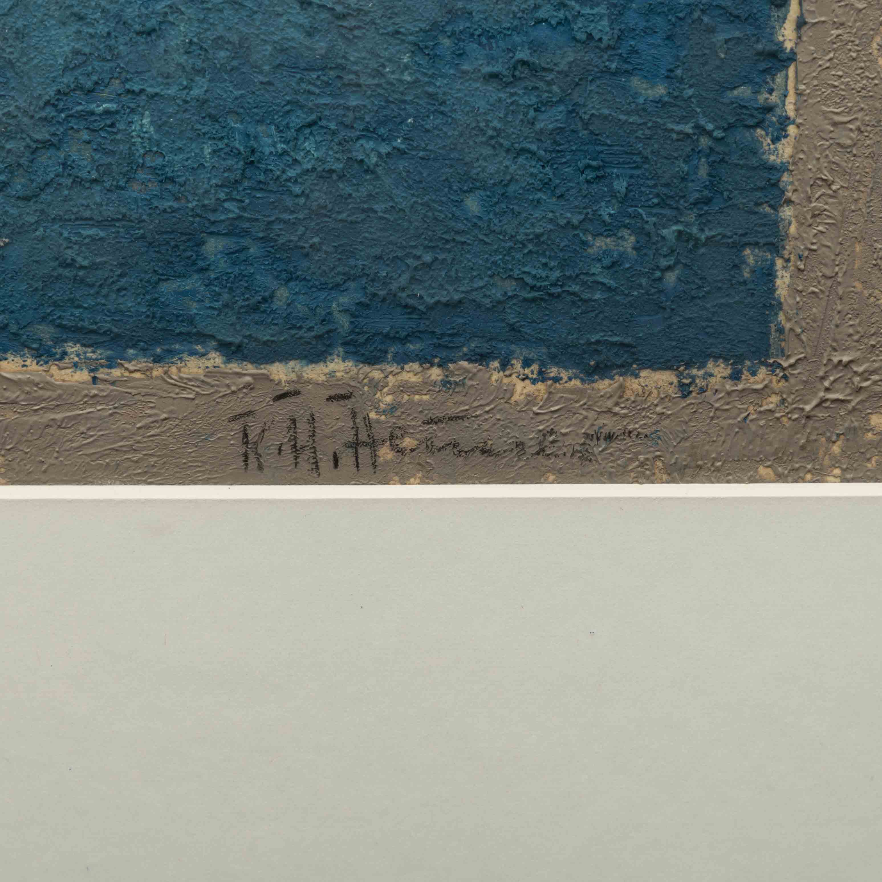 HEUNER, KARL HEINZ (1914-1982), "Geheimnisvolles Schwarz", abstract composition with black-toned center in front of blue and brown-toned color areas, signed lower right, mixed media, HxW: mat opening approx. 59.5x40 cm (82.5x61 cm with frame). Framed behind glass in passepartout. Traces of age. Verso card with handwritten title and label Kunsthaus Schaller, Stuttgart.