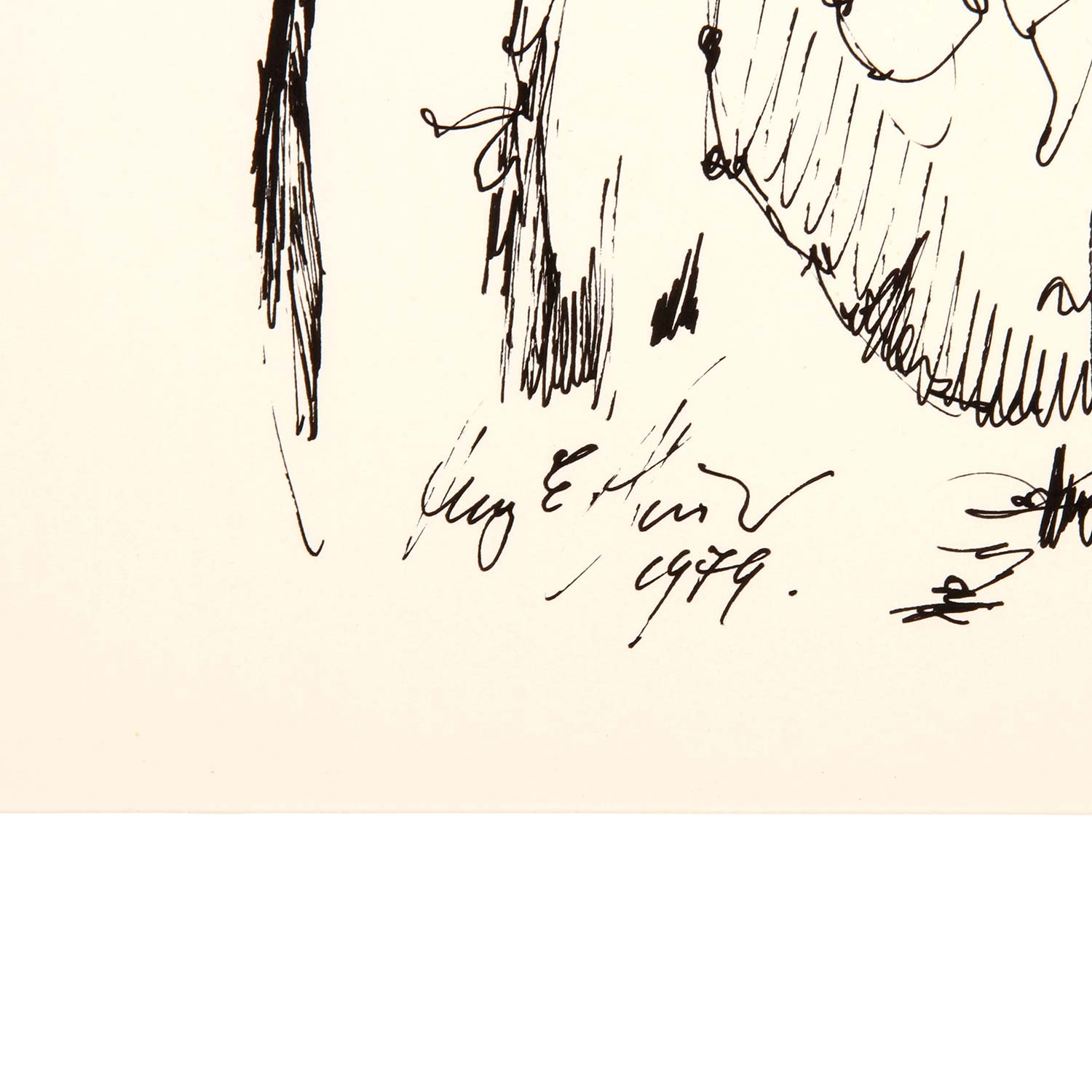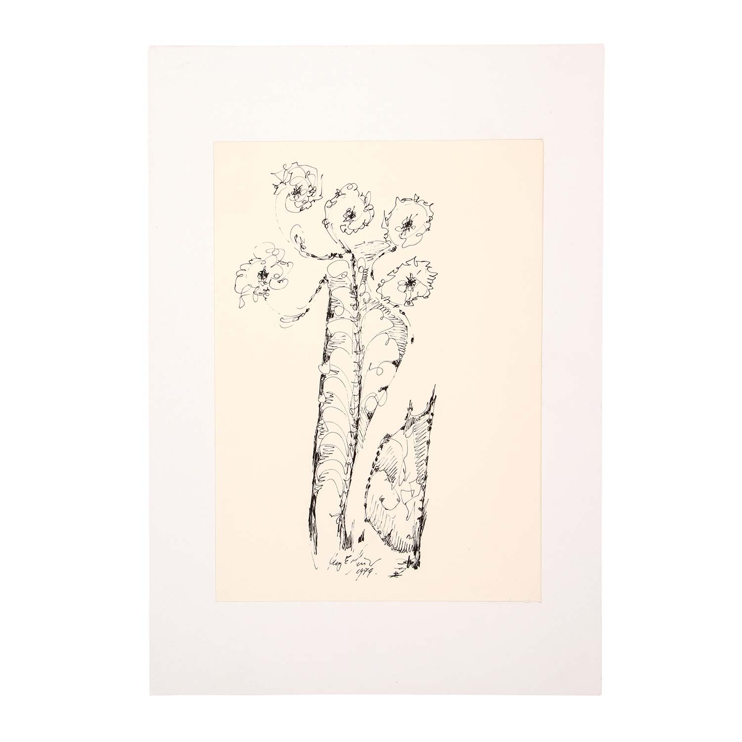 HIRSCHER, HEINZ E. (1927-2011), "Blumenranke", sign. a. dat. 1979, upper right paper dry stamp 'SCHOELLER', pen and ink drawing on paper, ca. 31x22 cm, mat opening ca. 29,5x21 cm. Min. browned a. light-stain.