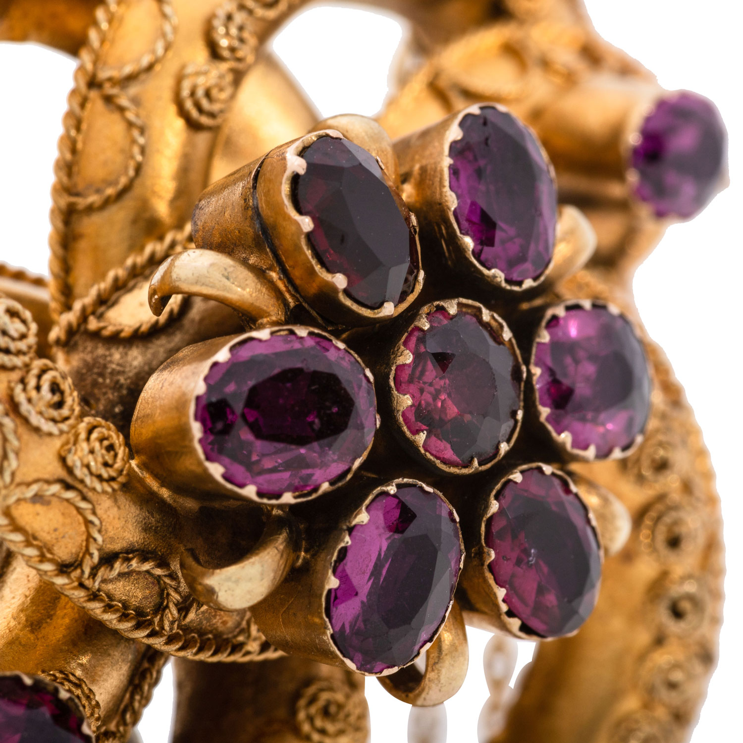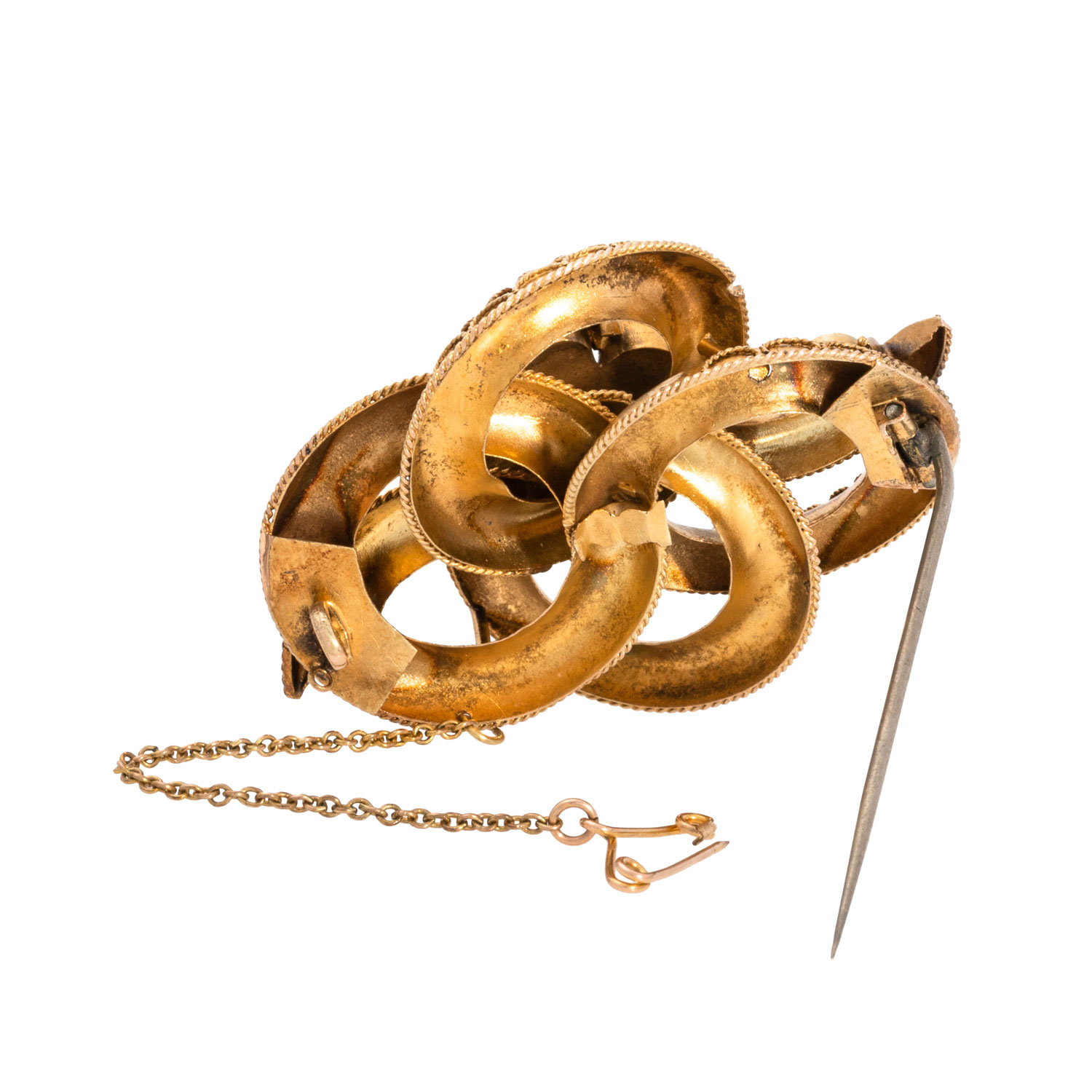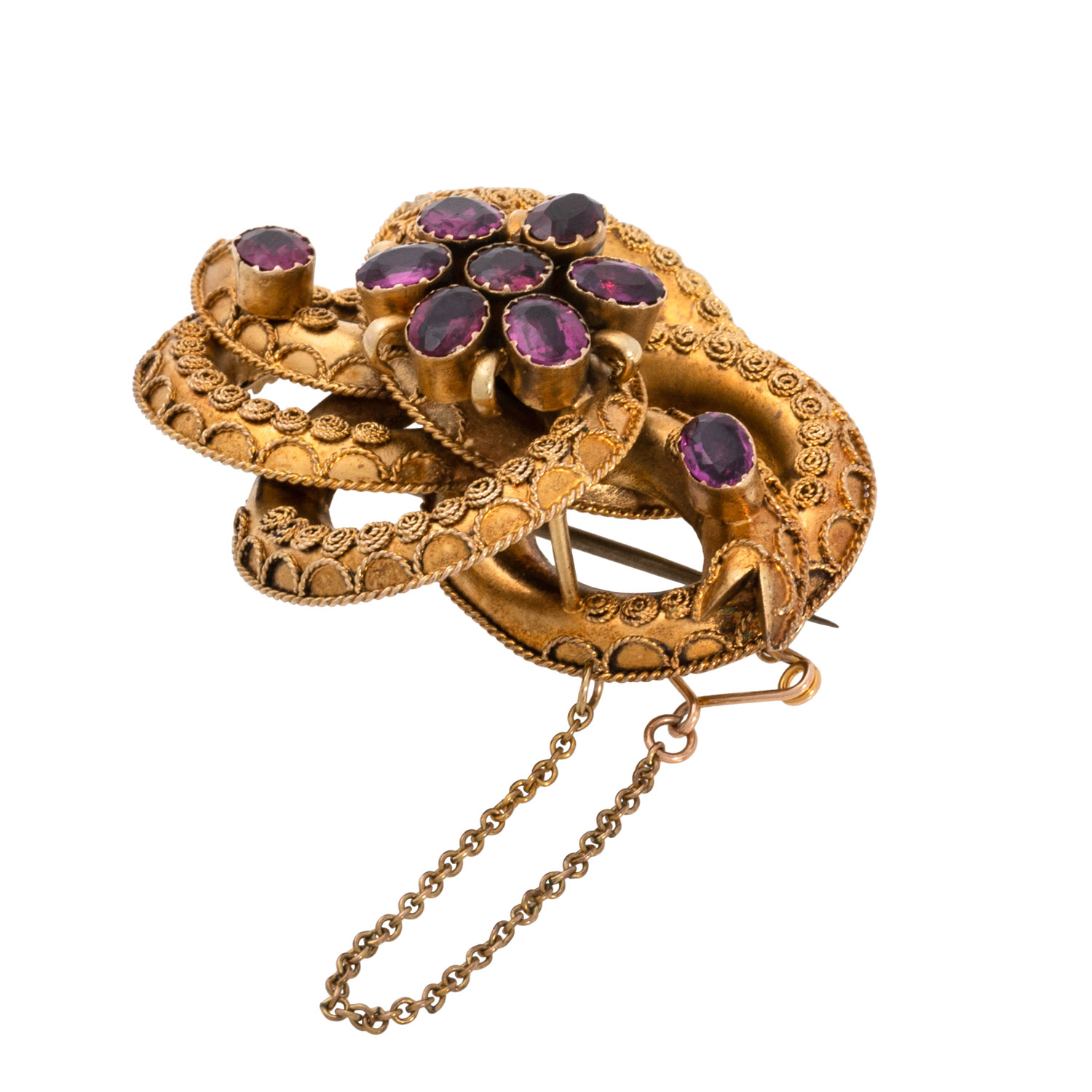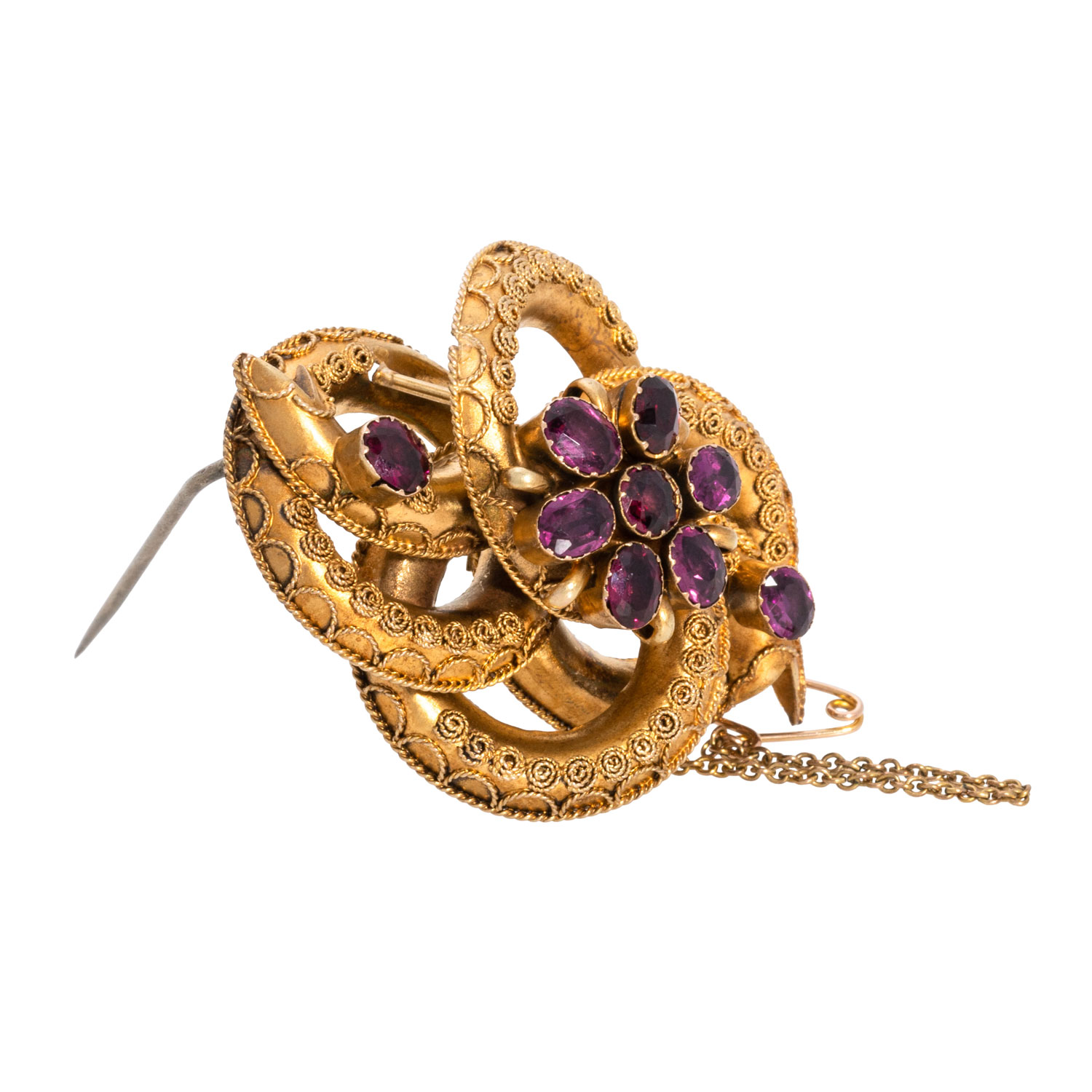 Historic bow brooch: intertwined ribbons, with wire decorations, set with 9 foiled garnets, YG 14K, fire gilded, needle base metal, totall. 12.3 g, length: 5 cm. Second half of the 19th century, condition according to age, garnets with some abraded facet edges, 1 solder joint loose. Safety chain and safety pin. Typical example for the time.