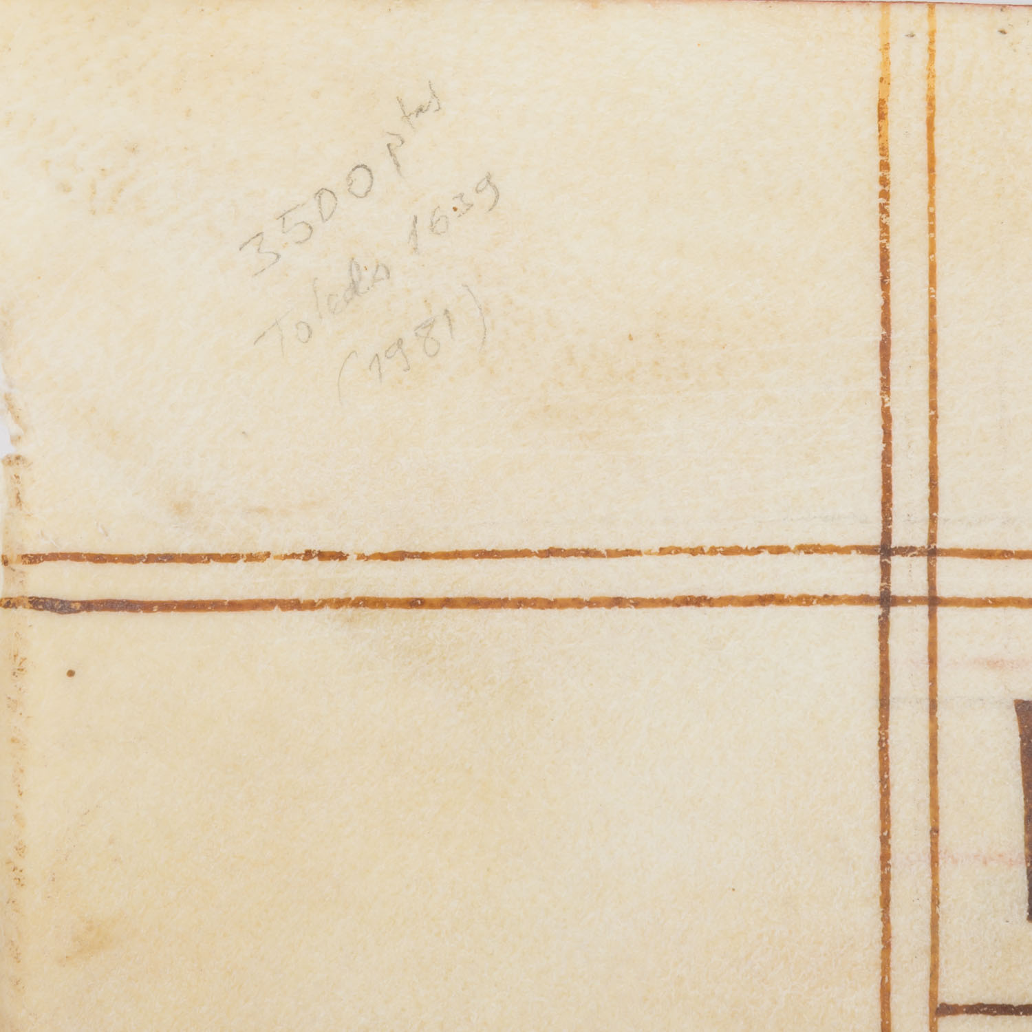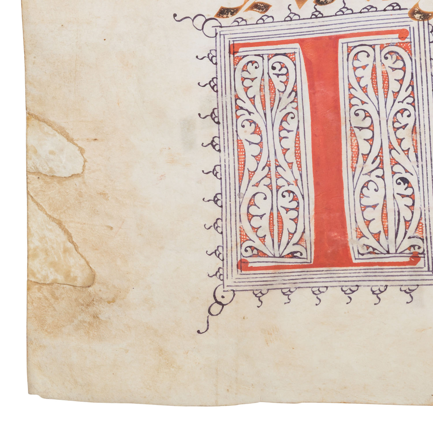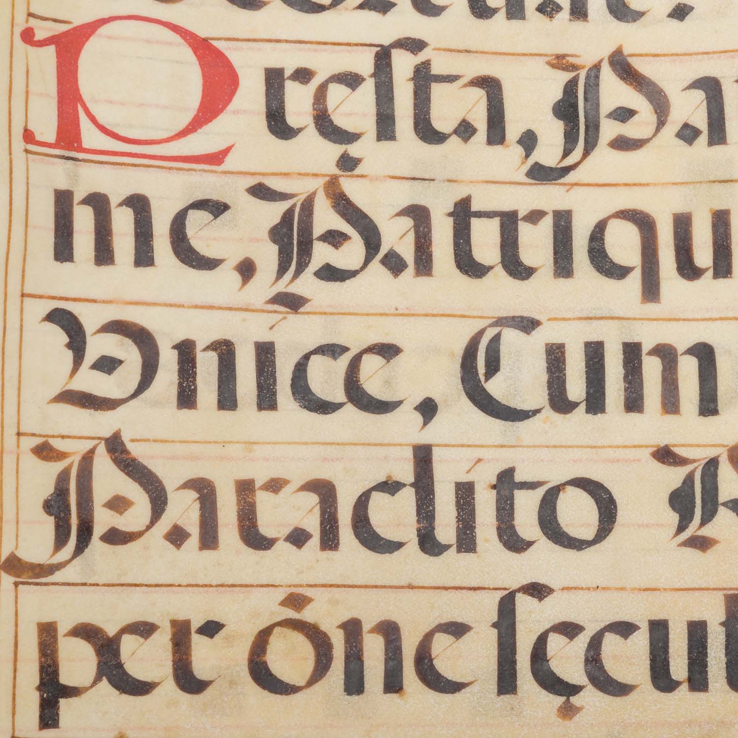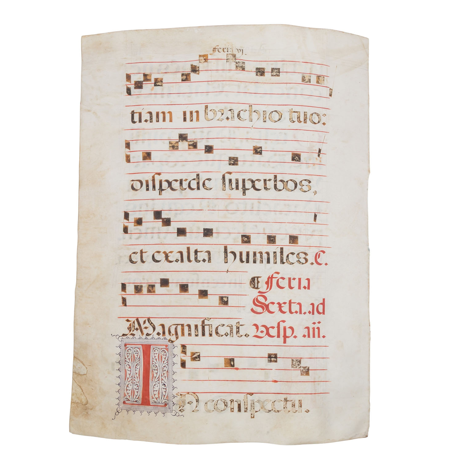 Historical sheet of notation 'Ad Vesperas'- Restored page of a section of the evening prayer, from an aniphonal manuscript, with decorated initials, probably Spain, 17th century, hxw approx. 53 x 40.5 cm, with stains, restored, edges with tears and creases, with traces of age and use.