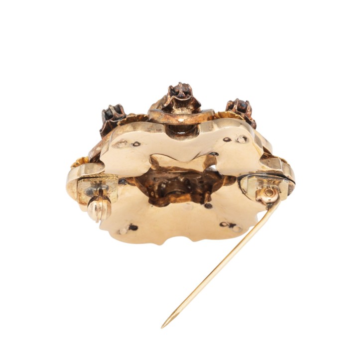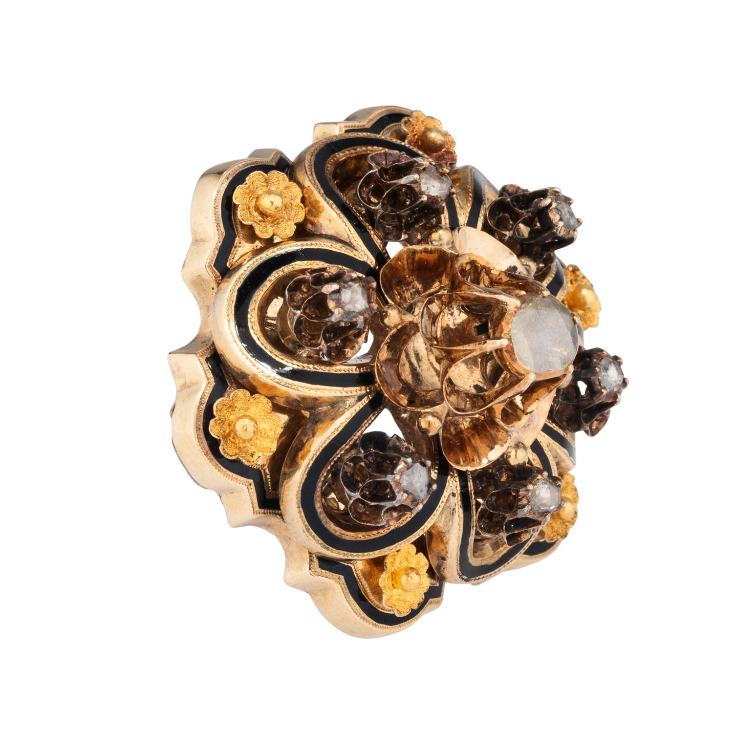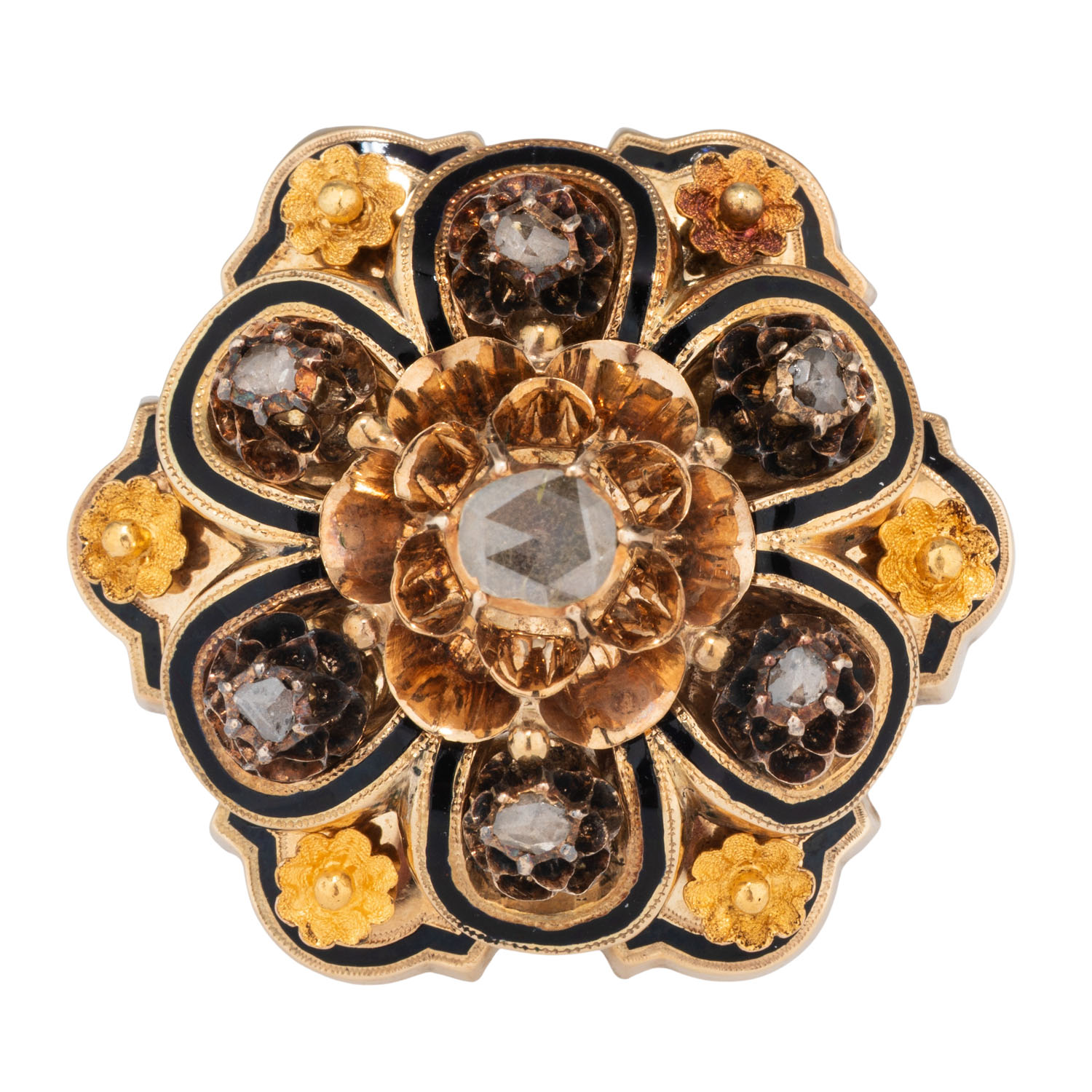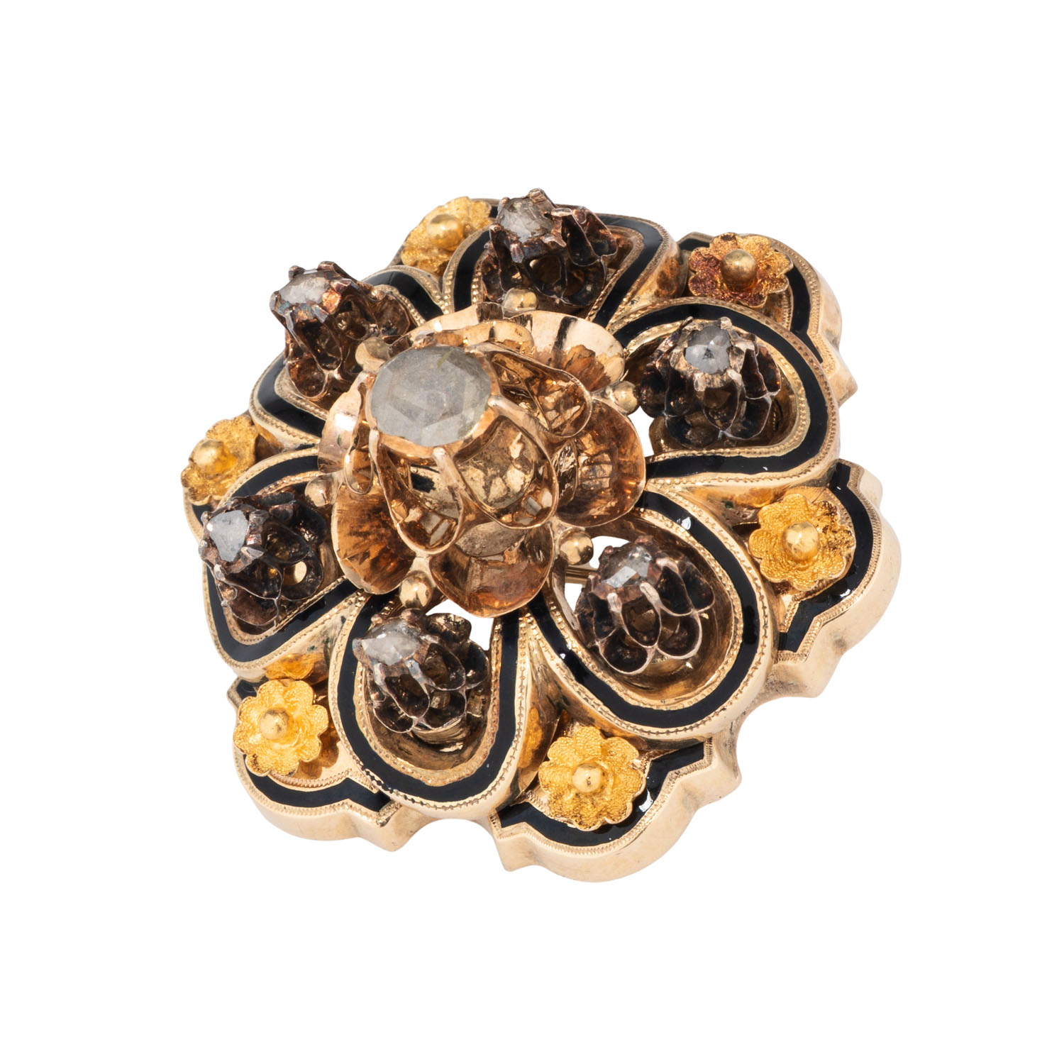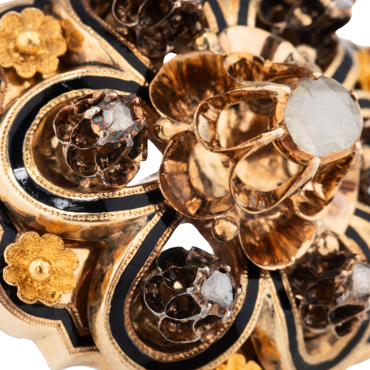 Historism brooch set with 7 rose - cut diamonds, closed at the bottom and foiled, black enamel details, fine floral appliqué, 14K YG, 18.2 g, 2nd half of 19th century, good condition, diamonds minmally chipped.