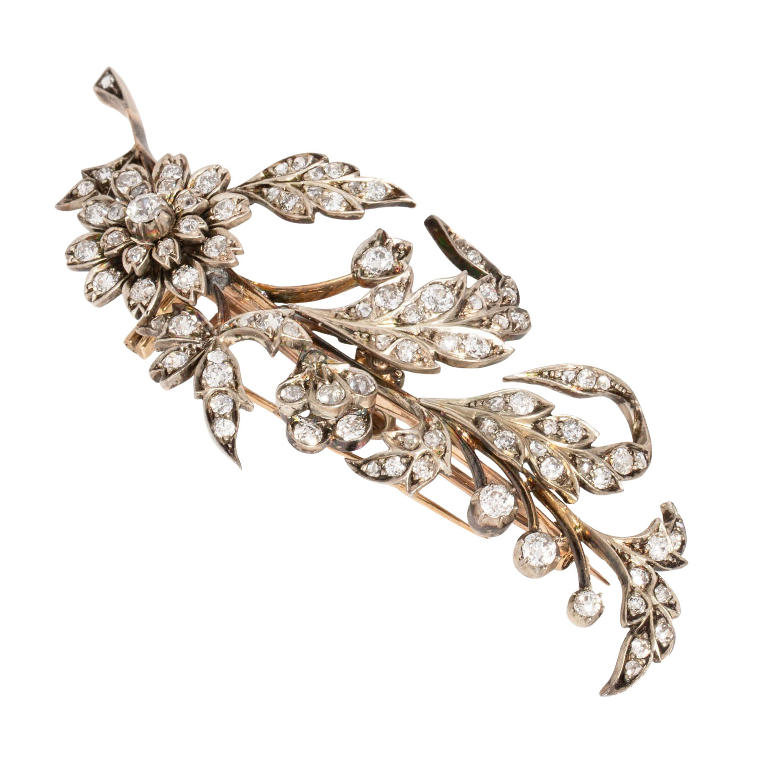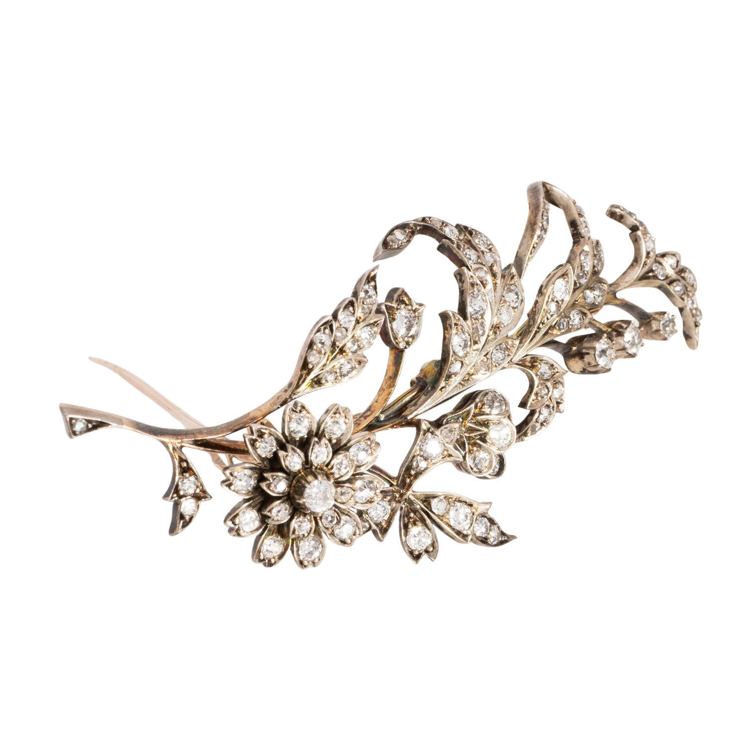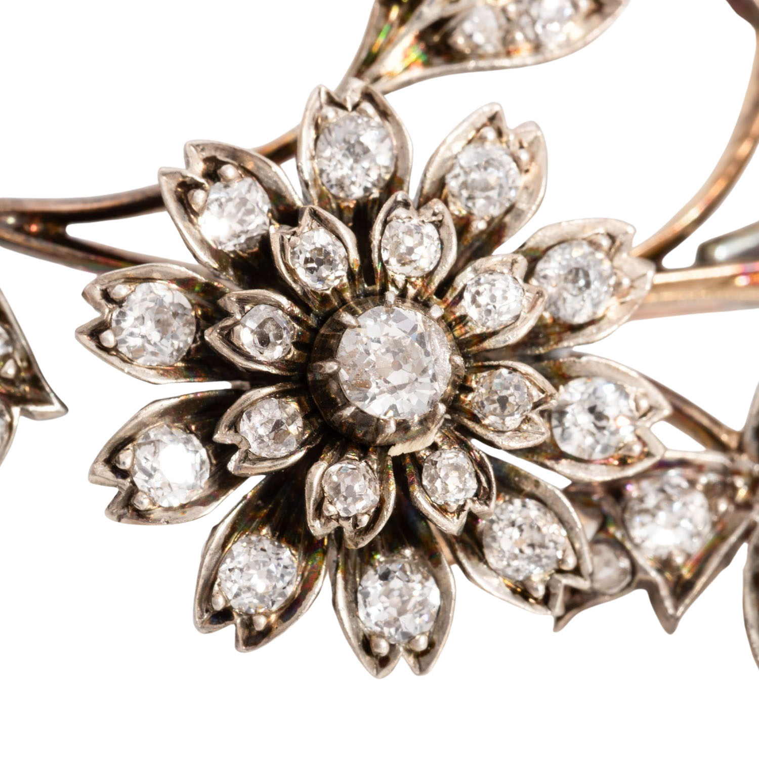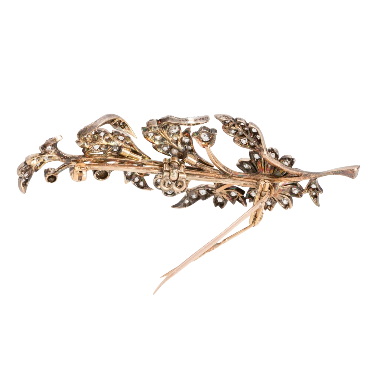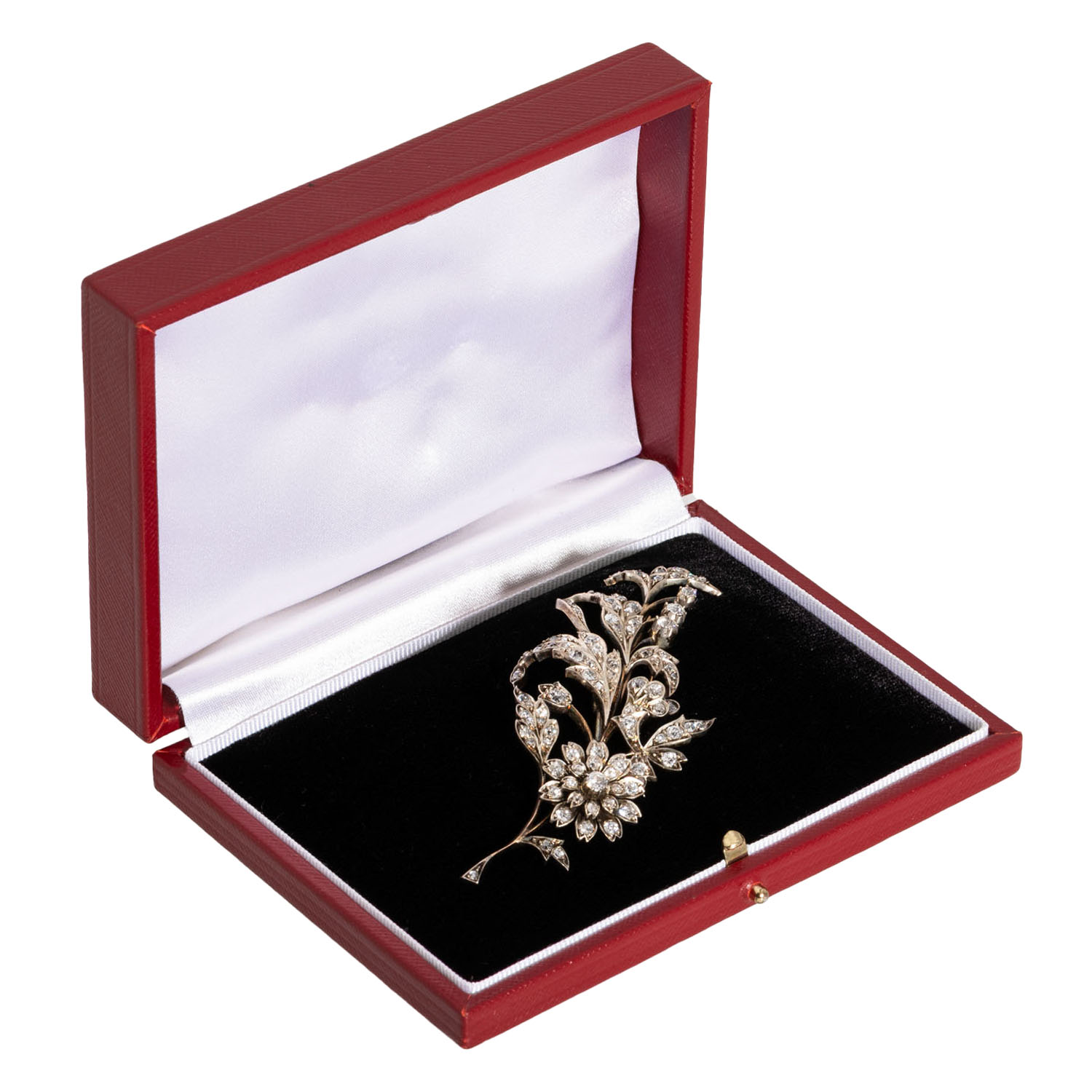 Historicism brooch with old-cut diamonds totalling ca. 4-5 ct, qualities typical for its age, 8K RG, face side silver, 23 g, L: ca. 8.5 cm, 2nd half 19th century, good age-related unrestored original condition, needle can be detached. Incl. case (new-age).