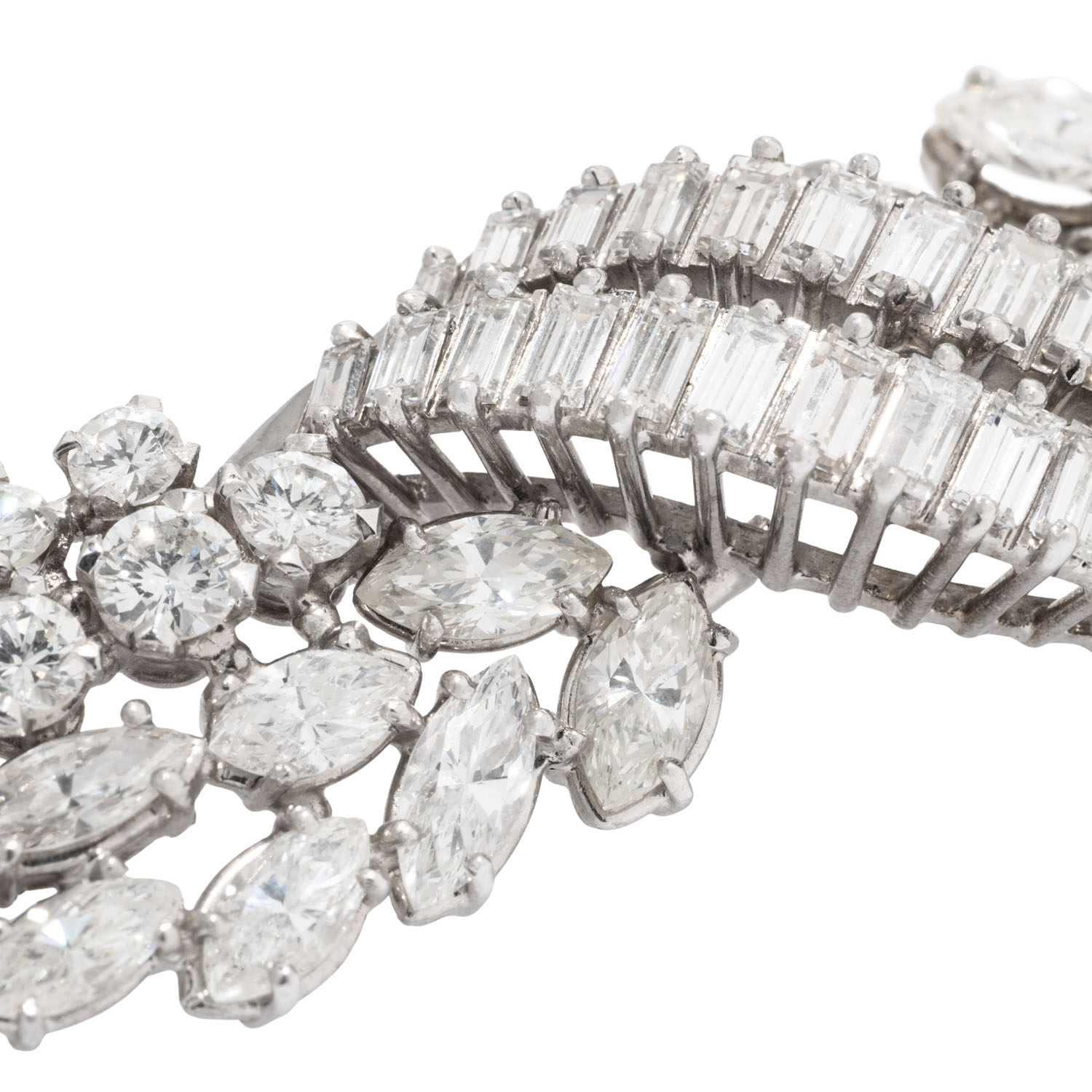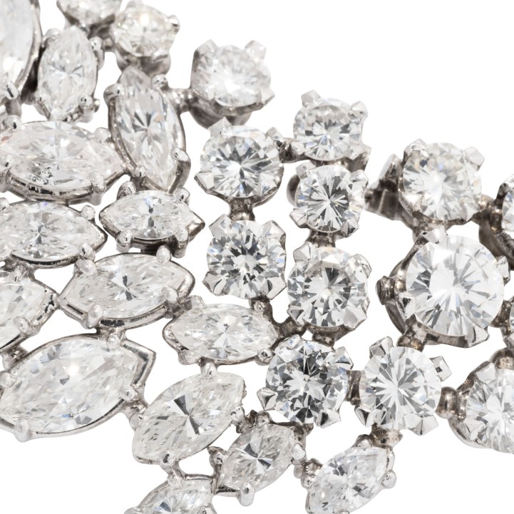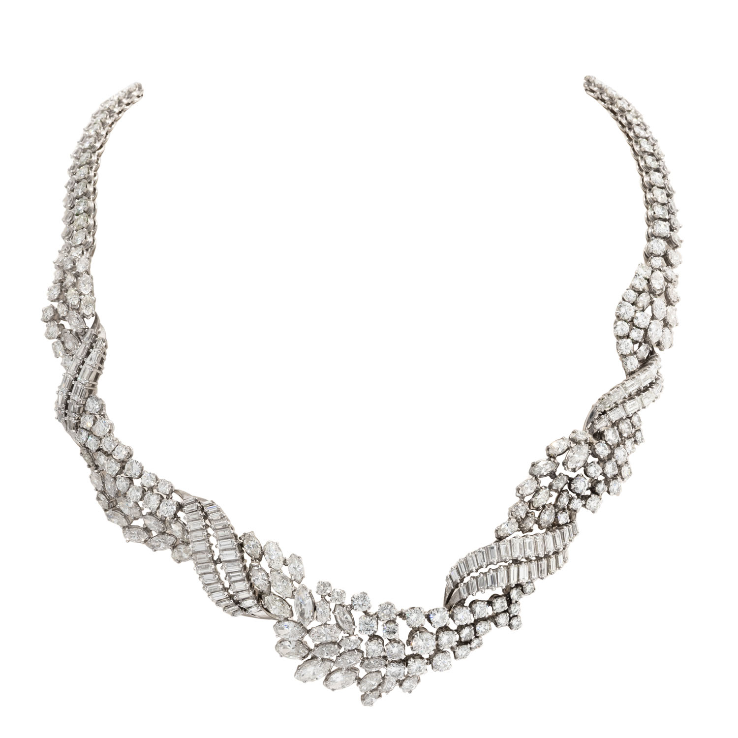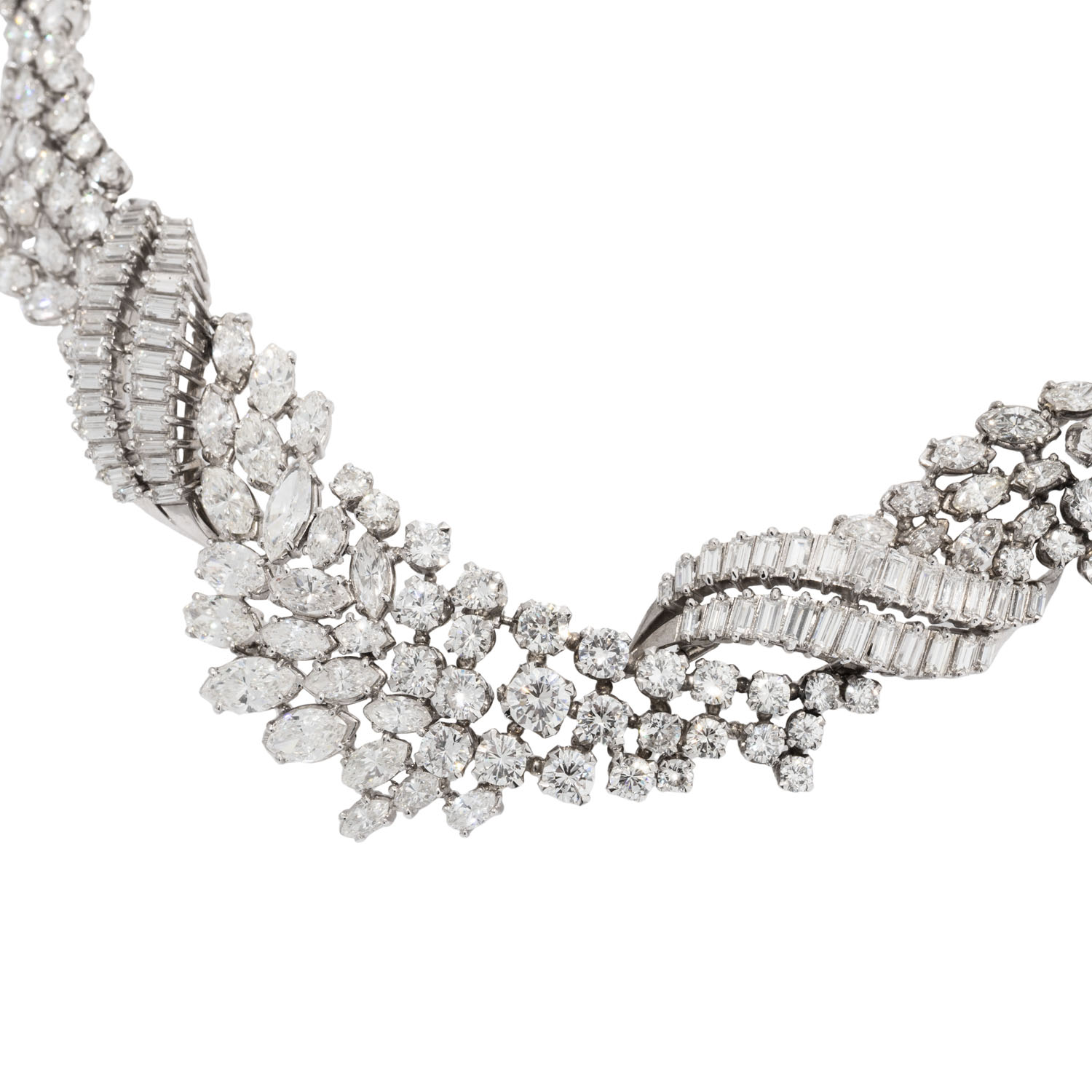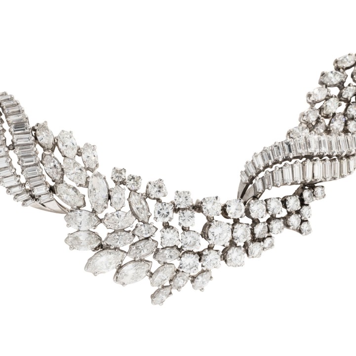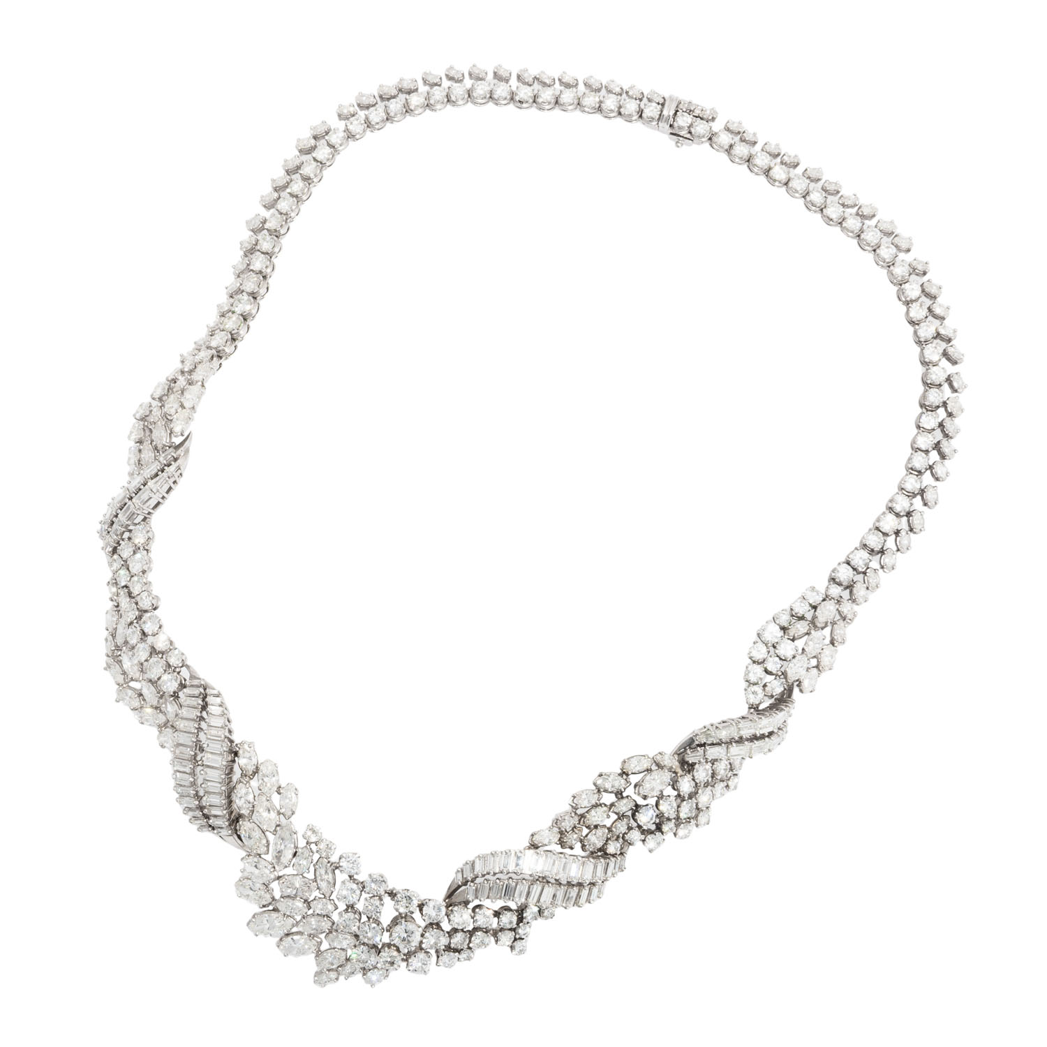 Important Necklace with 300 diamonds in 104 brilliant, 118 navette and 78 baguette cuts totalling ca. 43.0 ct, RW-STW (G-J)/ VS-SI, platinum, 95.9 g, L: 42 cm, 20th century, good condition. Best jeweller quality. Jeweller's certificate included.