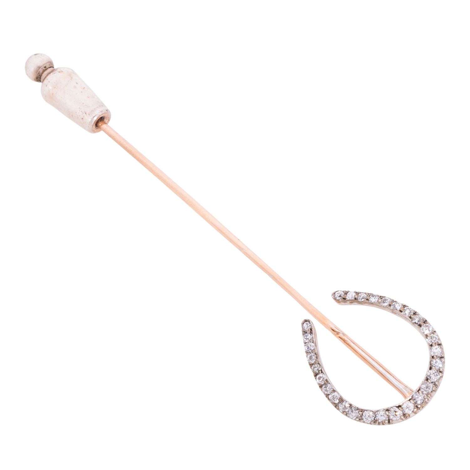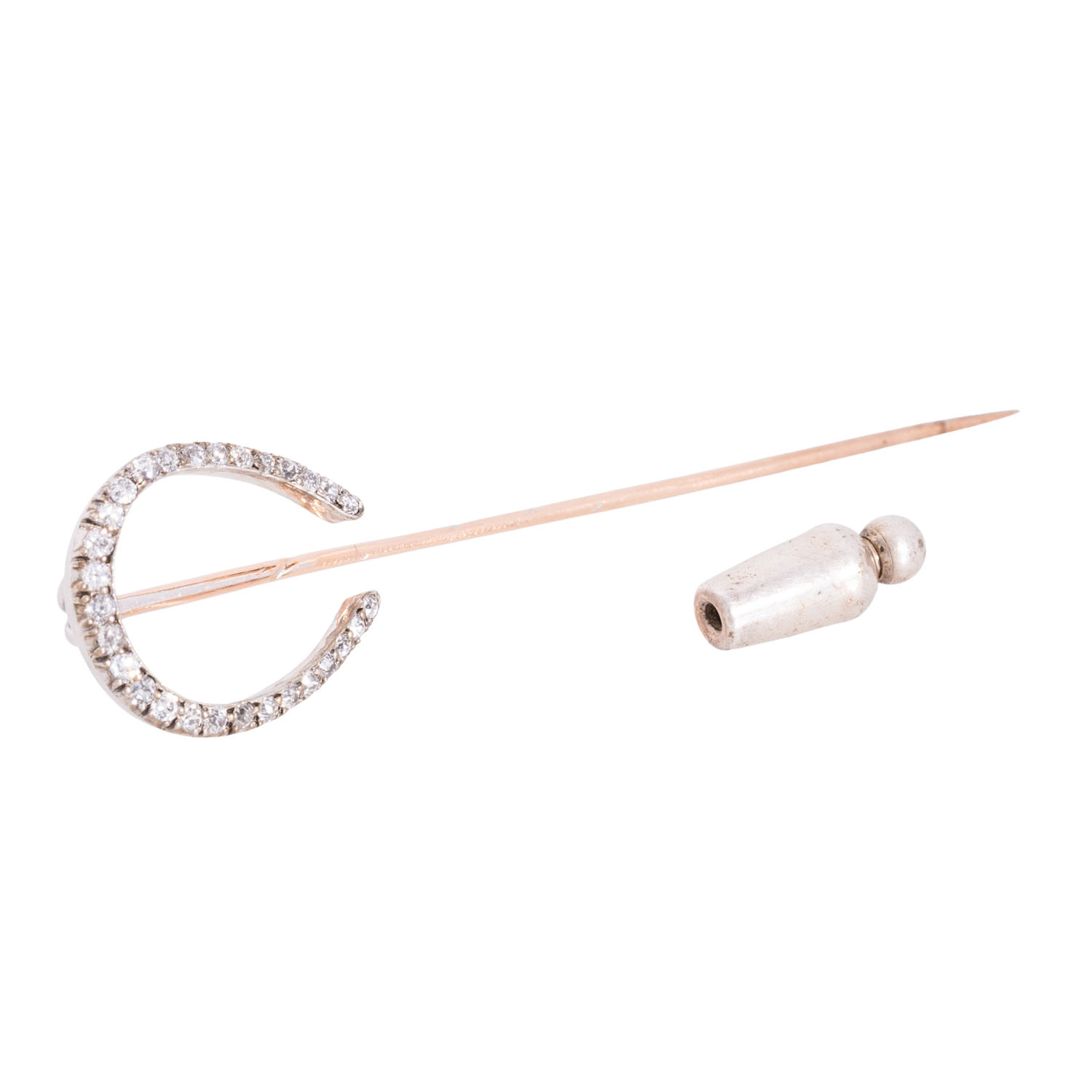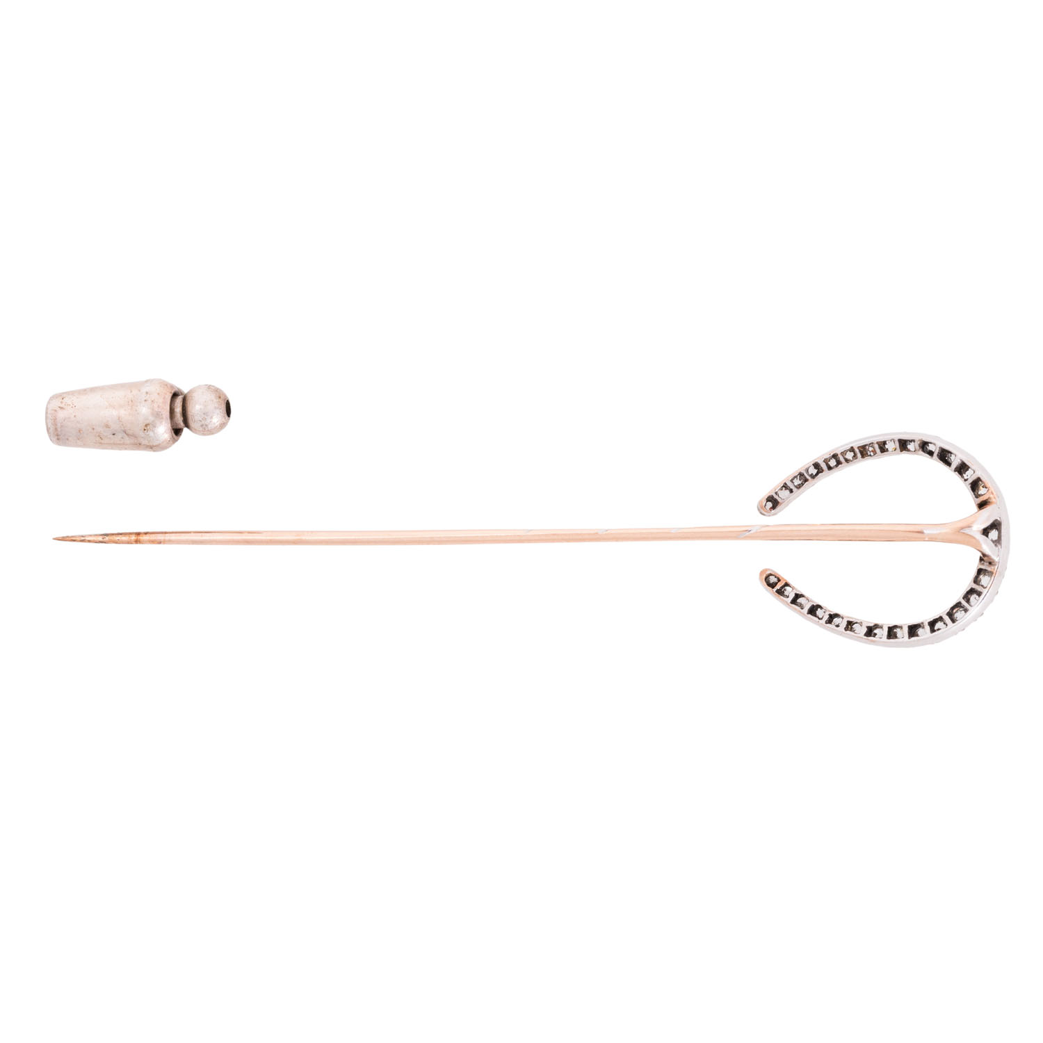Needle 'Horseshoe' of old-european-cut diamonds totalling ca. 0.3 ct, good colour and clarity, set in silver, mounted on 14K white gold, needle of 14K red gold, 2.3 g, L: 7.5 cm, safety part of metal, 19th/20th century, age-relating nice condition.
