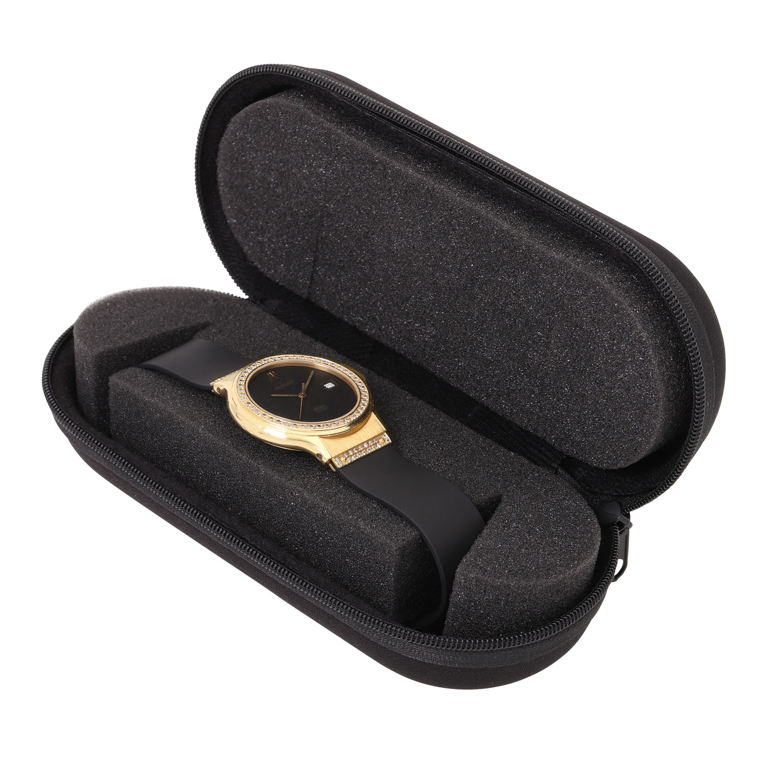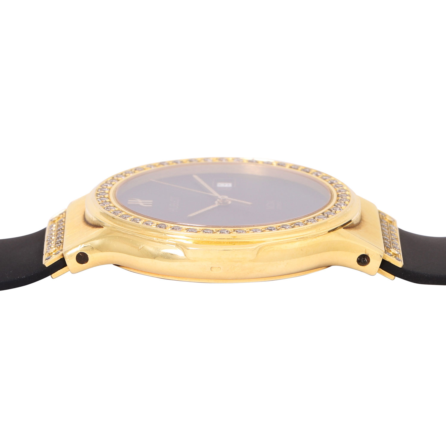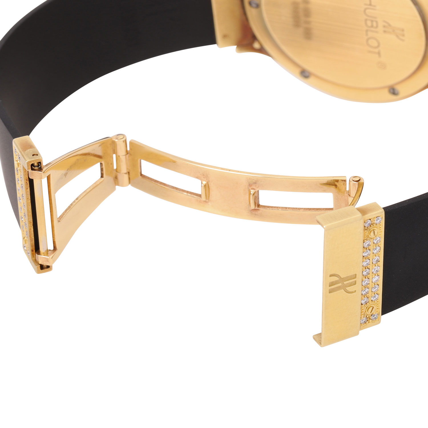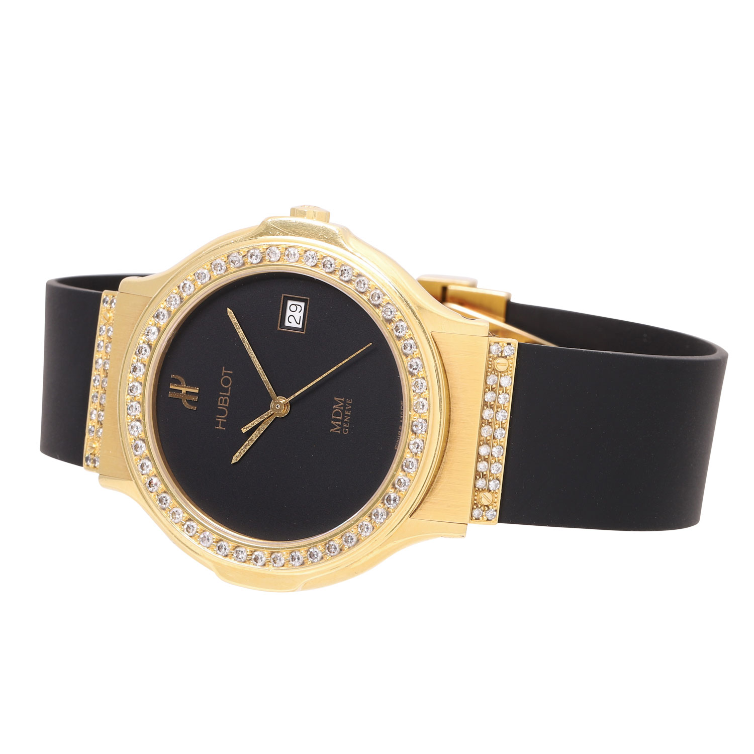 HUBLOT Classic MDM men´s wristwatch ref. 1520 with diamonds. 18K yellow gold, bezel and lugs set with diamonds. Rubber strap with gold butterfly clasp and diamond trimmings. Quartz movement with new battery, working condition. Black dial with date display. In good condition, slight signs of wear on the case. Wempe travel case included. Diameter approx. 36.5mm without crown. Suitable up to a wrist circumference of approx. 17.5 cm.