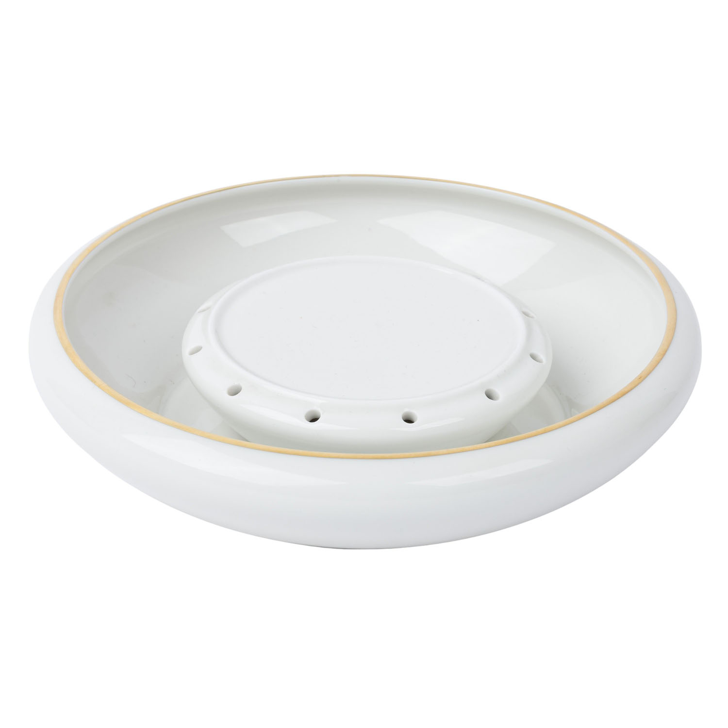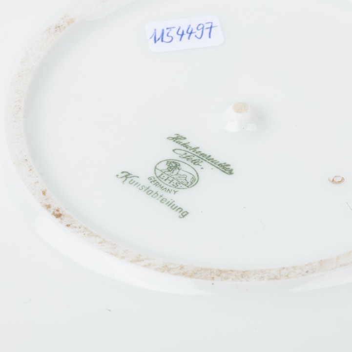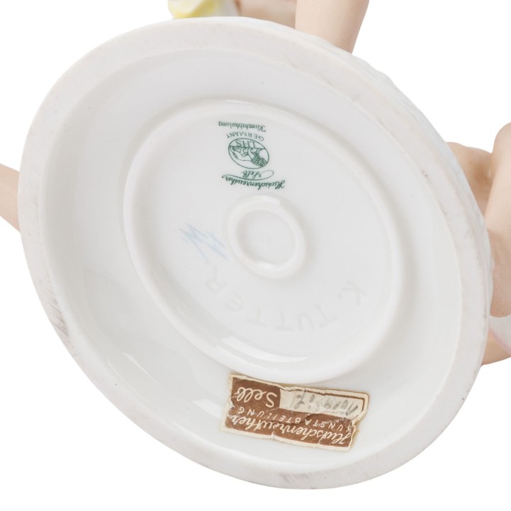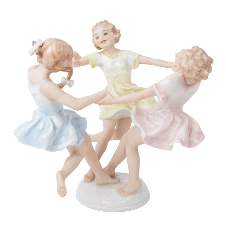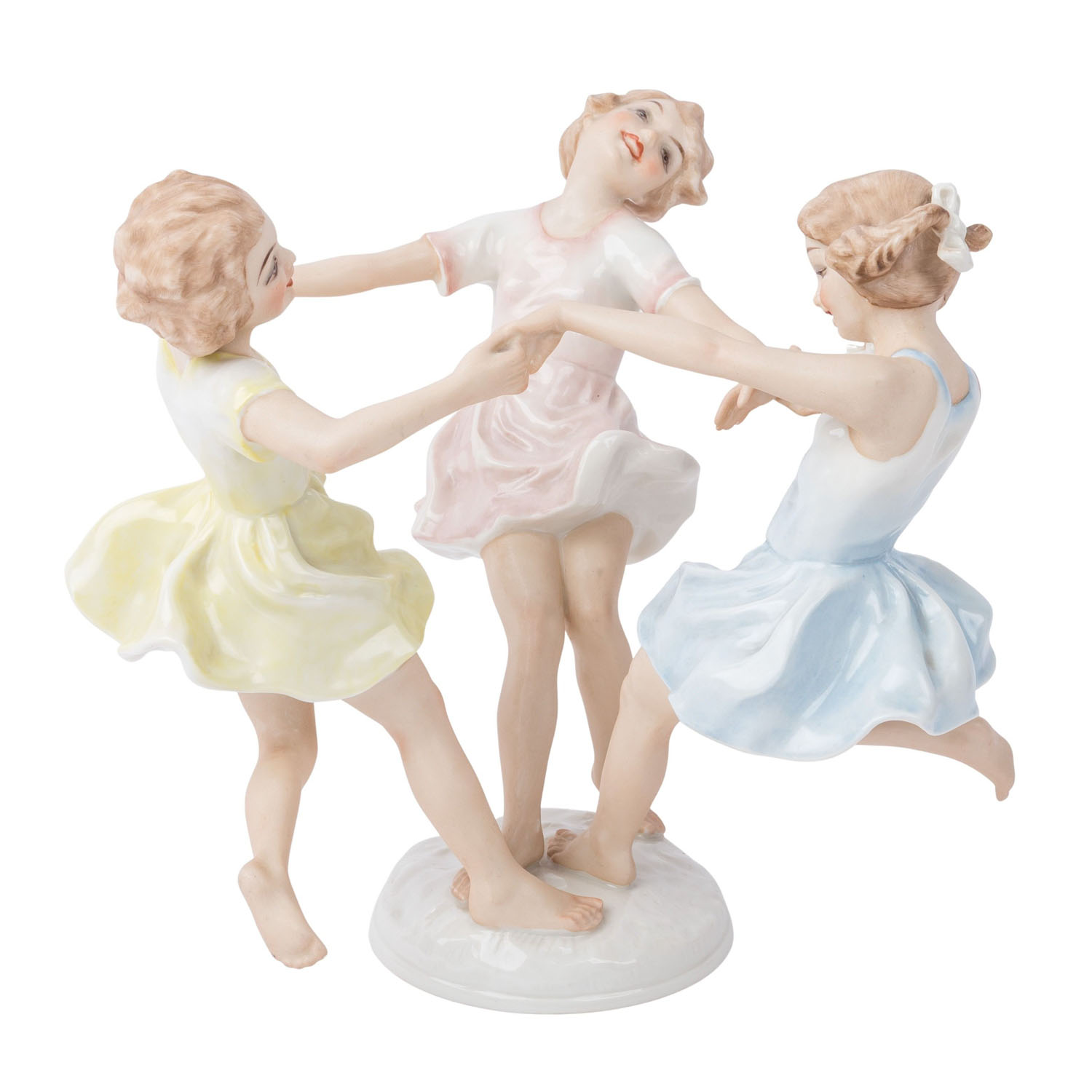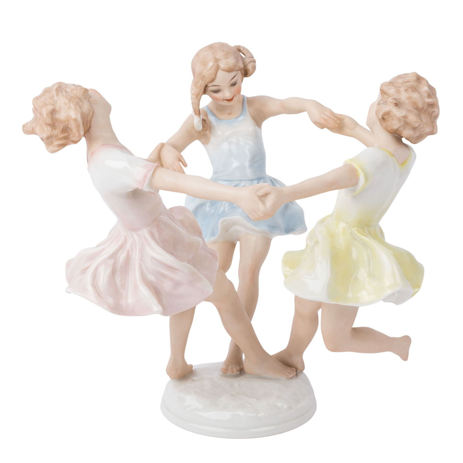 HUTSCHENREUTHER group of figures “May Dance” with bowl, second half of the 20th century. Cream-coloured porcelain, decorated in pastel colours, three dancing girls on a round base (height approx. 21.5 cm), designed by Karl Tutter in 1937, with original adhesive label, plus a matching flower bowl (diameter approx. 22.5 cm), green stamp marks. Signs of age.