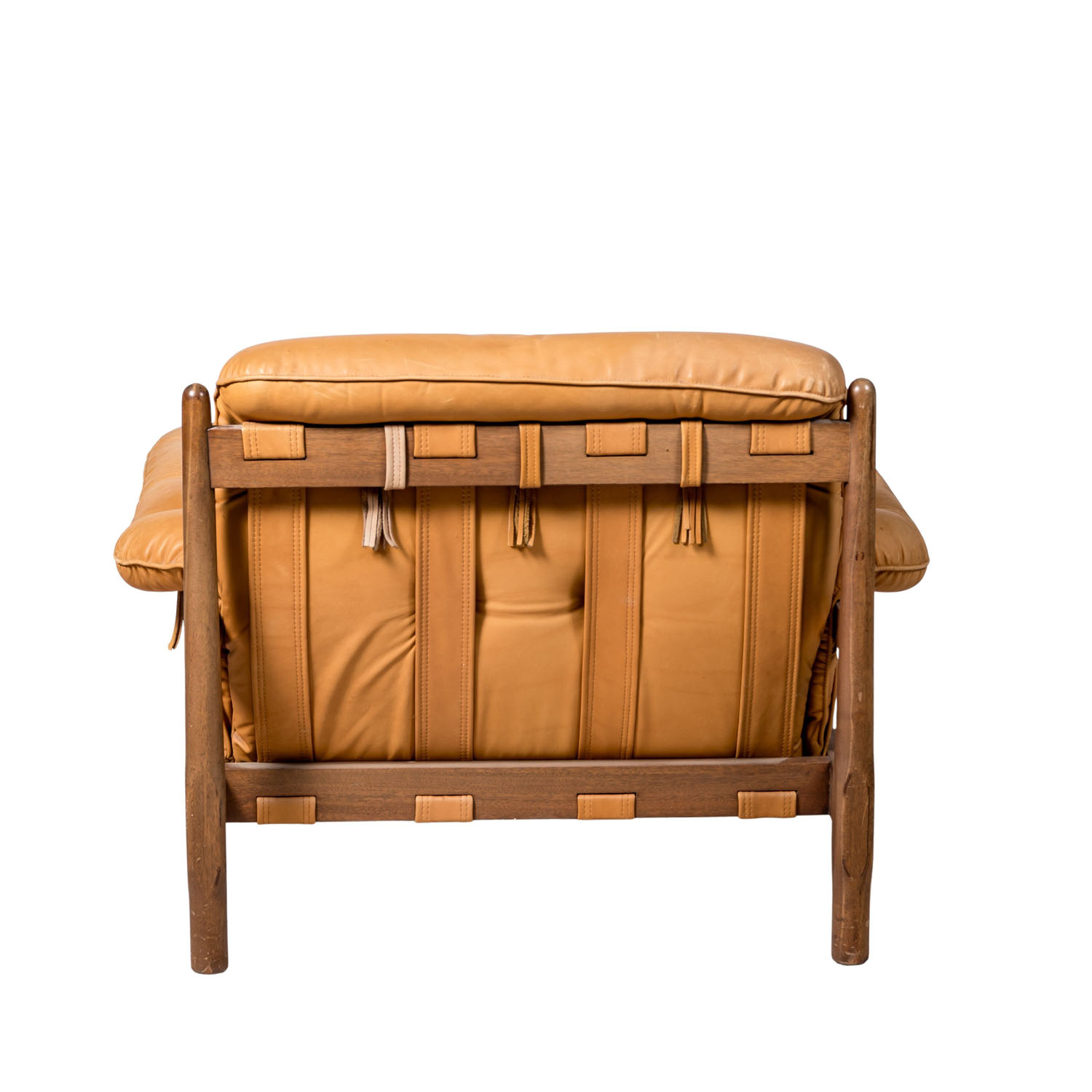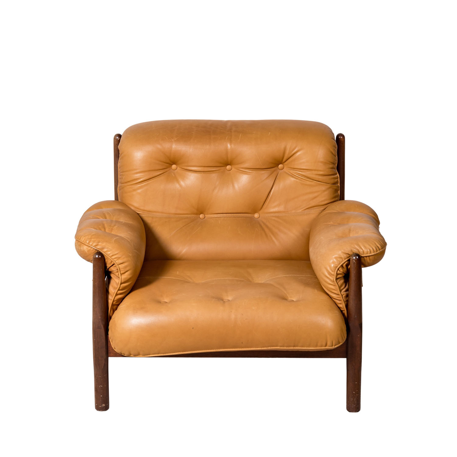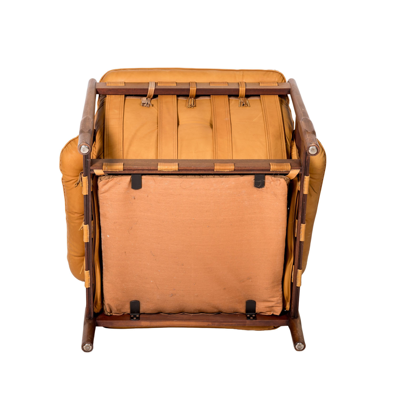Teak, partially organically shaped, frame with belt covering, upholstered cushions with caramel-colored leather cover, HxWxD: approx. 75/97/90 cm. Significant signs of age and use.