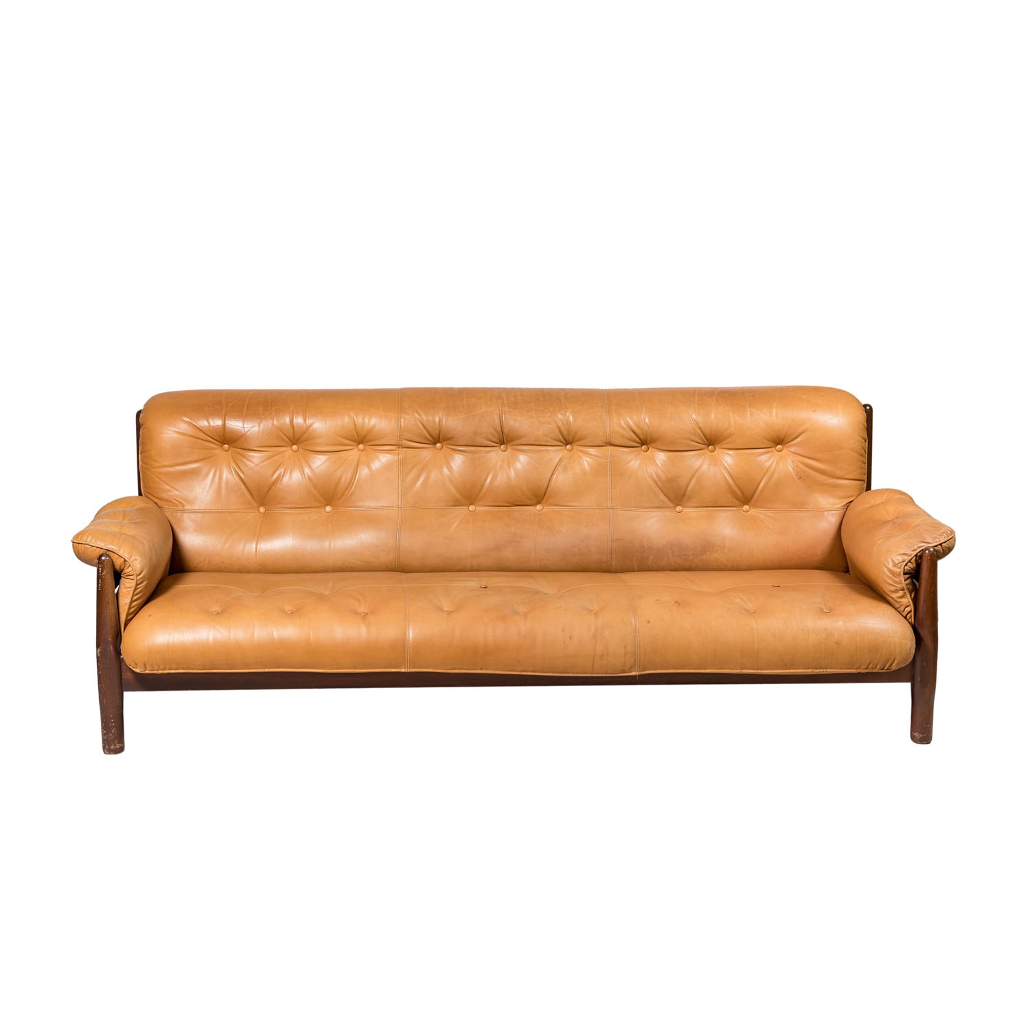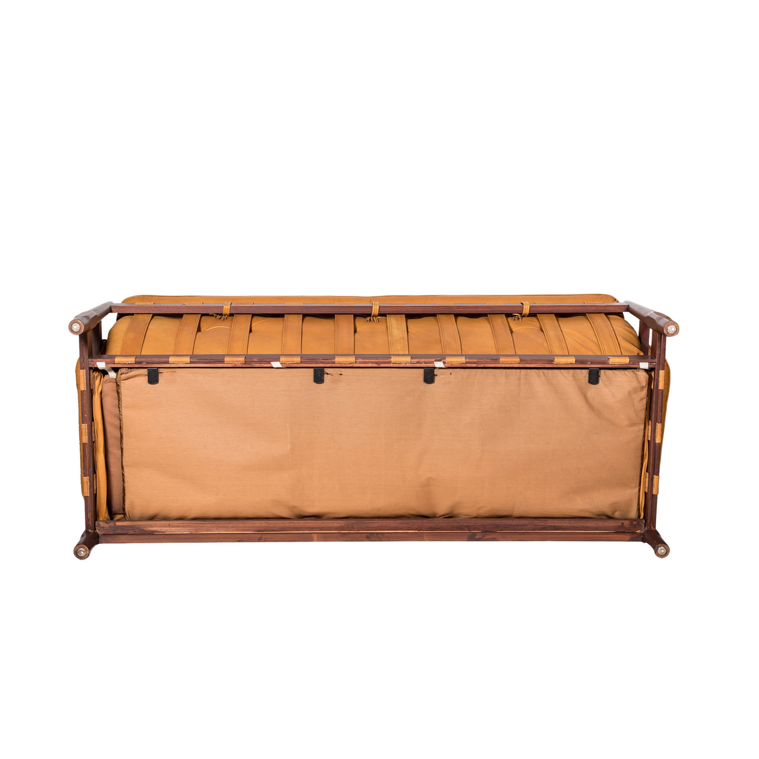 Teak, partially organically shaped, frame with belt covering, upholstered cushions with caramel-colored leather cover, HxWxD: approx. 75/210/90 cm. Significant signs of age and use.