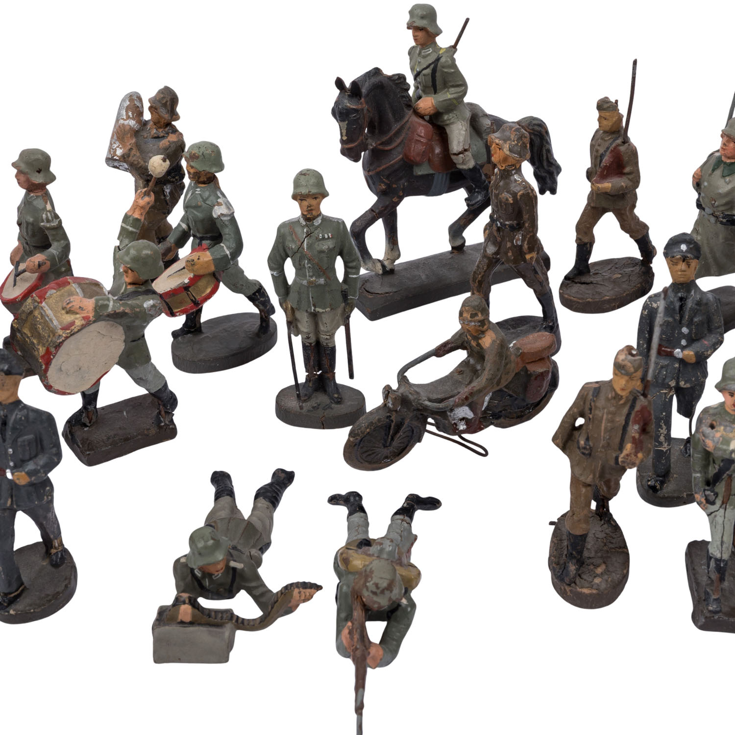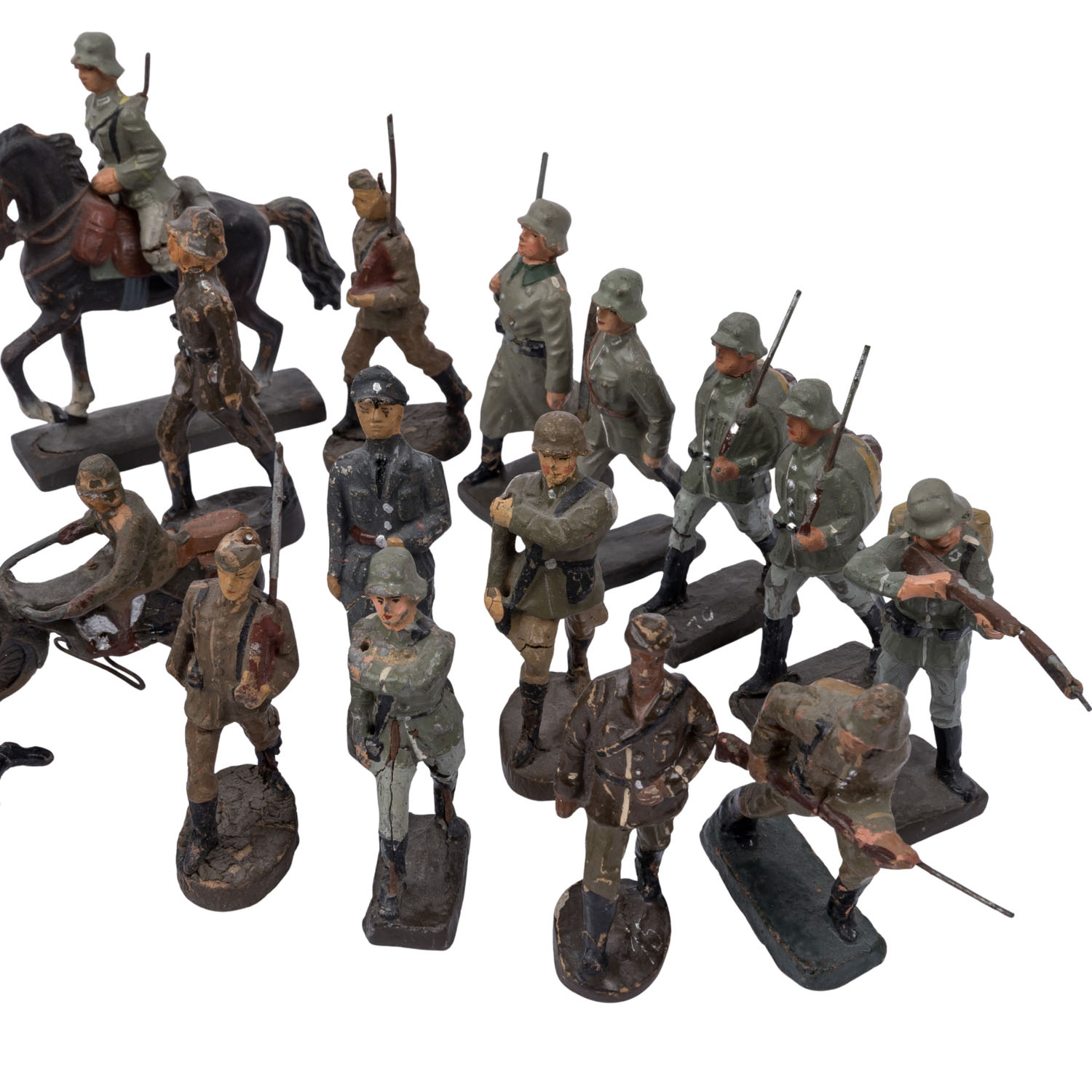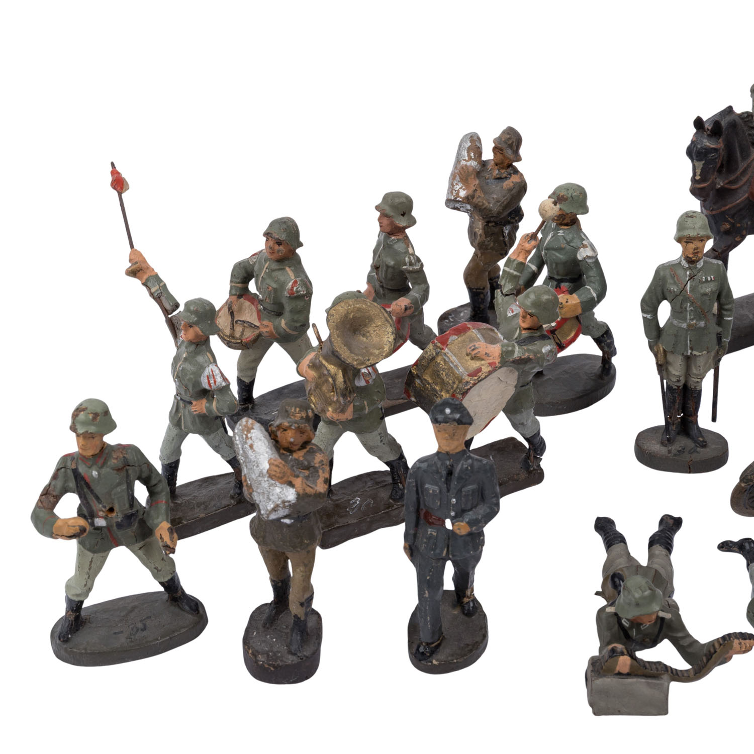 ELASTOLIN/LINEOL 28 soldiers, predominantly WW1, mostly marked, including musicians, infantry as well as 1 motorcyclist and 1 rider, mostly dam. H 3 - 10 cm.